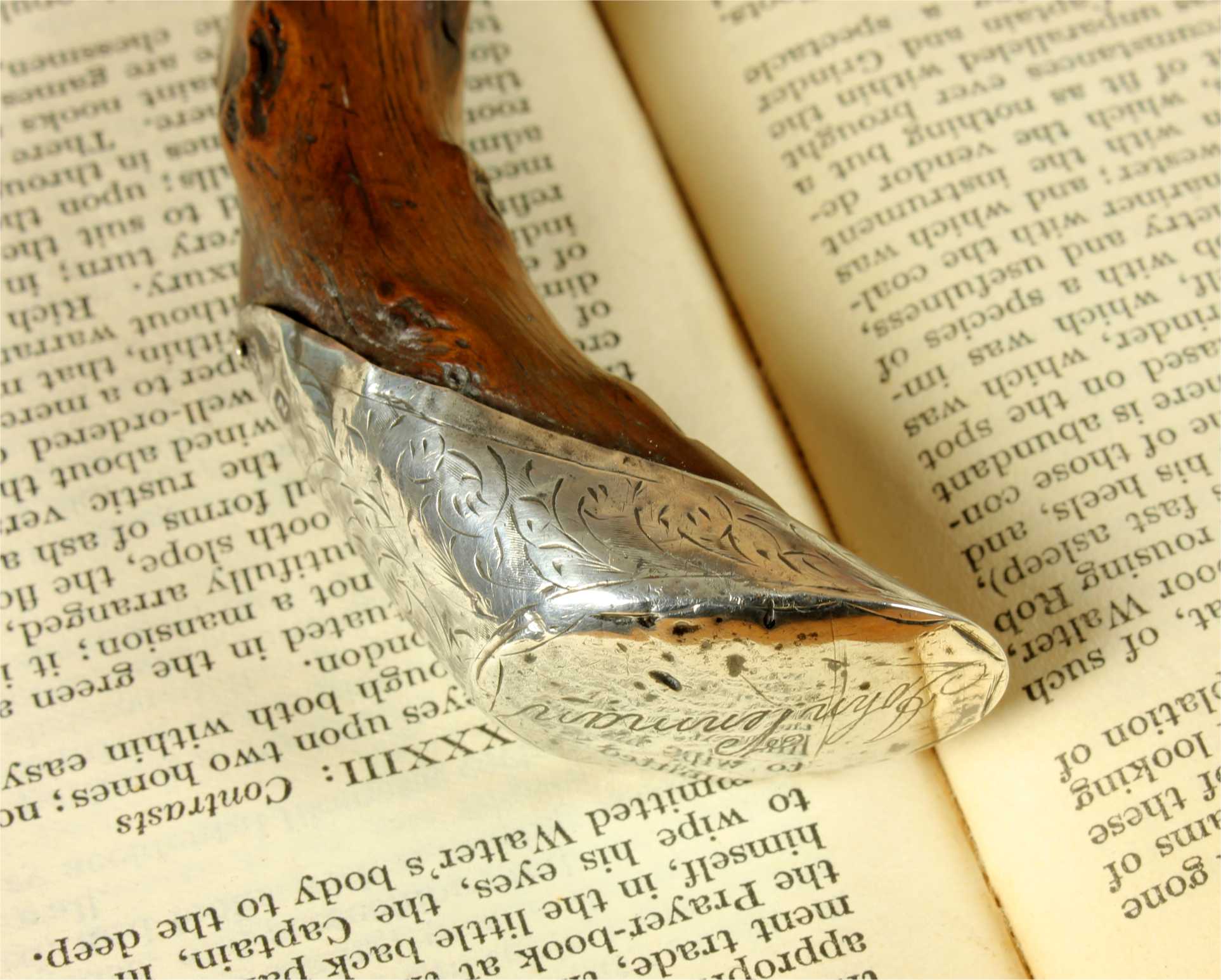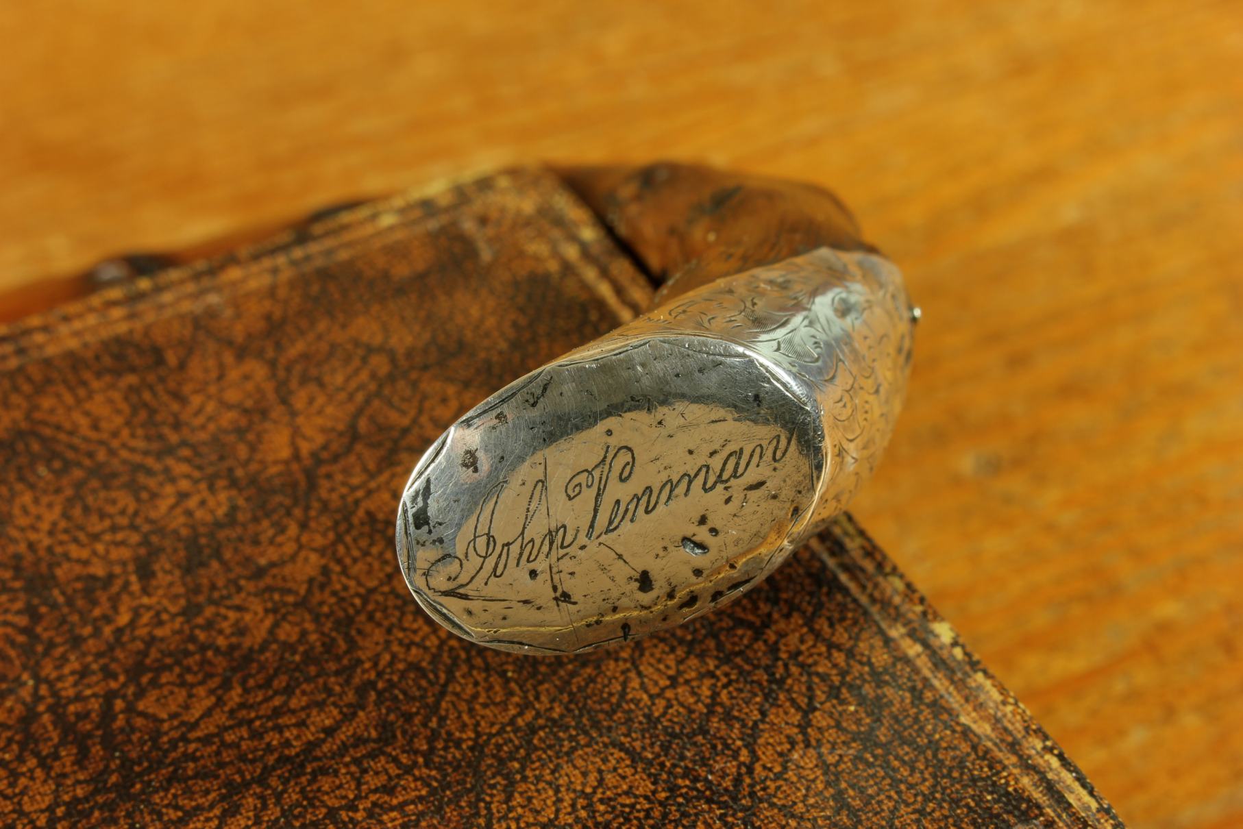 This antique walking cane which was made in 1899 from a beautiful piece of thorn wood has an ornately decorated hallmarked silver collar and handle cap which is also engraved with John Venman.