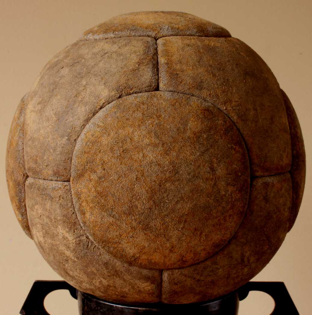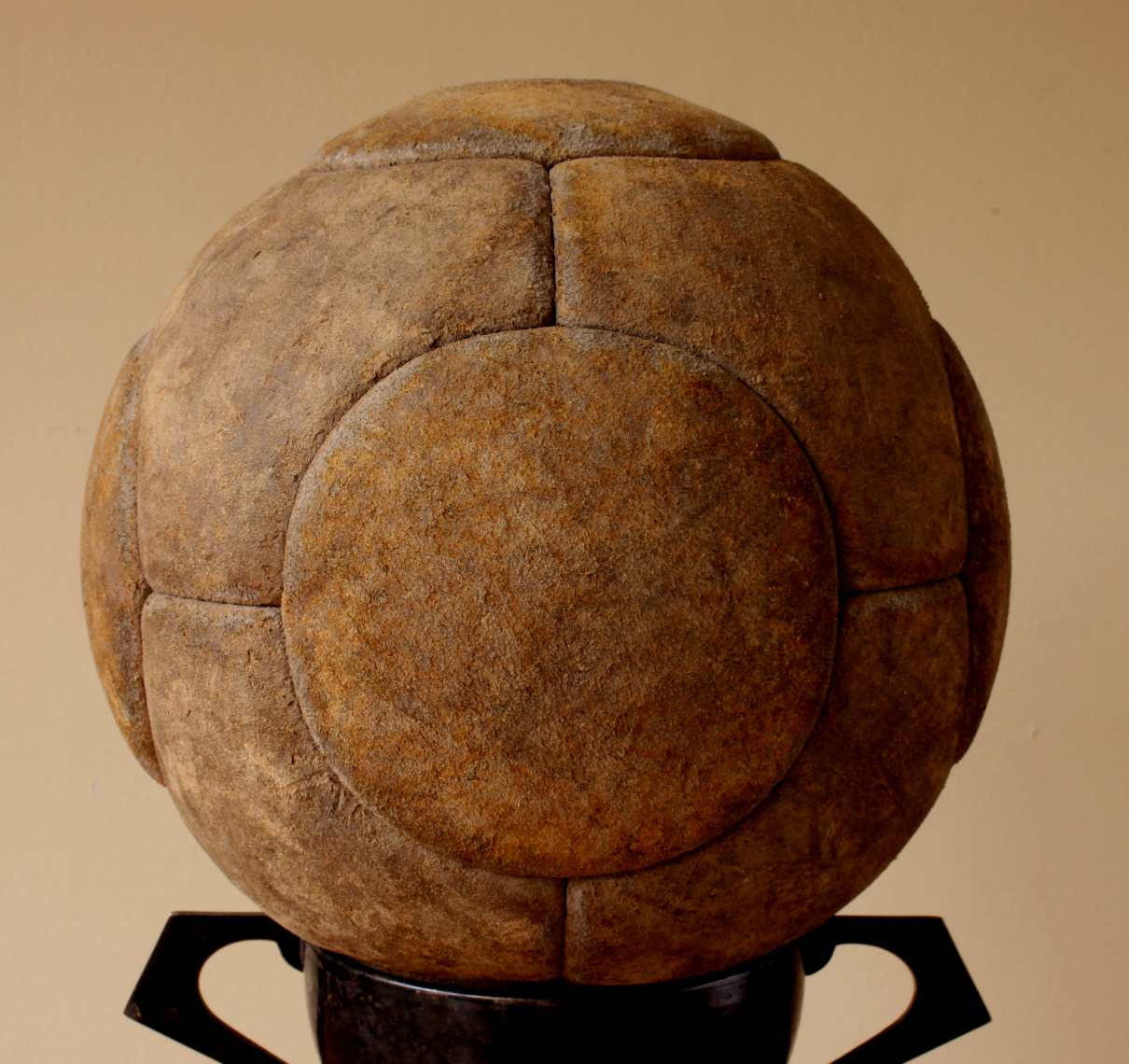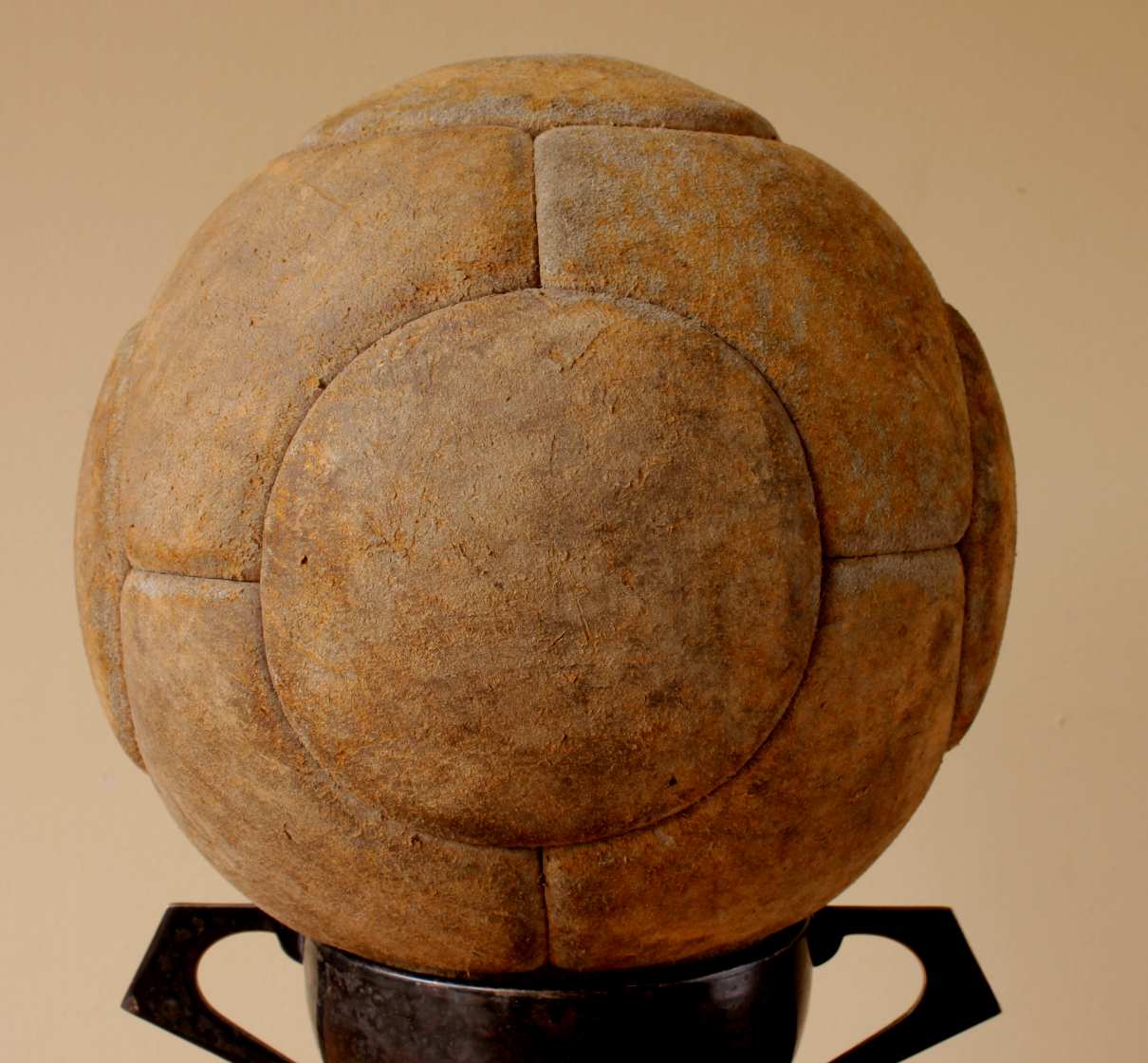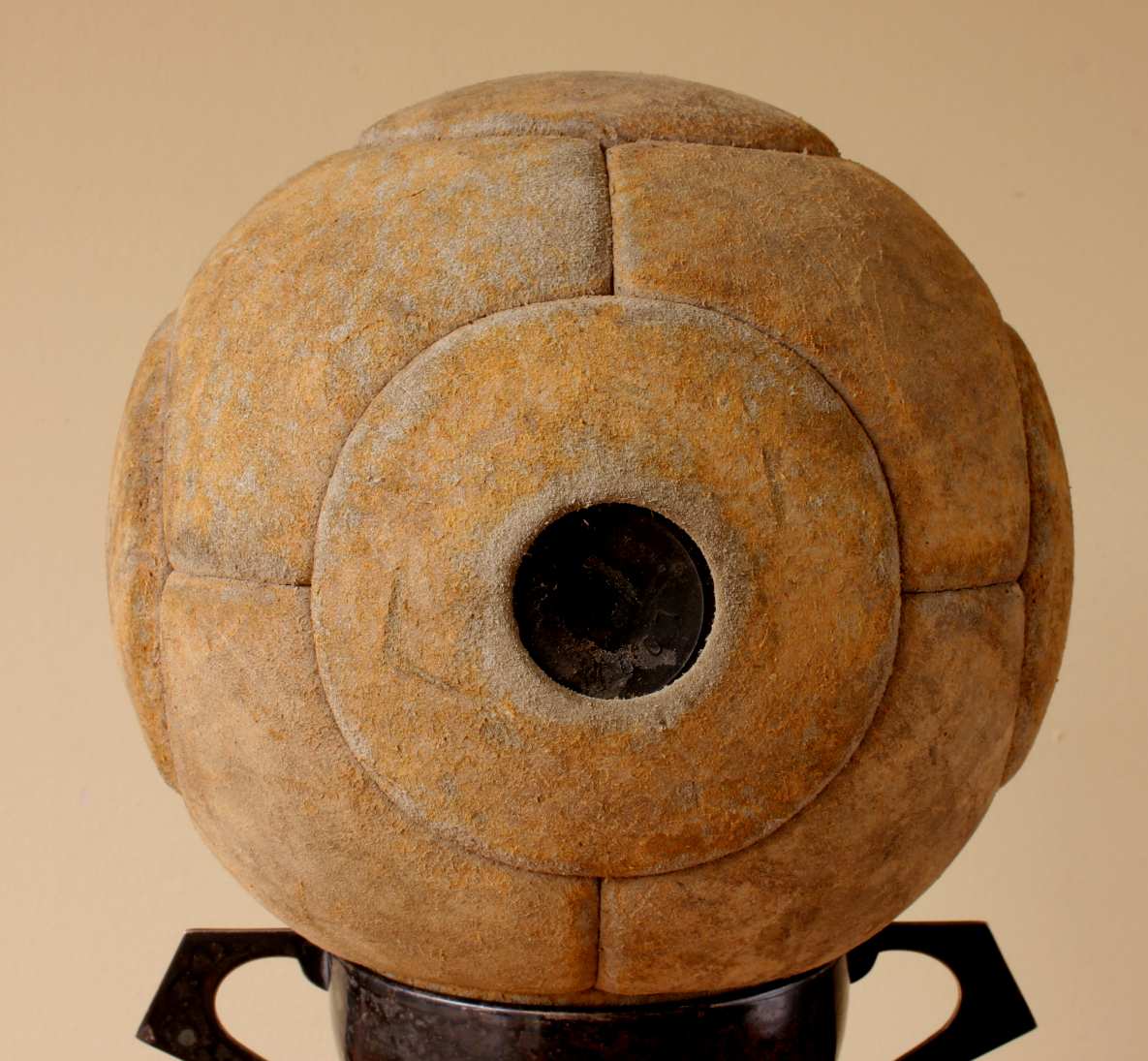 This vintage 1950's French football is made of thick suede leather, is an unusual 14 panel design ball which has a large valve hole and is fitted with the original French bladder which is marked Made In France LOOK.