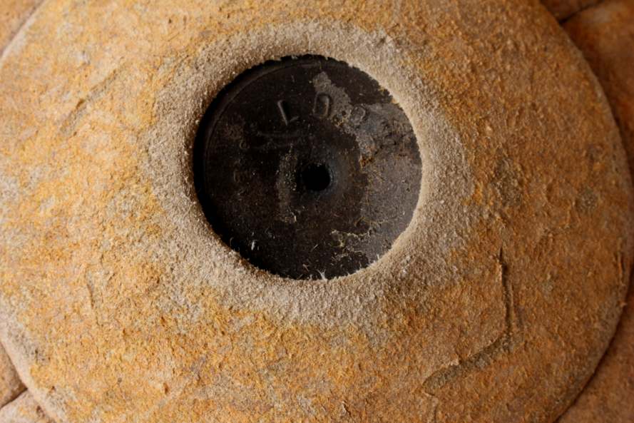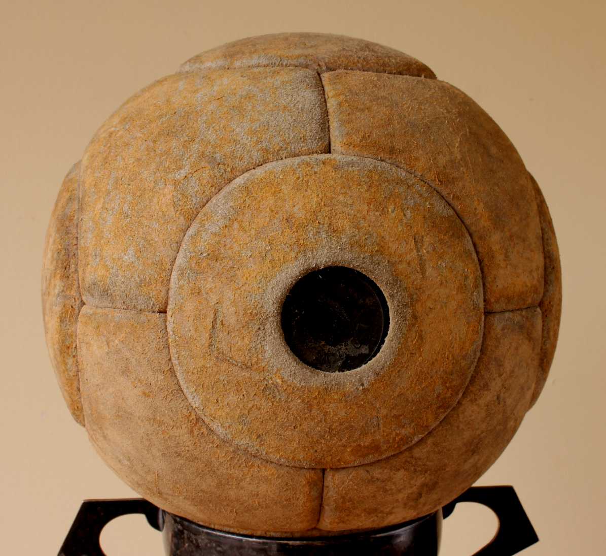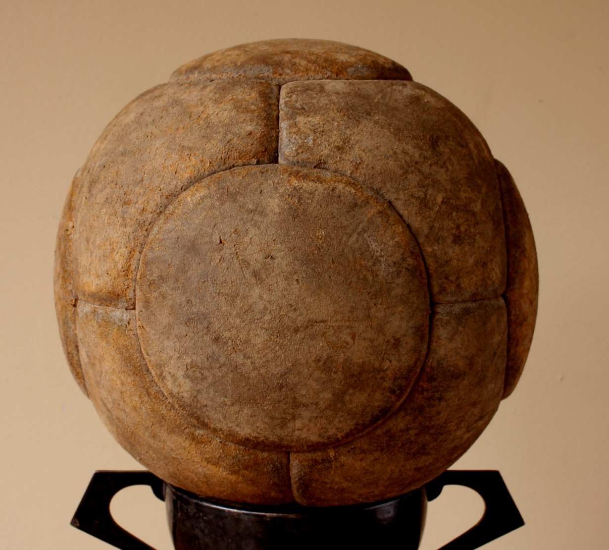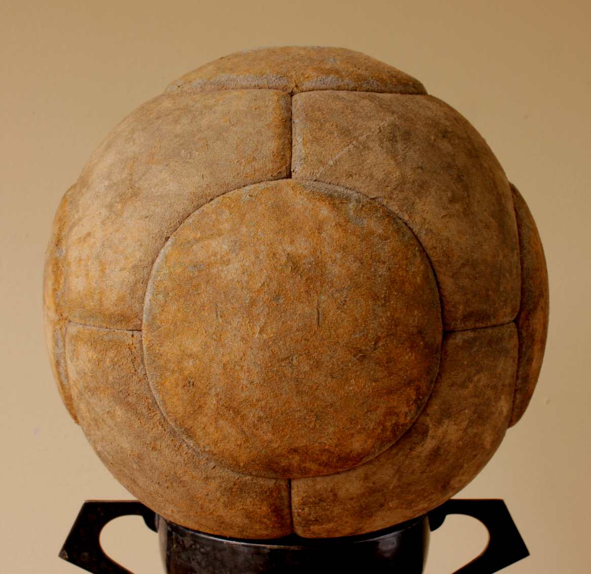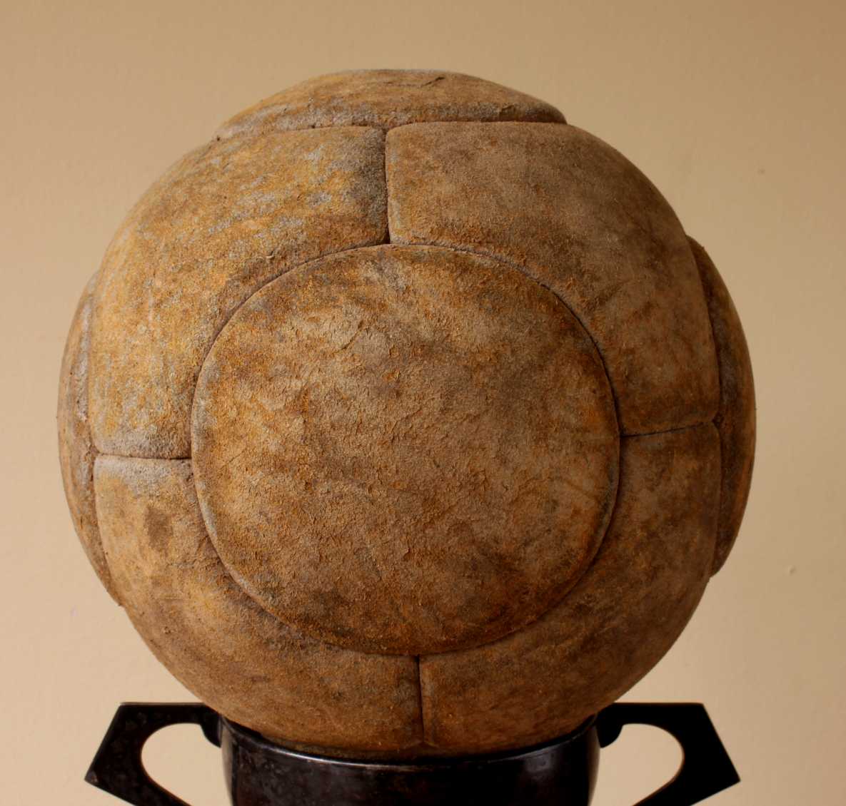 This vintage 1950's French football is made of thick suede leather, is an unusual 14 panel design ball which has a large valve hole and is fitted with the original French bladder which is marked Made In France LOOK.