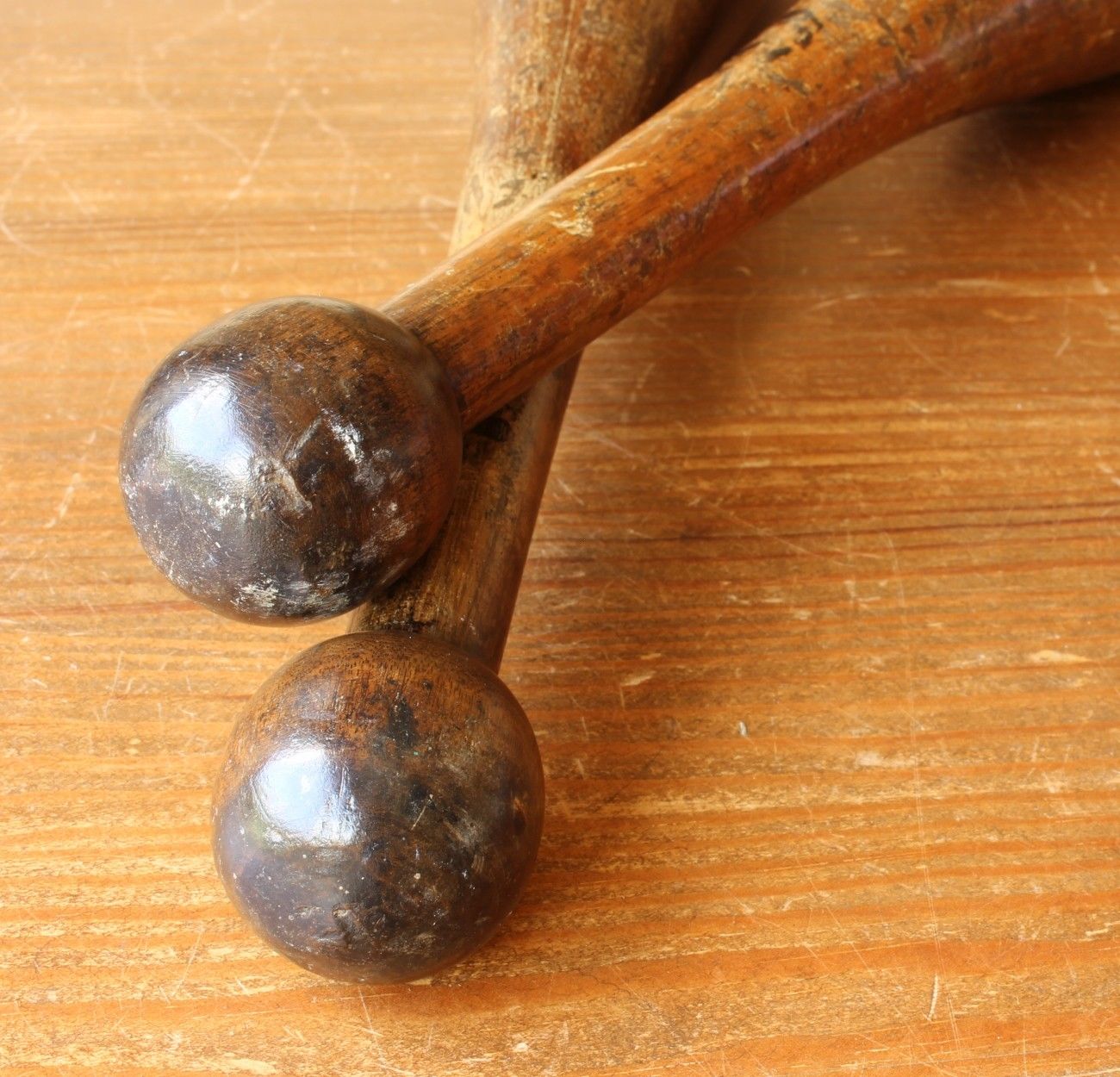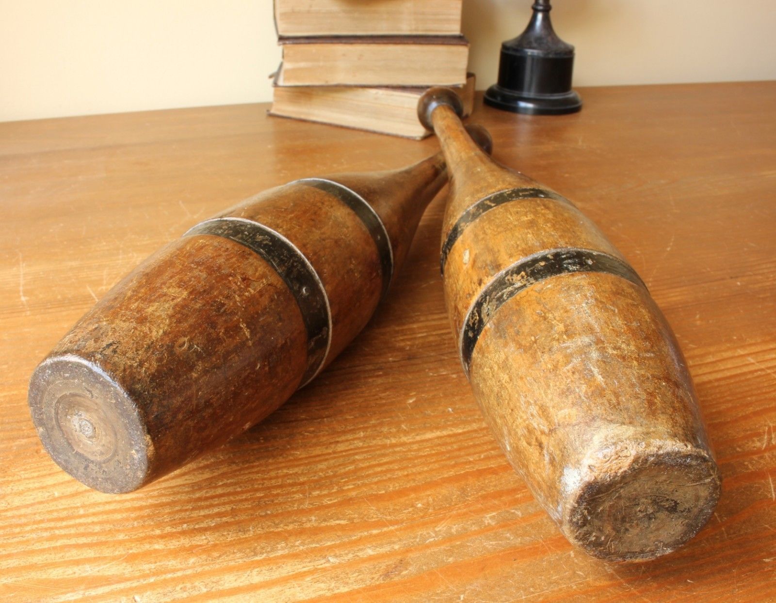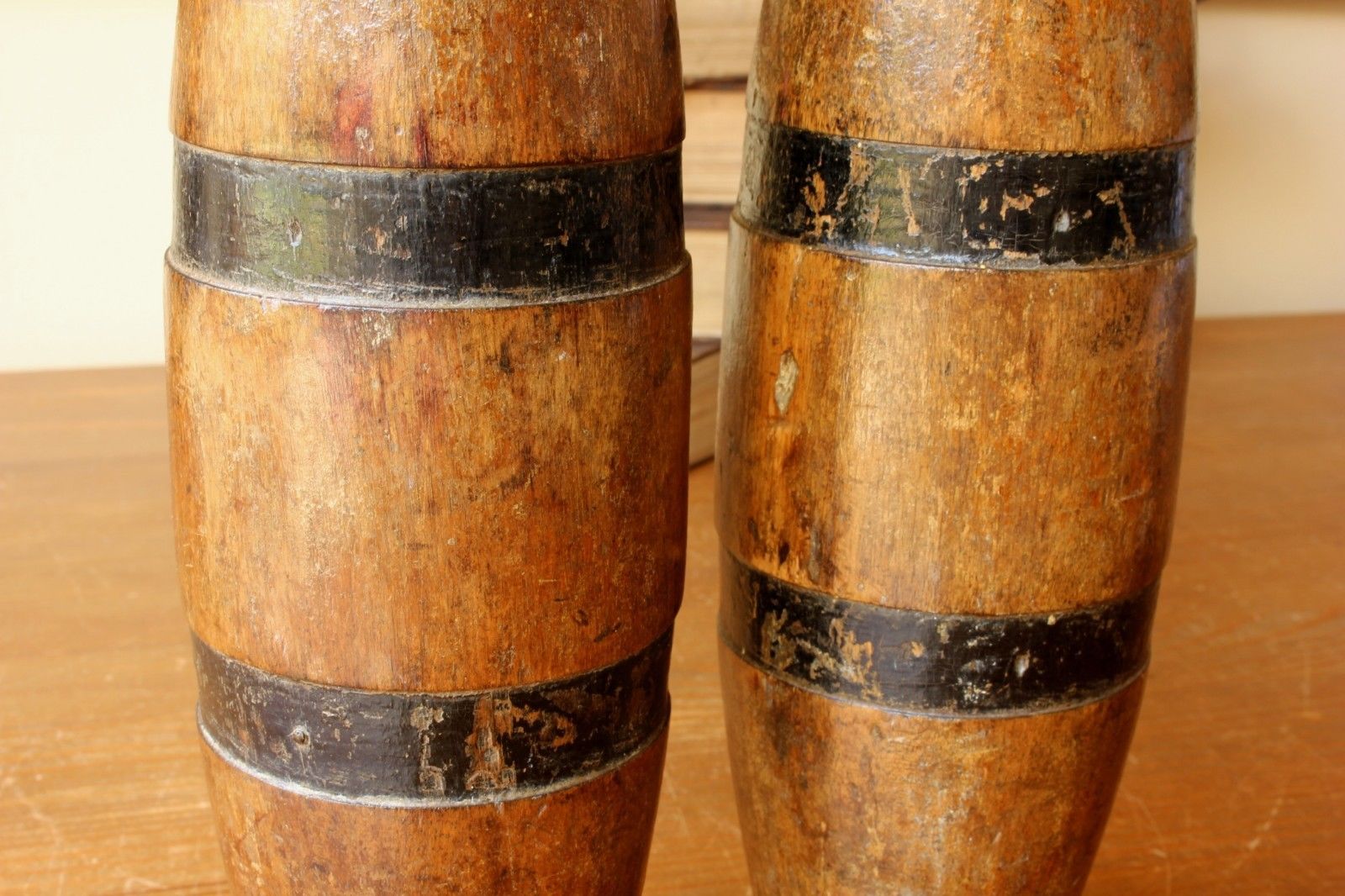 These attractive items of antique sporting equipment are hand made, have a wonderful rich patina and make fantastic home or gym display items, super props or collectors items. They have two indented black bands to each which add to their wonderfully stylish look.