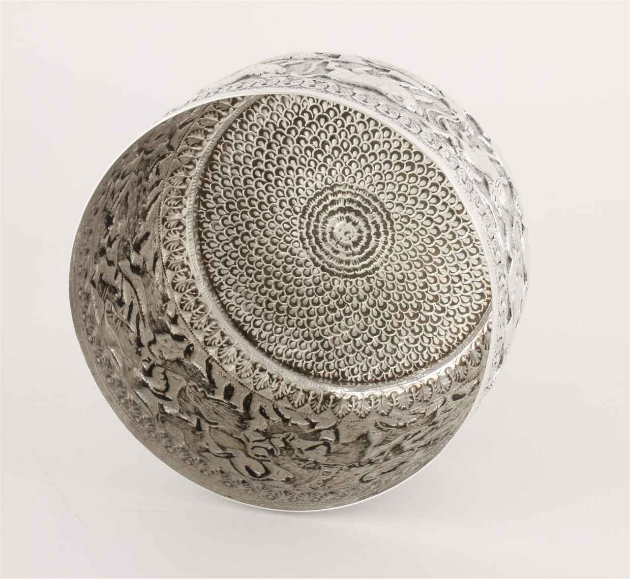 This high quality Indian silver bowl has a hand chased hunting scene with dogs, lions, wild boar and other animals.
