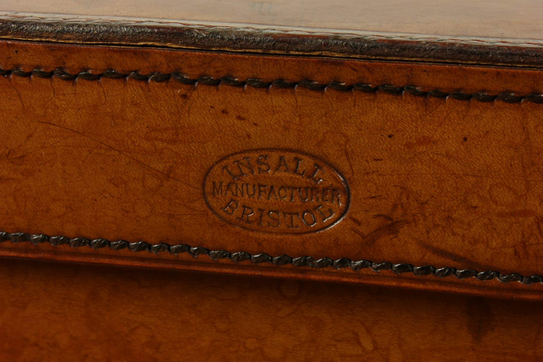 This antique attache case is strong and durable being made from high quality leather, has it's front lower corners shaped to fit inside the top lid, a stitched leather handle with sturdy brass fittings, two brass locks/clasps and is embossed to both ends of the lid with Insall Bristol Manufacturer.