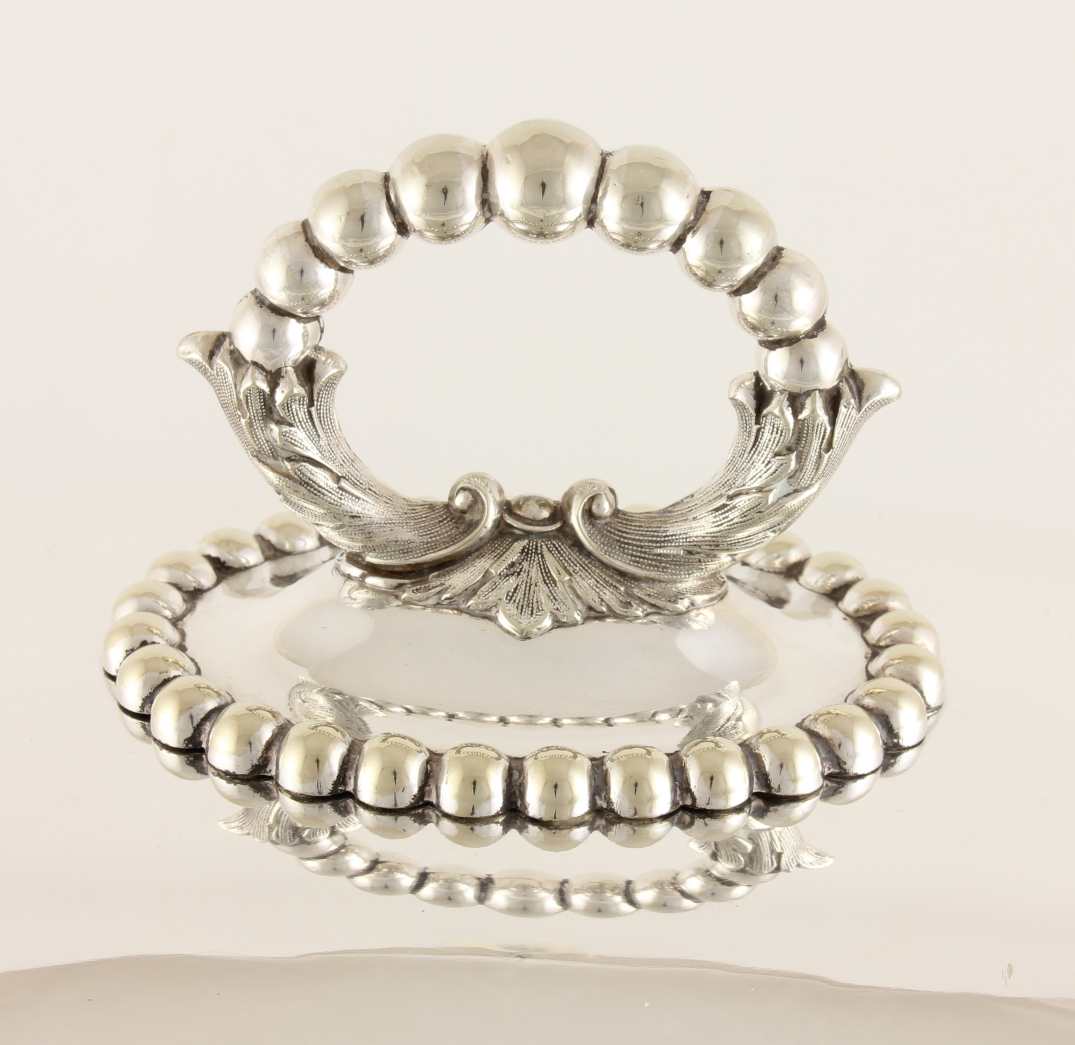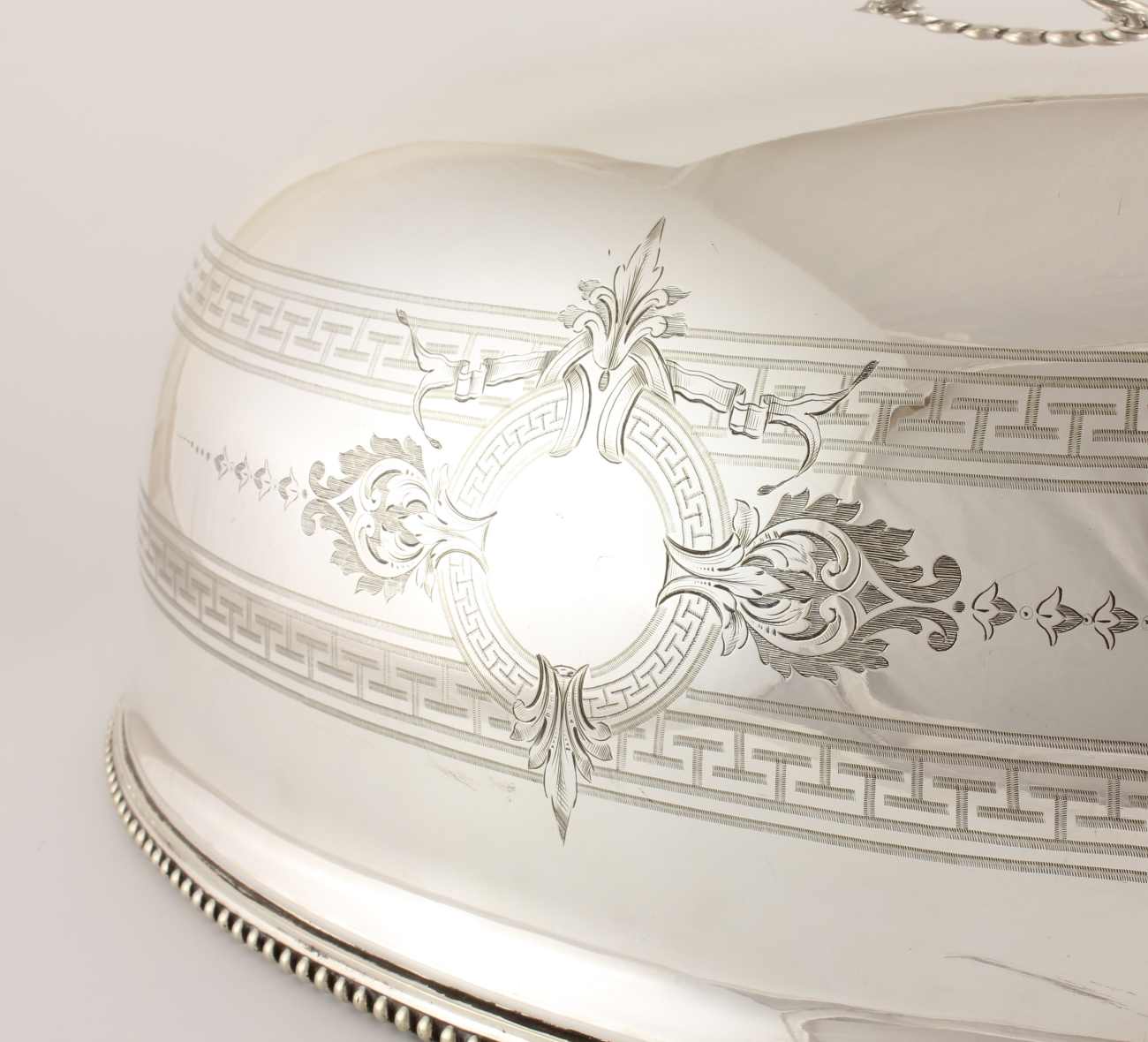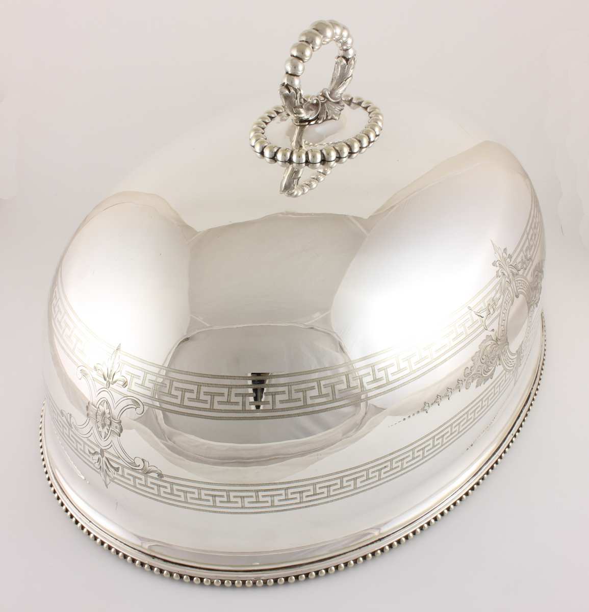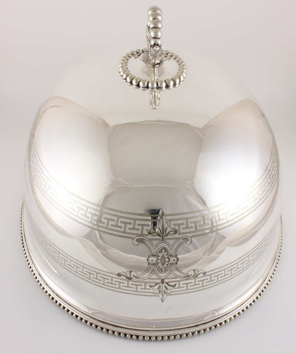 This fine quality meat dome which is a nice large size and a heavy gauge has beaded edging decoration, a beaded design handle for easy lifting and a wonderful Greek Key pattern to the body. Both sides bear a blank cartouche so could be engraved if you so wished.