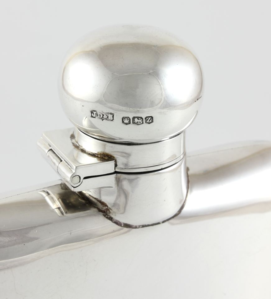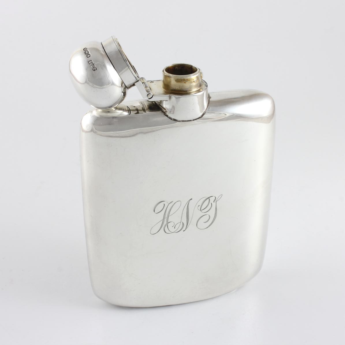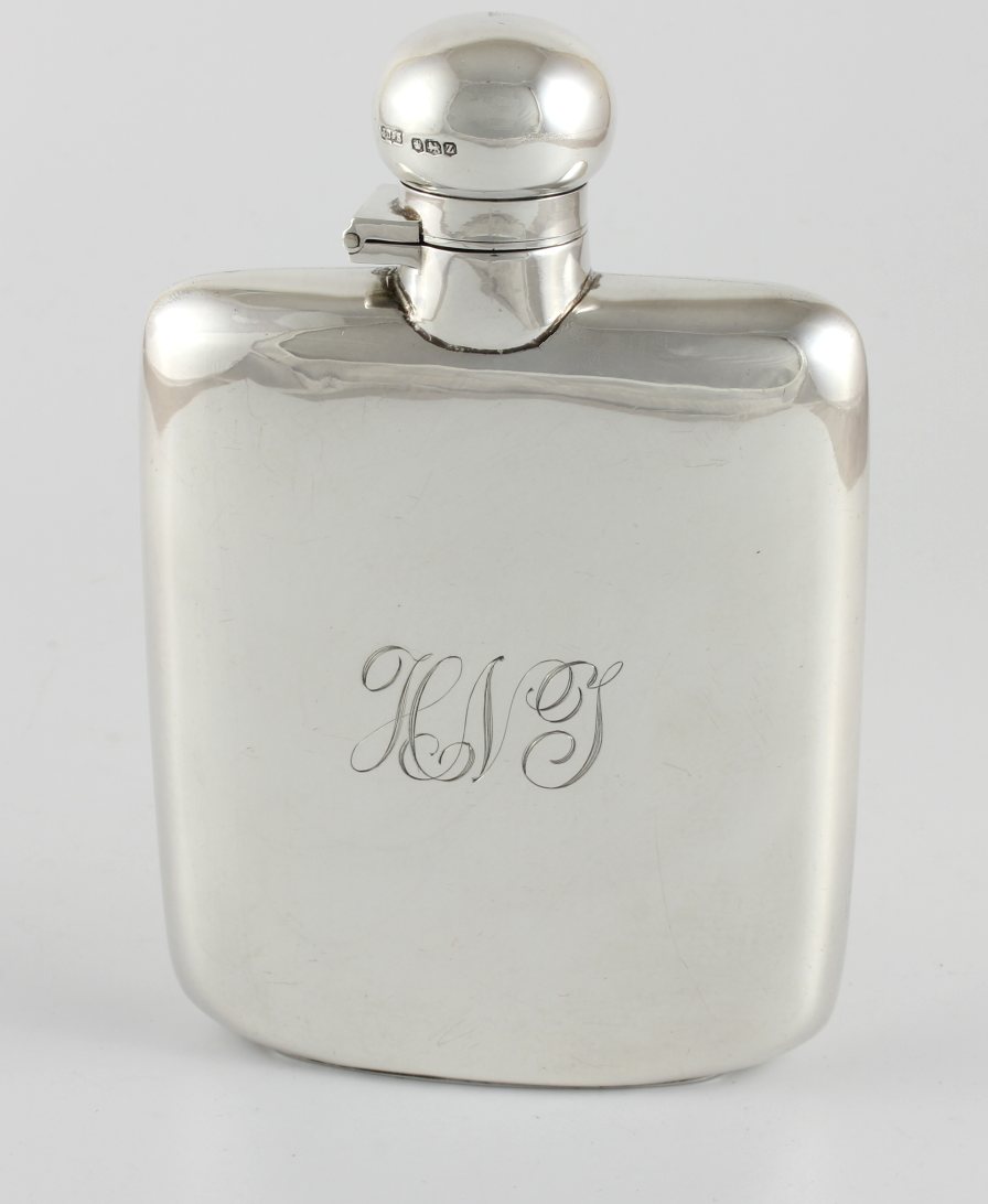 This hip flask has a beautiful monogram to the front, has a hinged flip / bayonet top which is tight and seals well so does not leak and is a good weight.