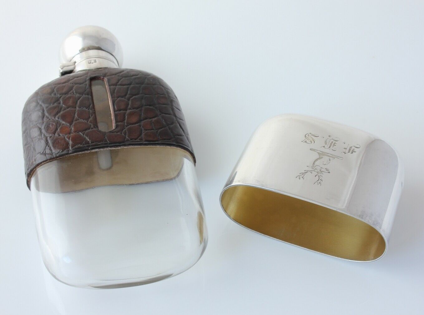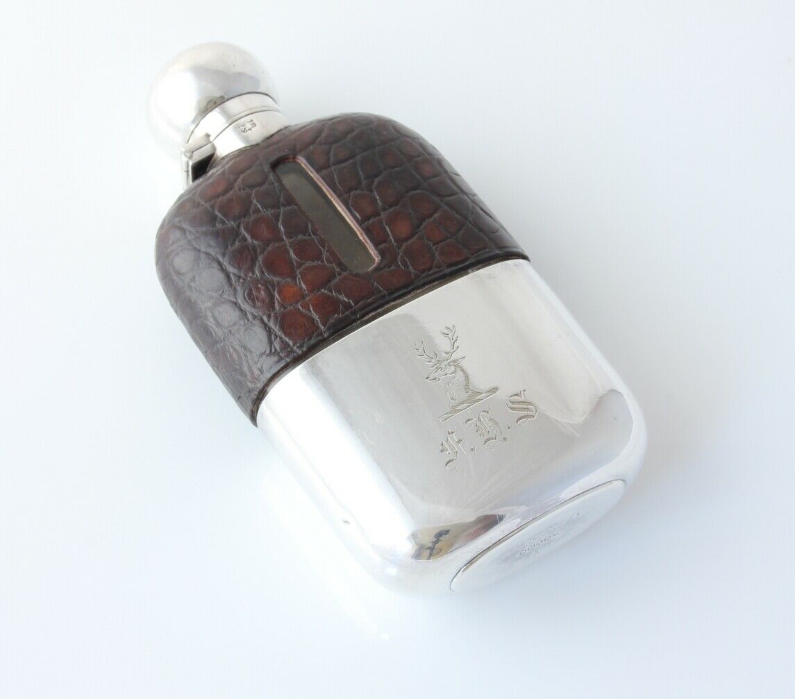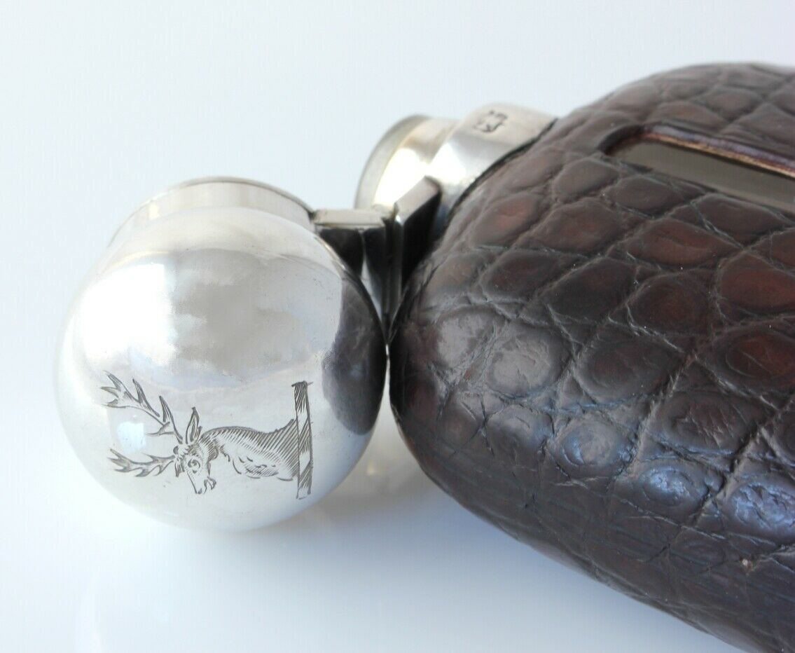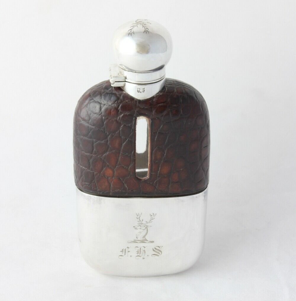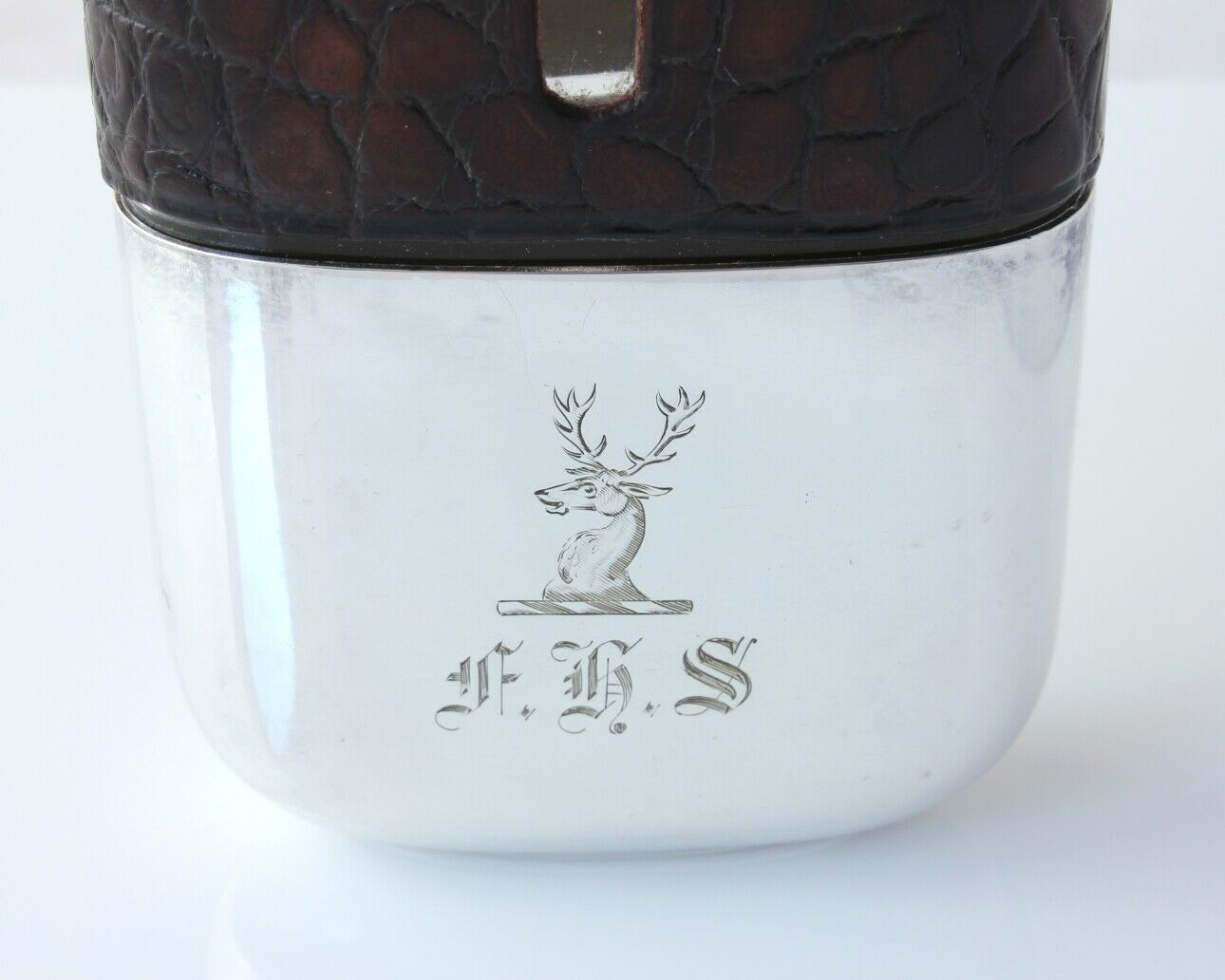 This antique spirit hip flask which has a detachable silver plated cup and hinged flip / bayonet top has the outer of the top half covered in brown crocodile effect leather with a sight level on both sides and is in excellent usable condition.