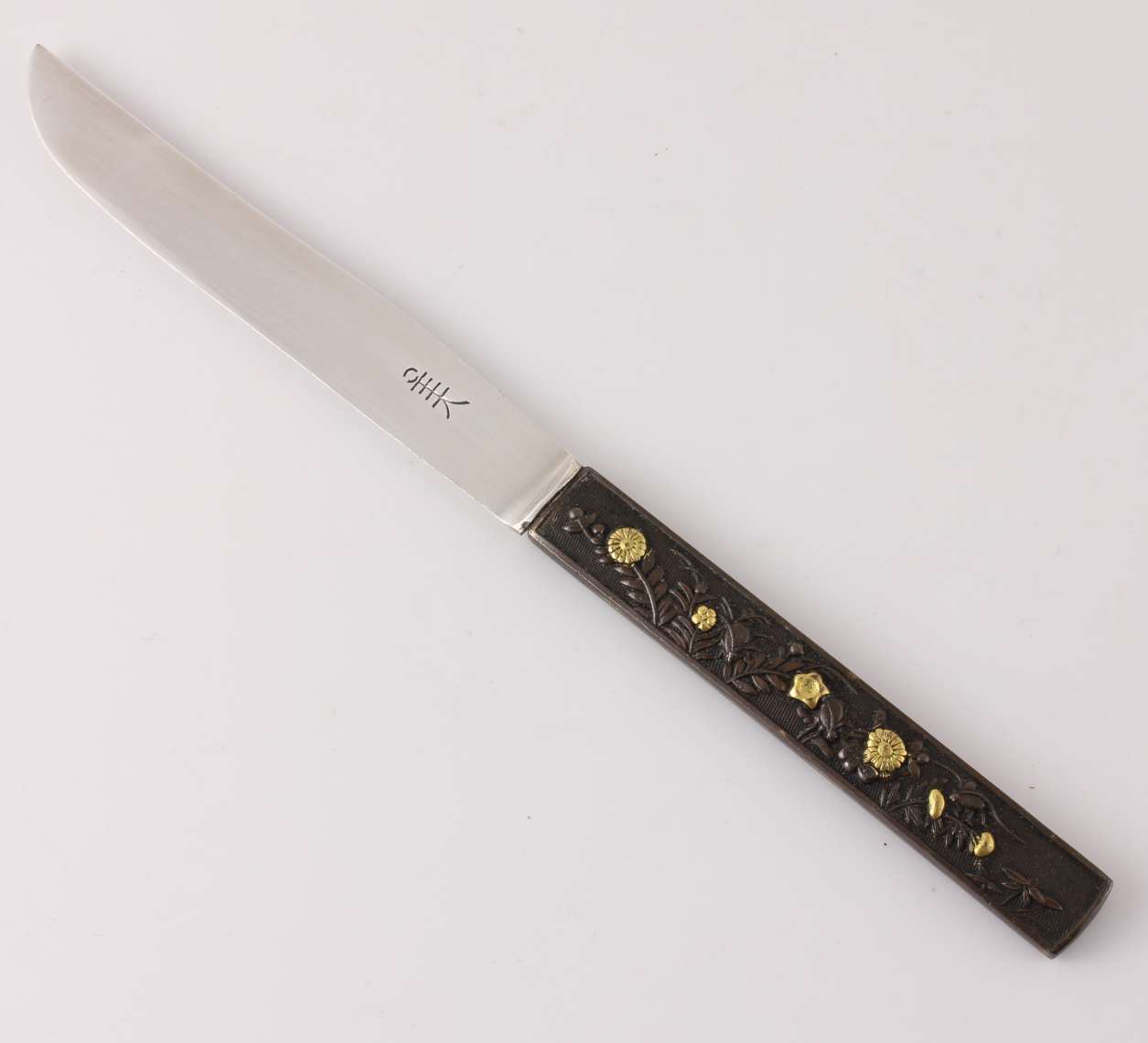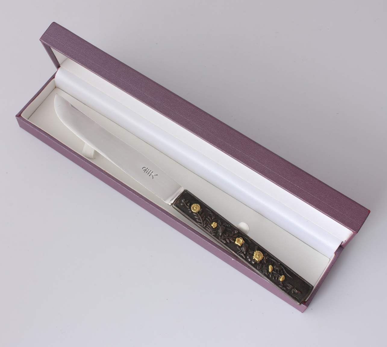 The beautiful handle is wonderfully decorated on both sides with real gold highlights which show off the craftsman's skill for detail and this one has a wonderful floral design.