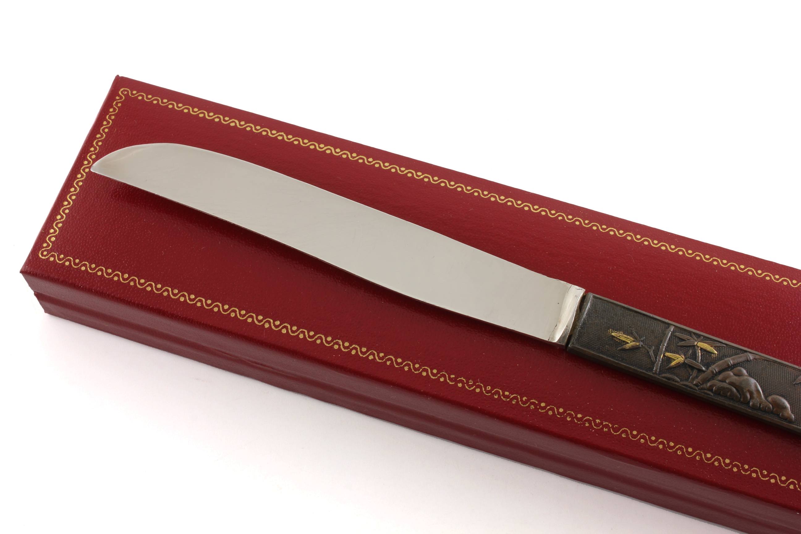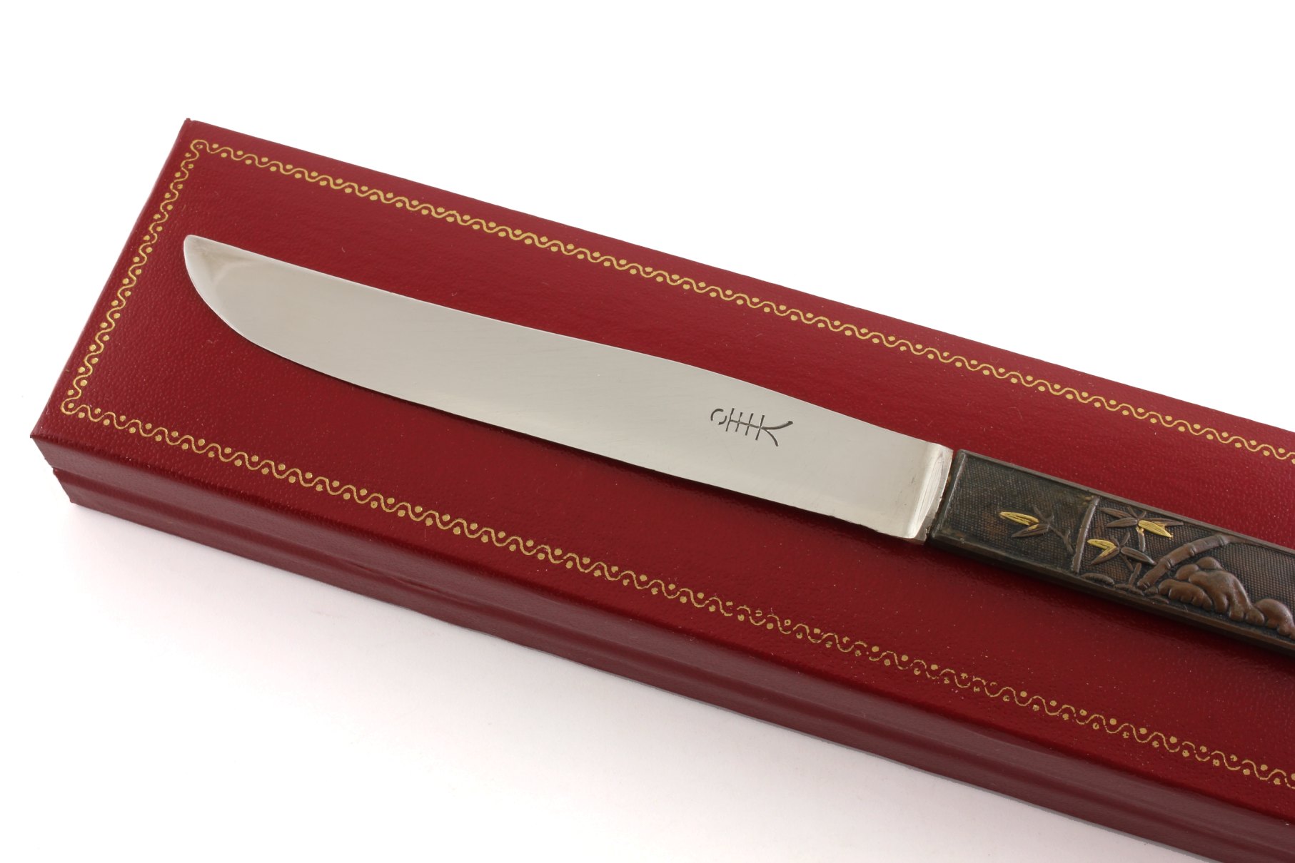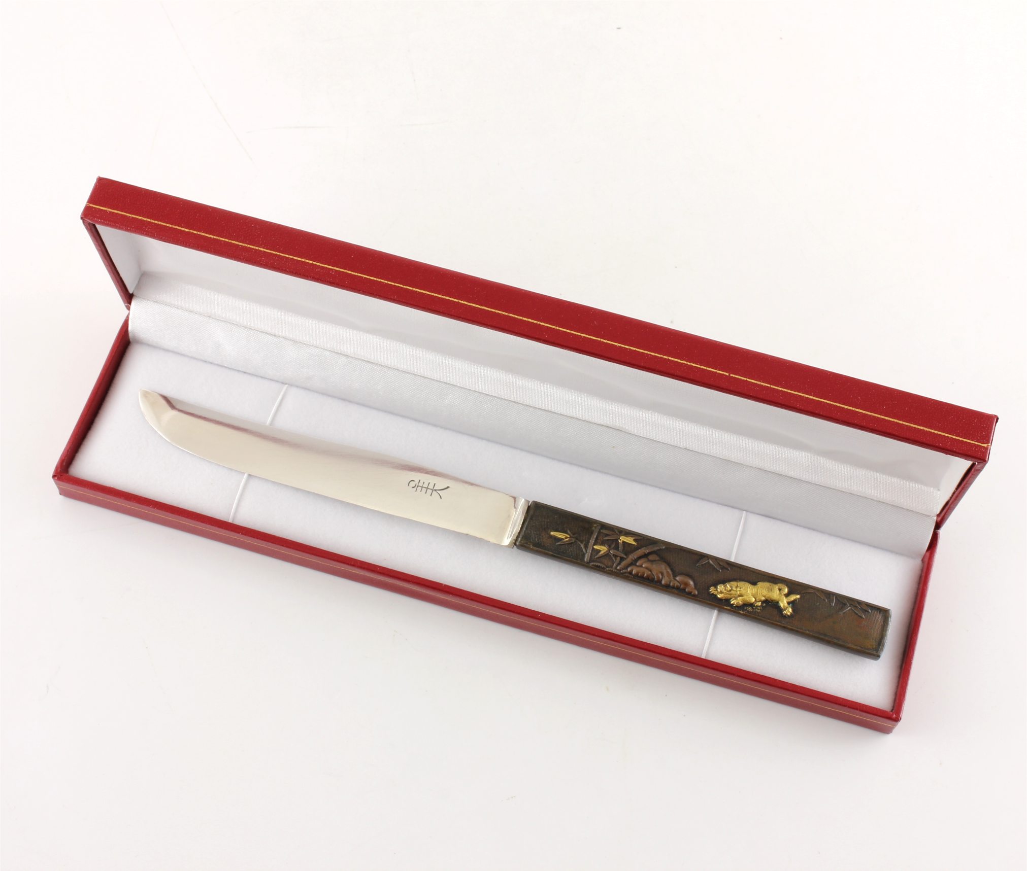 This antique Japanese letter opener which has a bronze Kozuka handle has a silver blade that is marked with a fish type character and dates from the Meiji period.