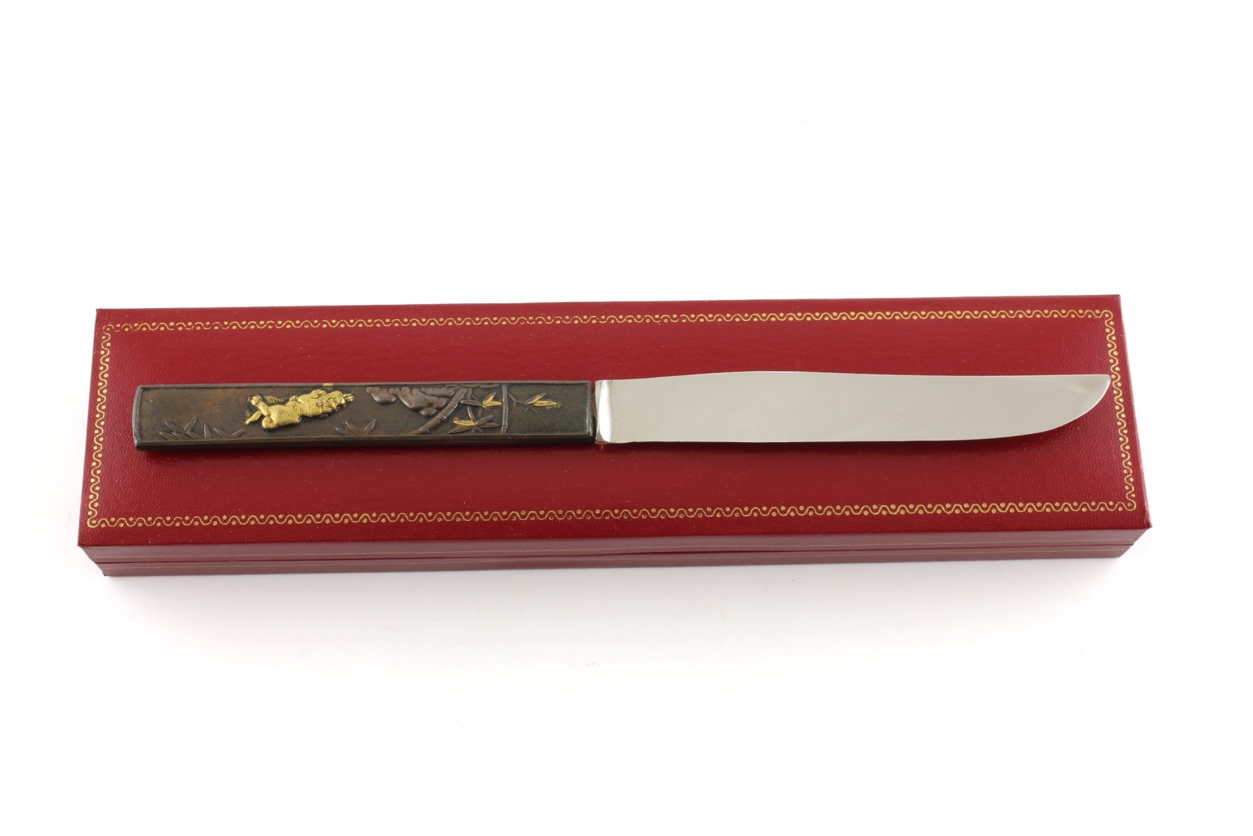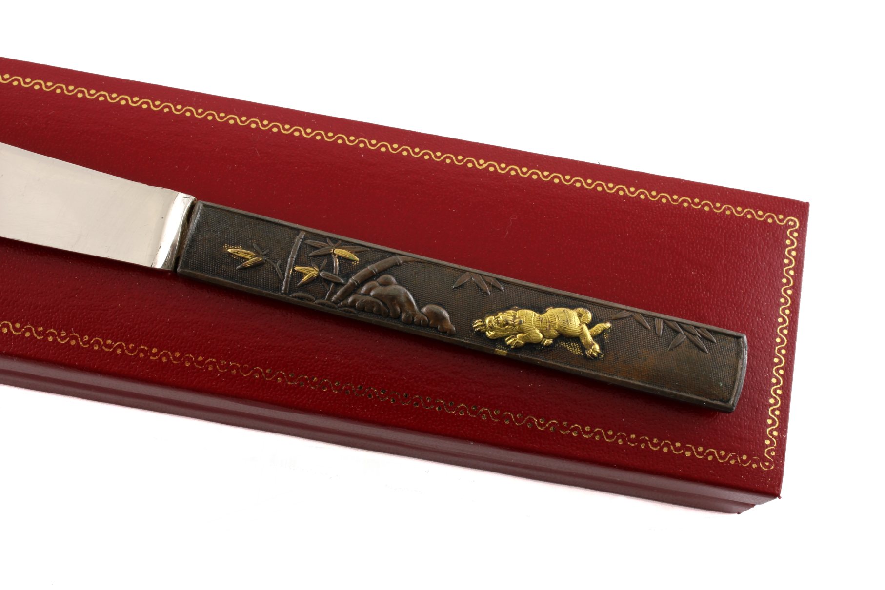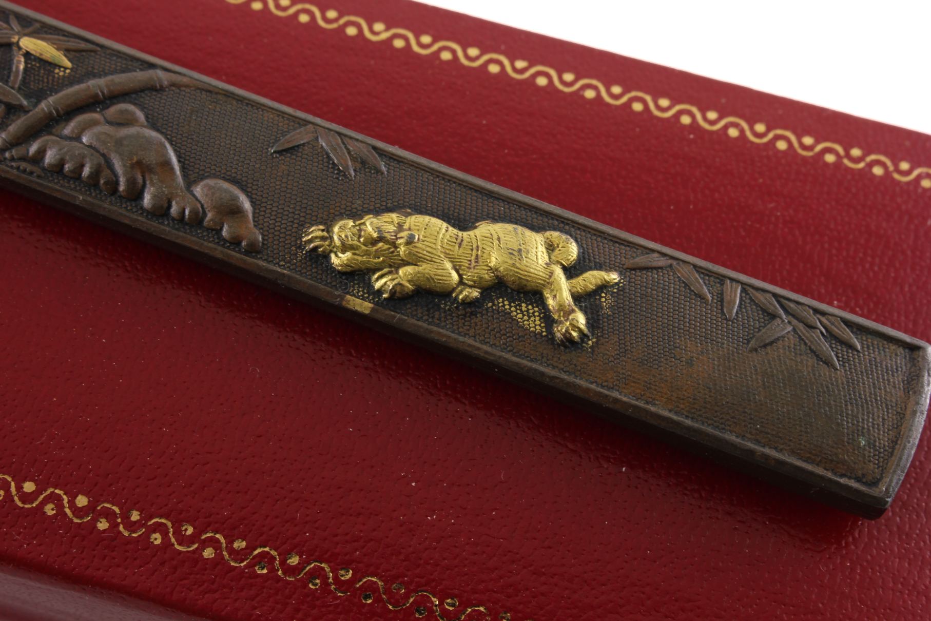 The bronze handle is decorated to both sides with tigers and foliage which are highlighted with real gold.