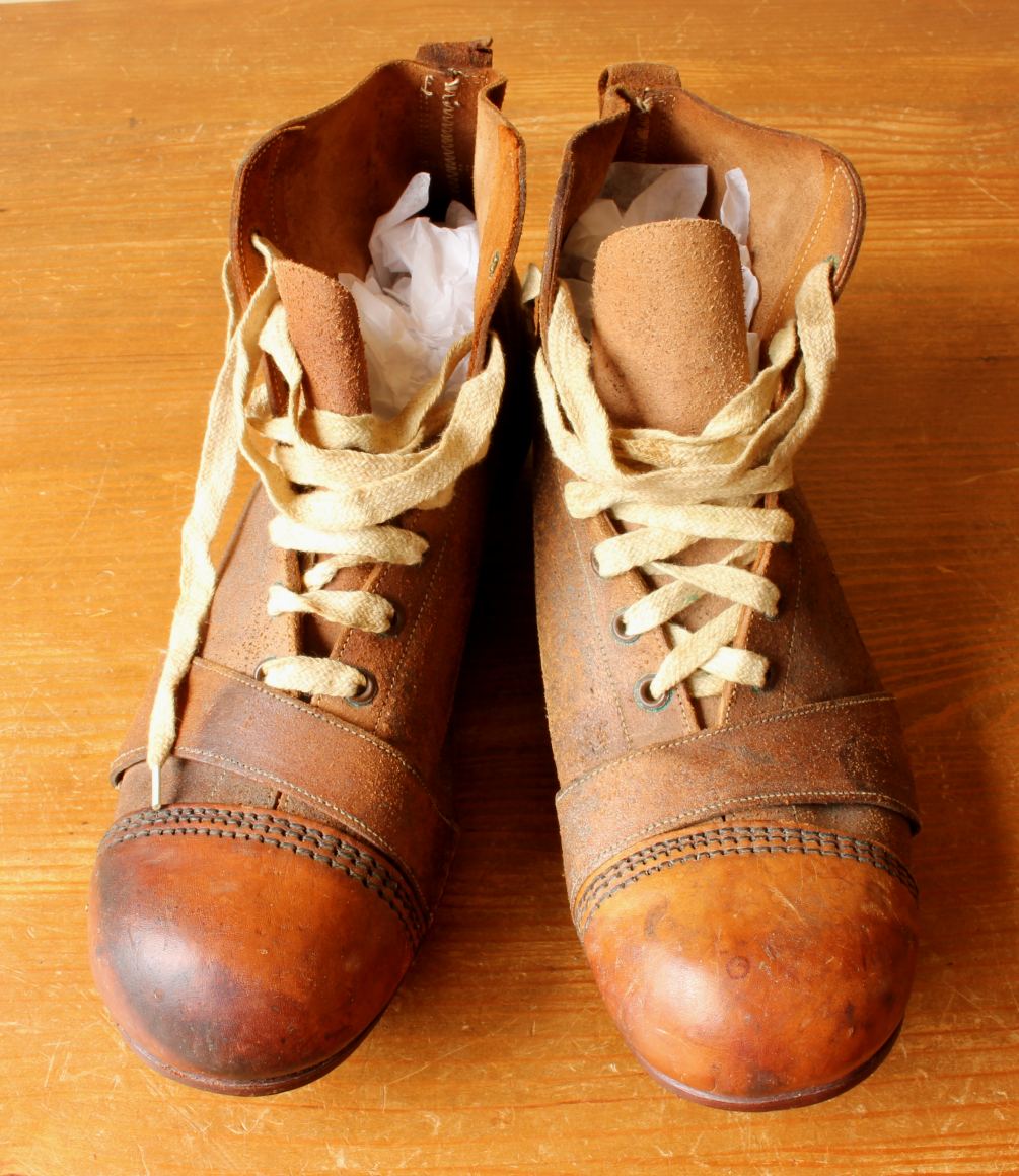 This vintage / antique pair of Jen football boots which date from c1930 - 50 are made of brown leather with leather soles and nailed on studs.
