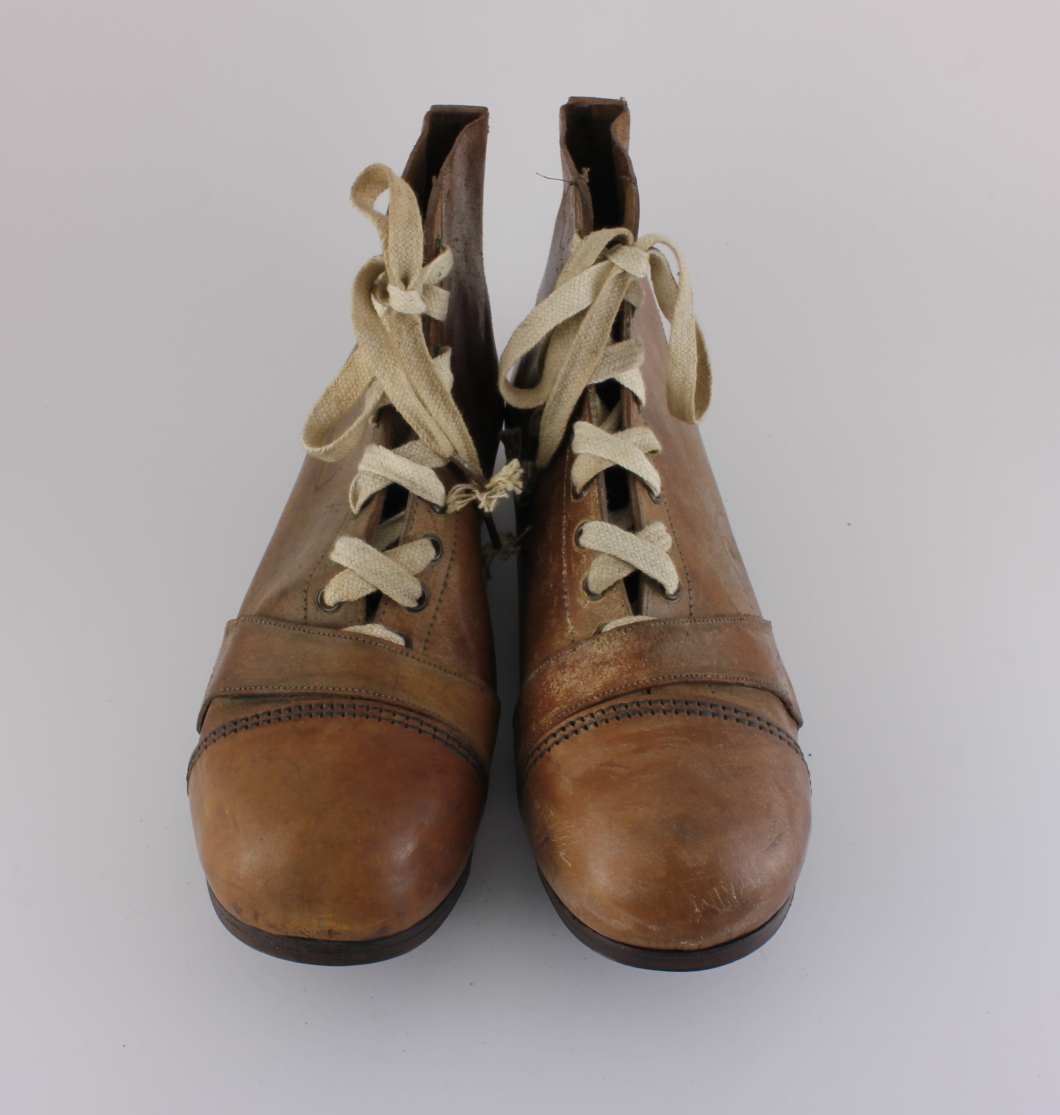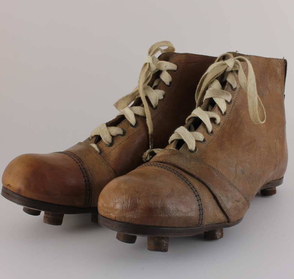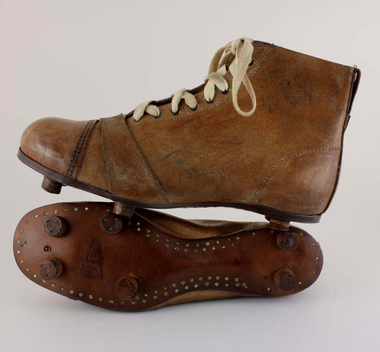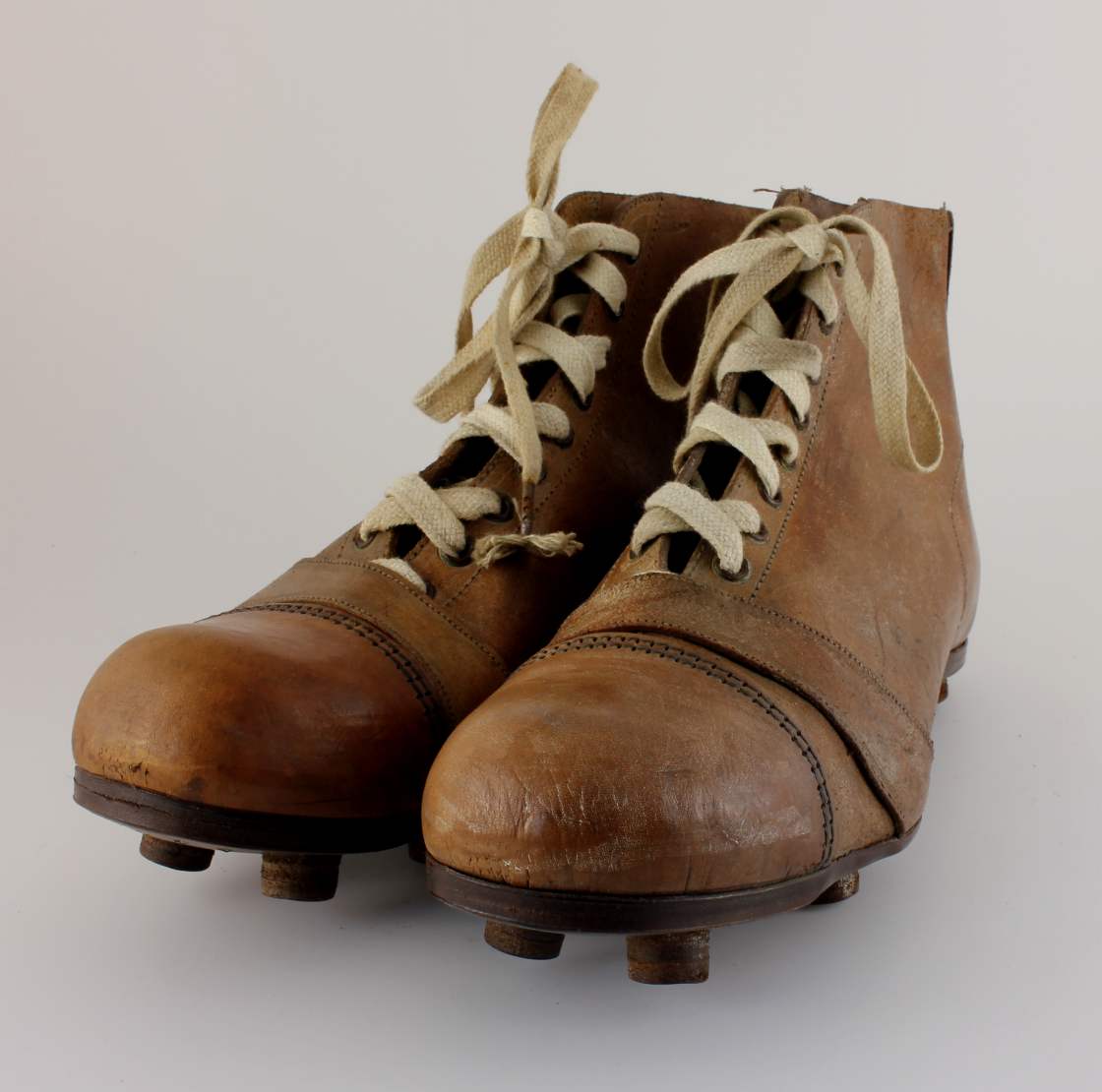 This vintage / antique pair of Jen Goal Ward football boots which date from c1940 are made of brown leather with leather soles, nailed on studs and have the original white laces.