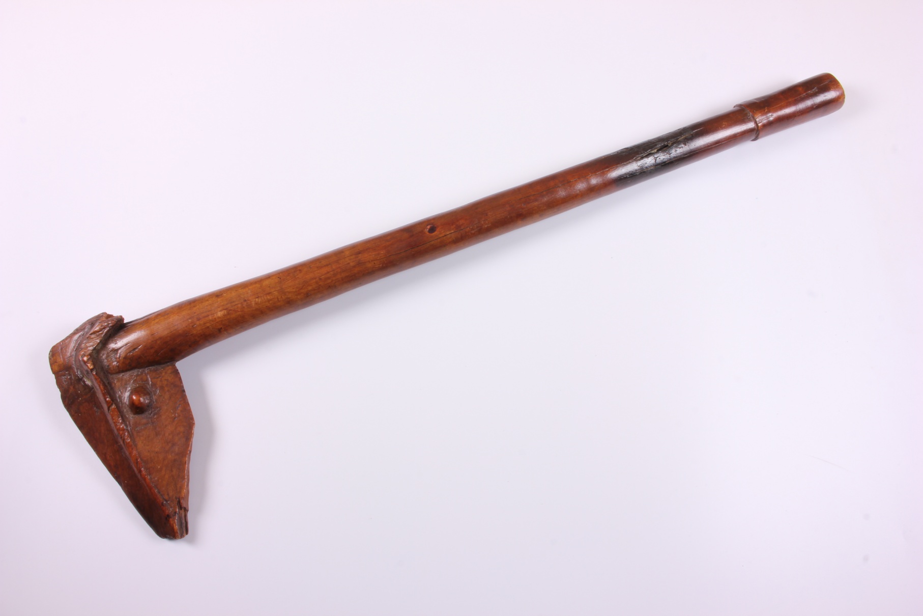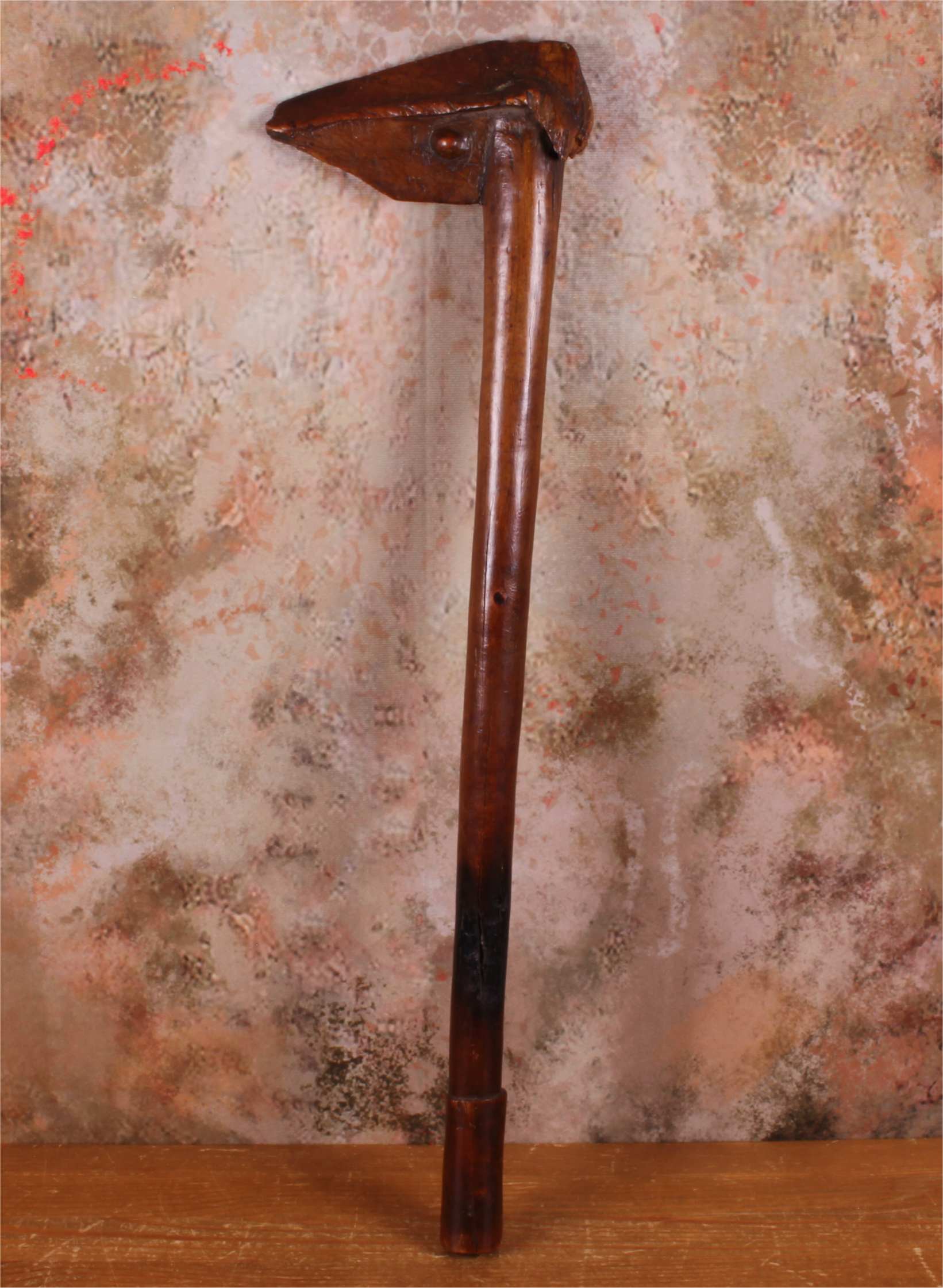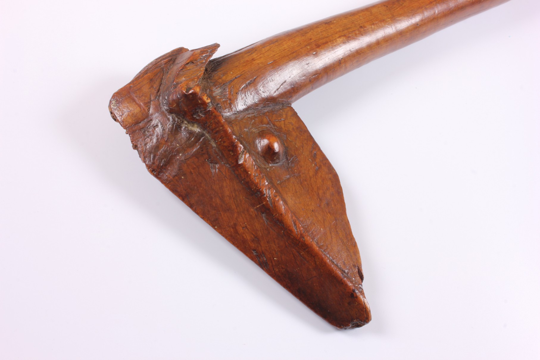 This antique Go Porowa Ra Maru club which is hand carved with a pointed head to resemble a bird's head / beak also has the usual stepped handle and has a rich patina.