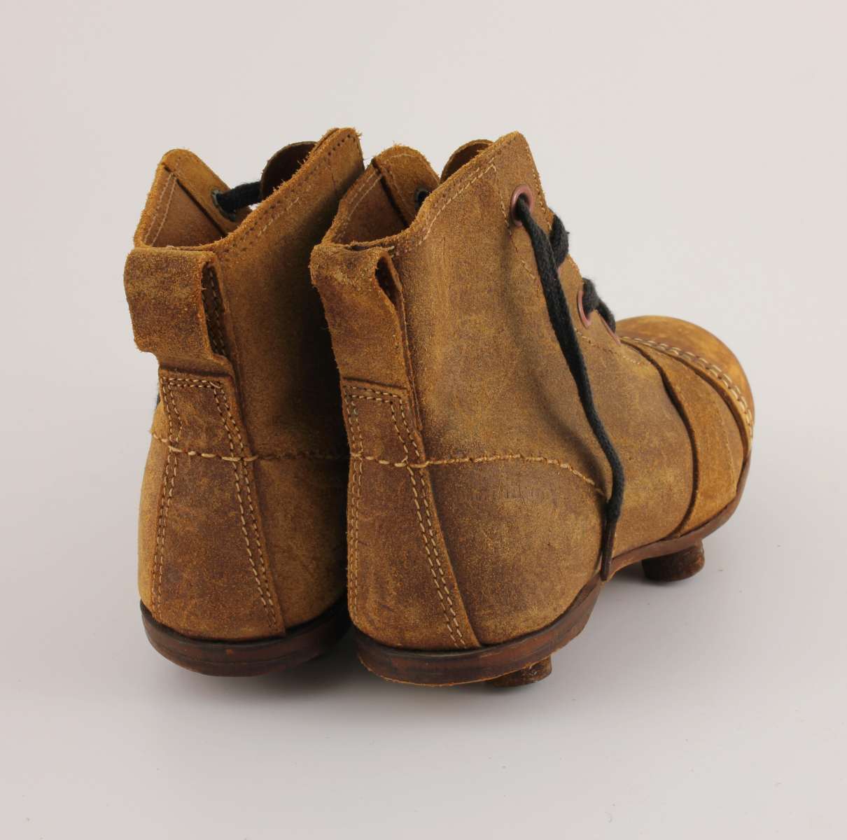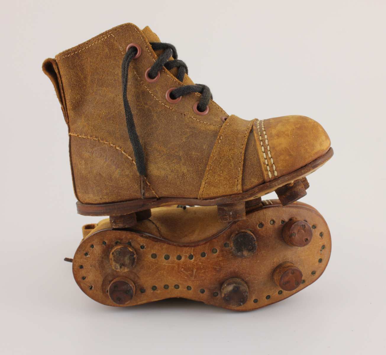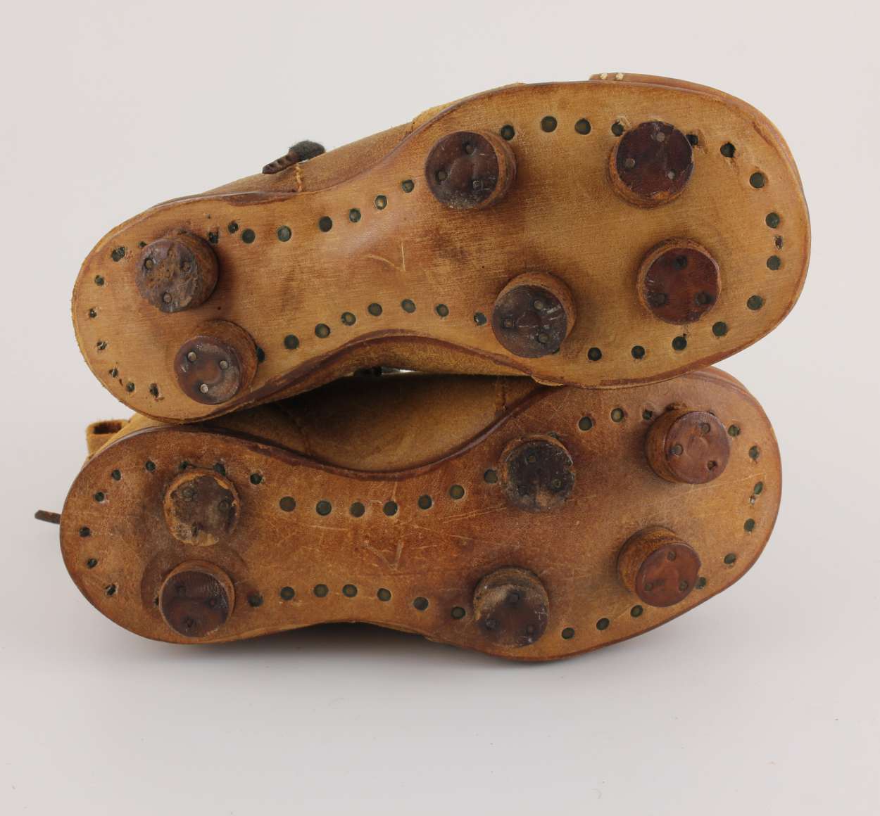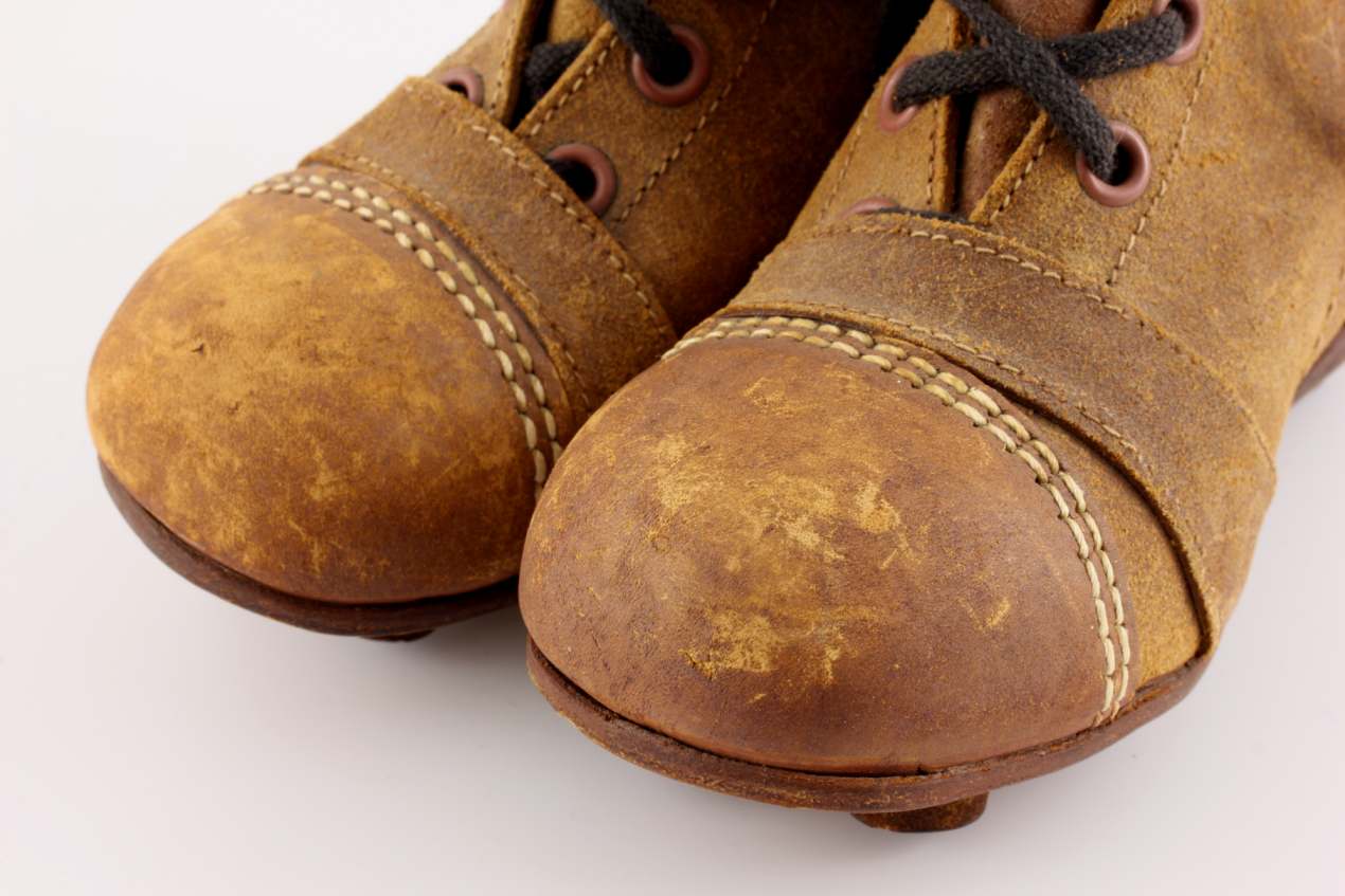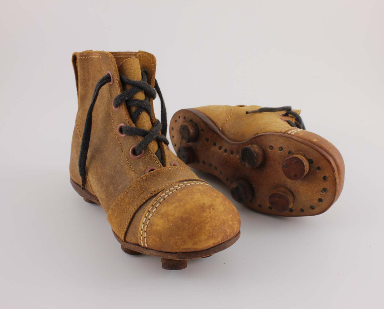 This cute pair of small vintage / antique kids football boots which are made of brown leather with leather soles and nailed on studs date from c1950 and are in a child's size 7.