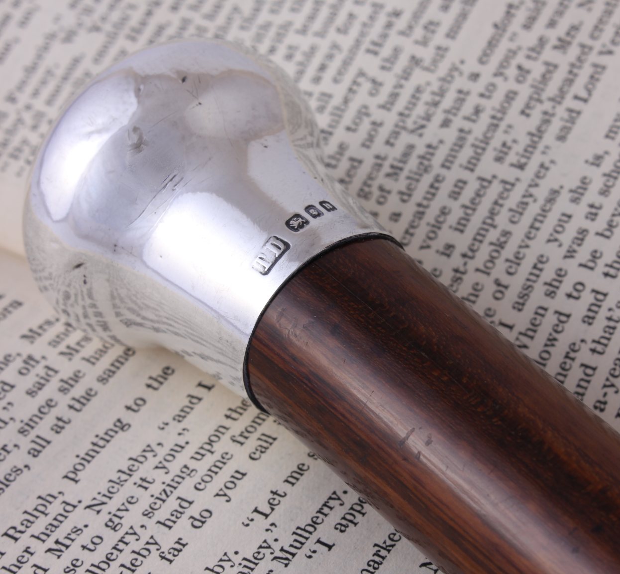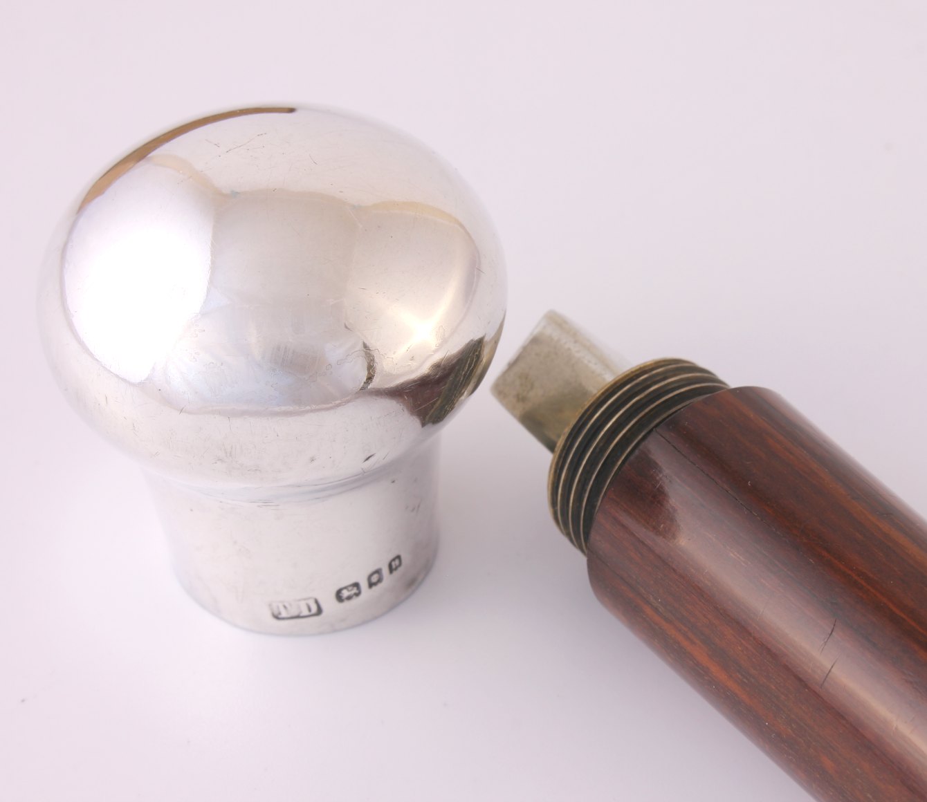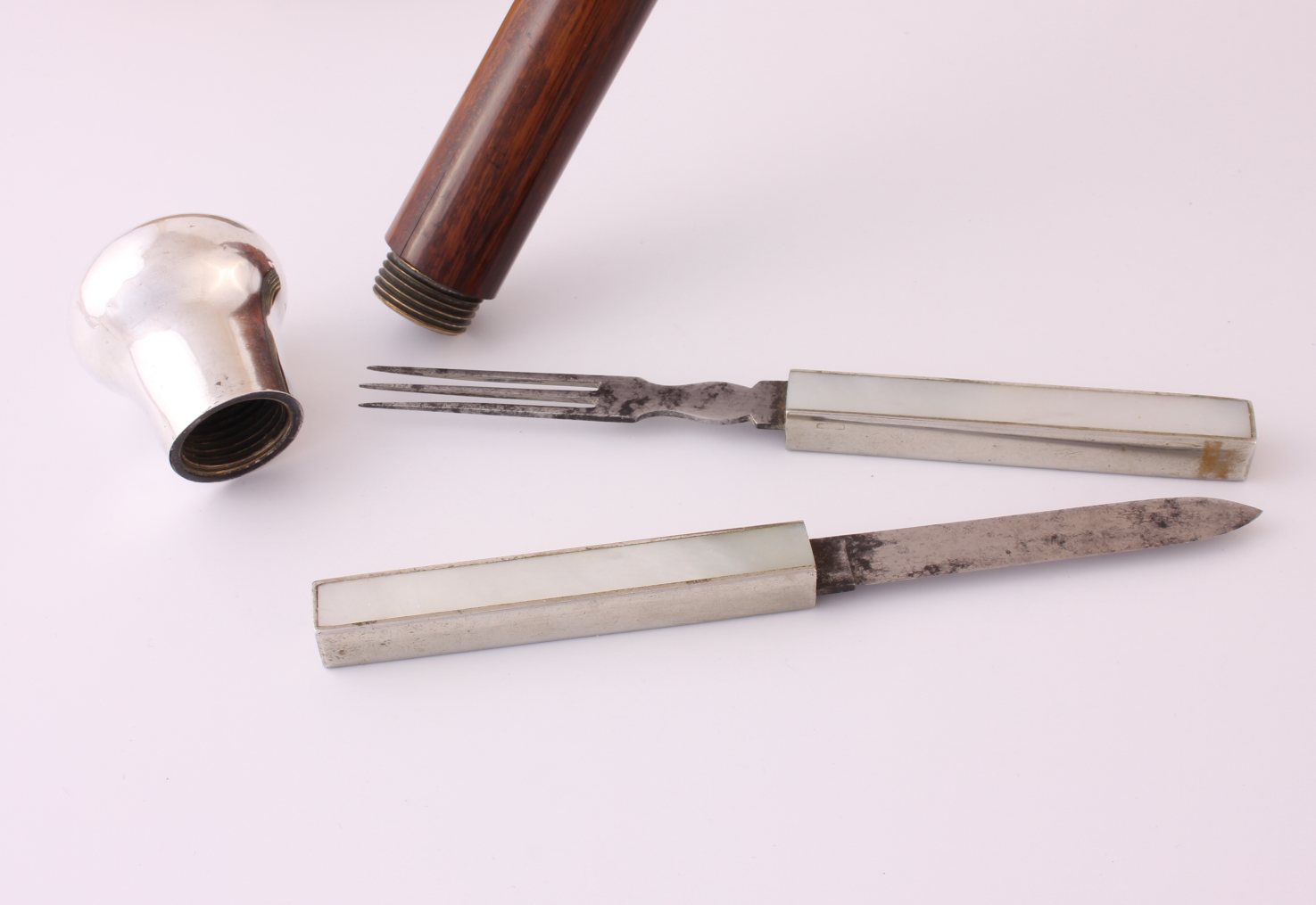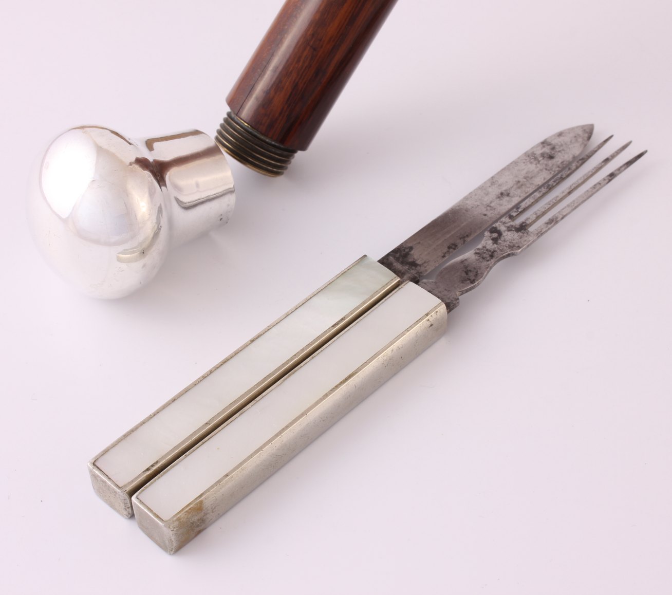This wonderful quality walking stick has a silver top which is fully hallmarked for 1923 which unscrews to reveal a hidden campaign knife and fork set with mother of pearl handles.