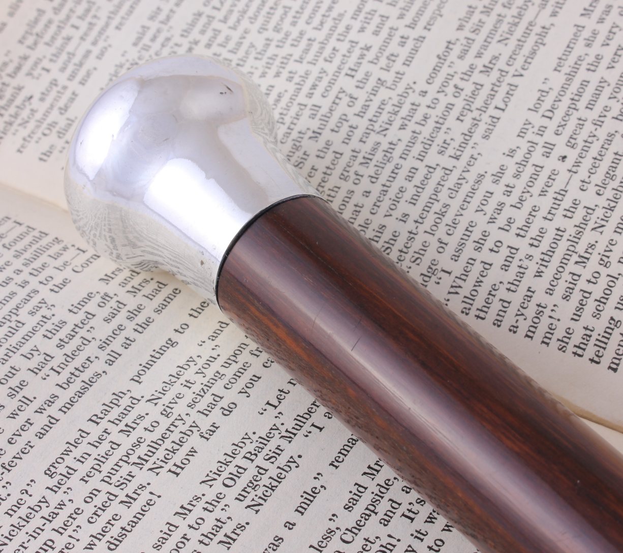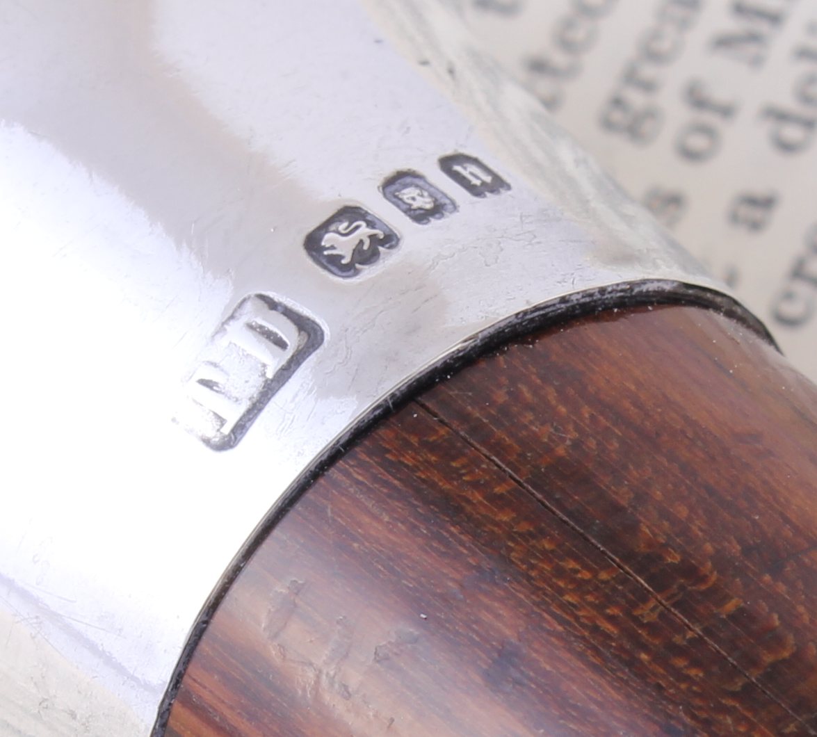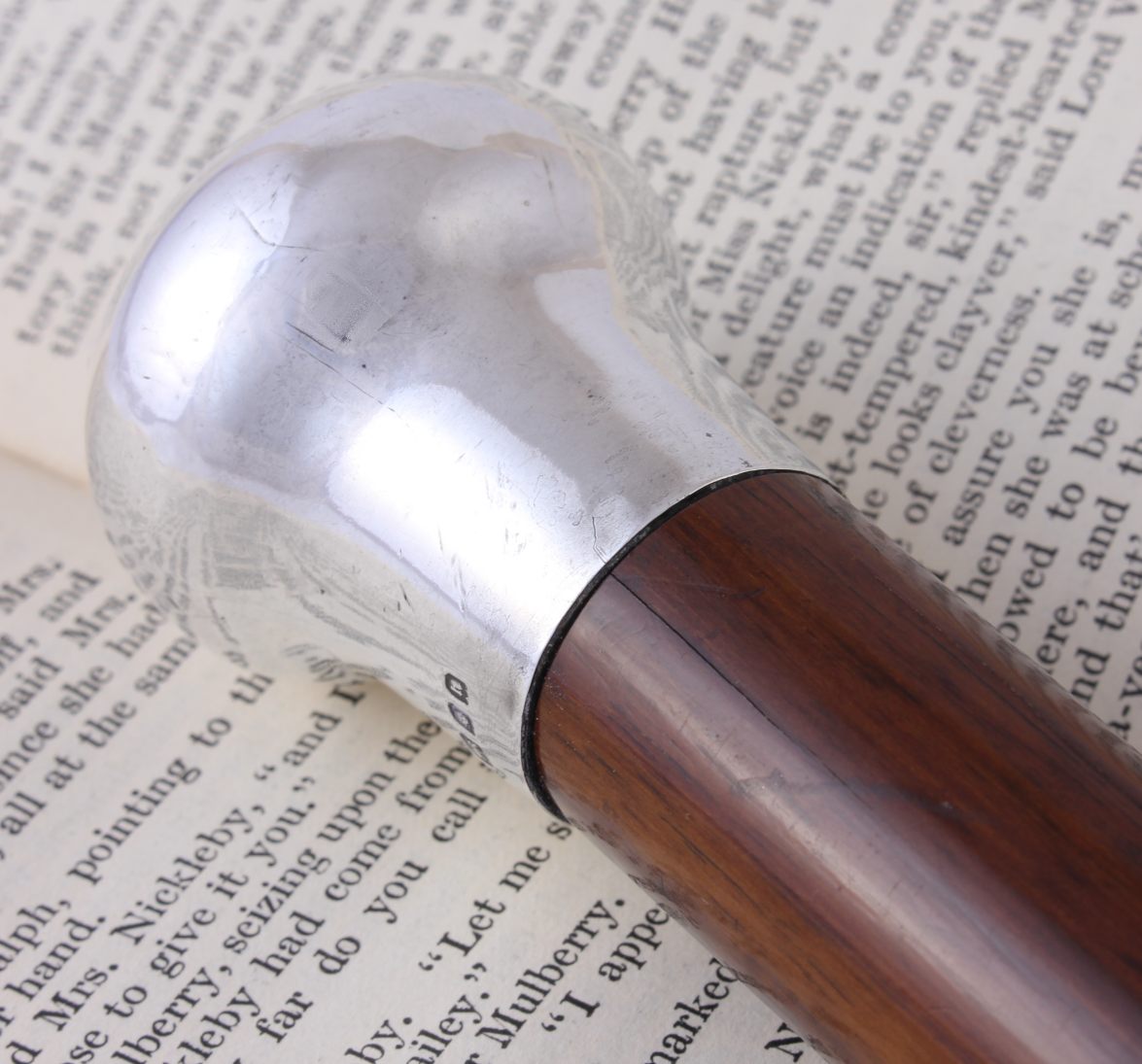This wonderful quality walking stick has a silver top which is fully hallmarked for 1923 which unscrews to reveal a hidden campaign knife and fork set with mother of pearl handles.