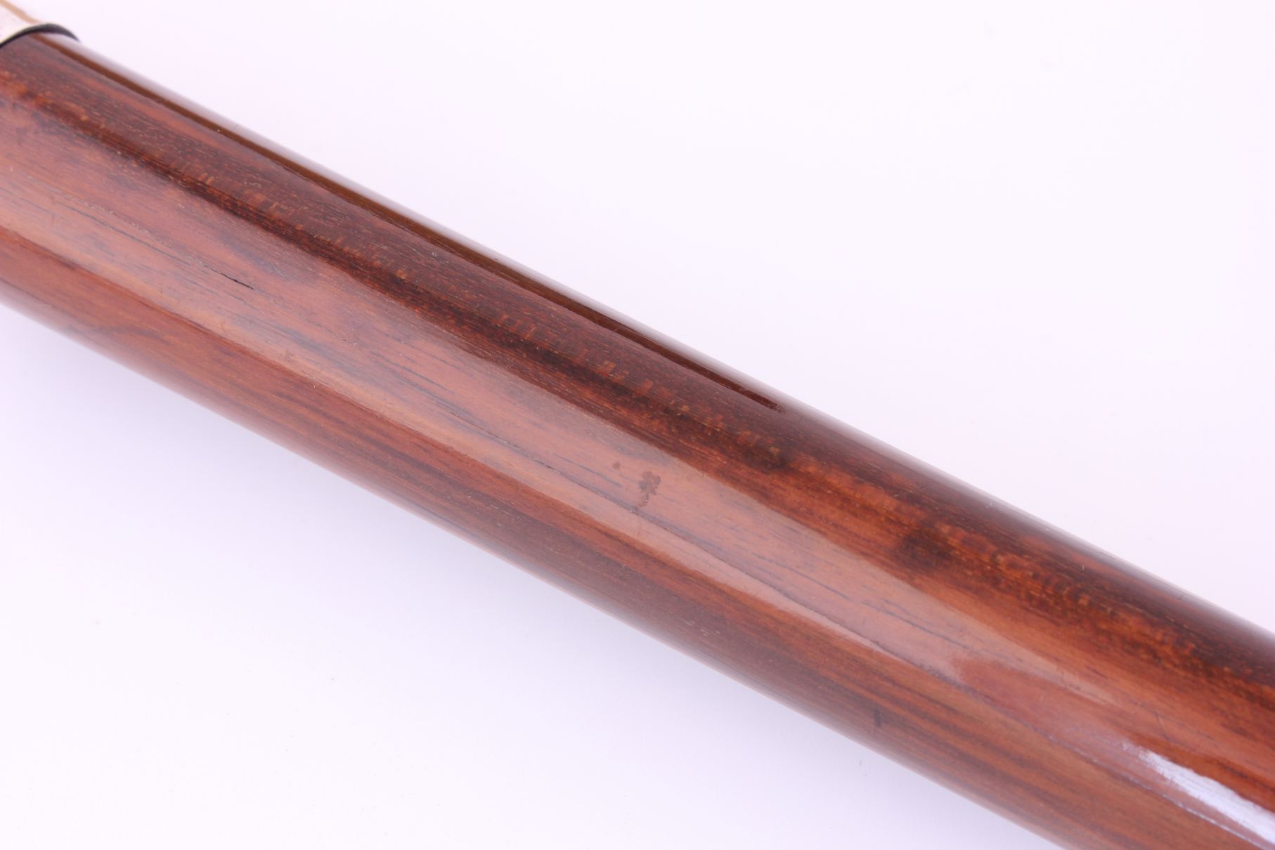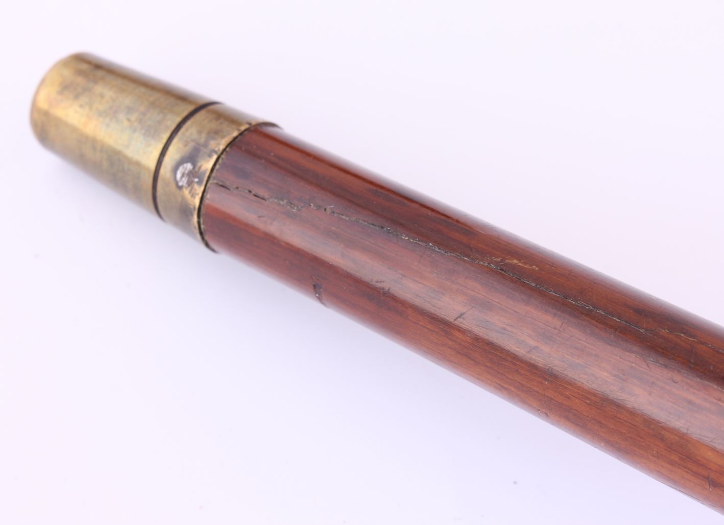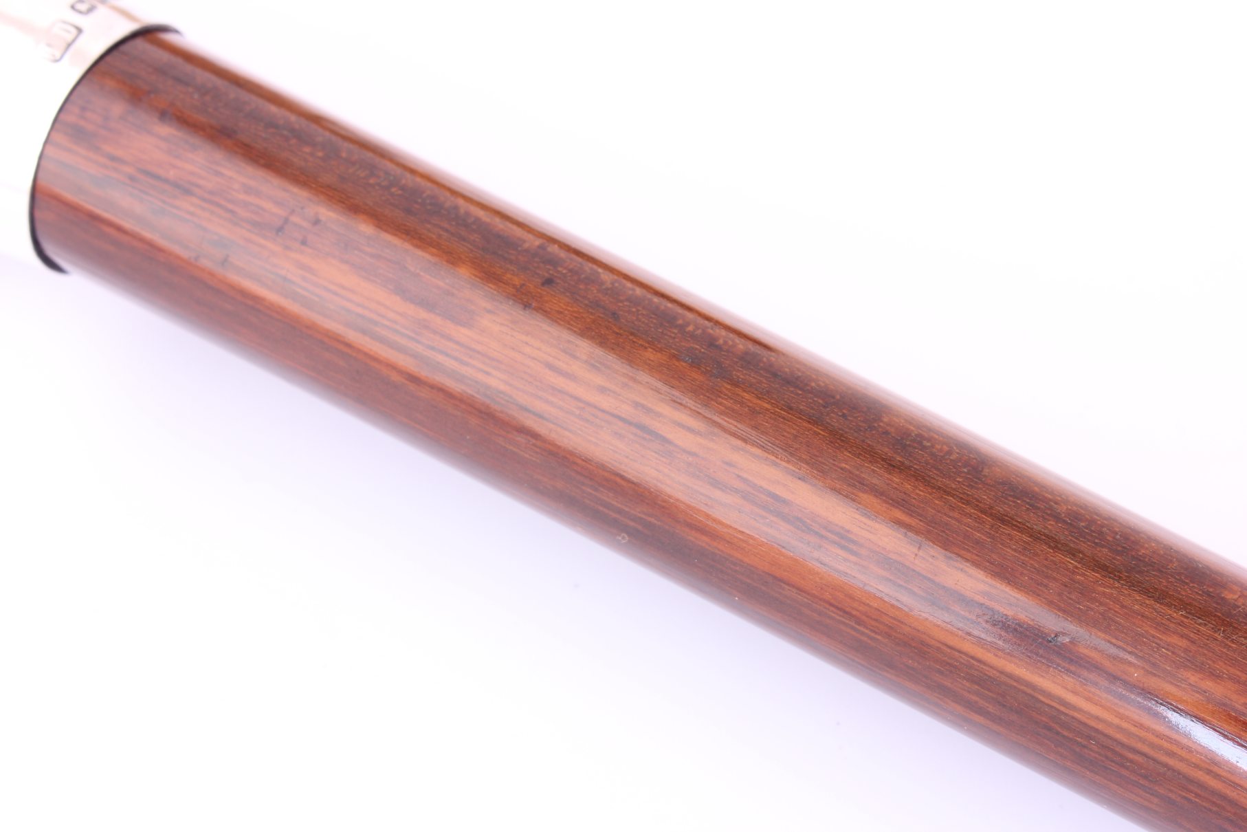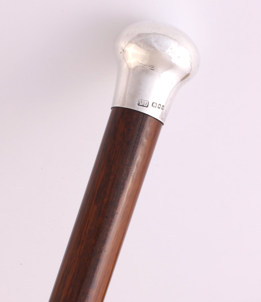 This wonderful quality walking stick has a silver top which is fully hallmarked for 1923 which unscrews to reveal a hidden campaign knife and fork set with mother of pearl handles.