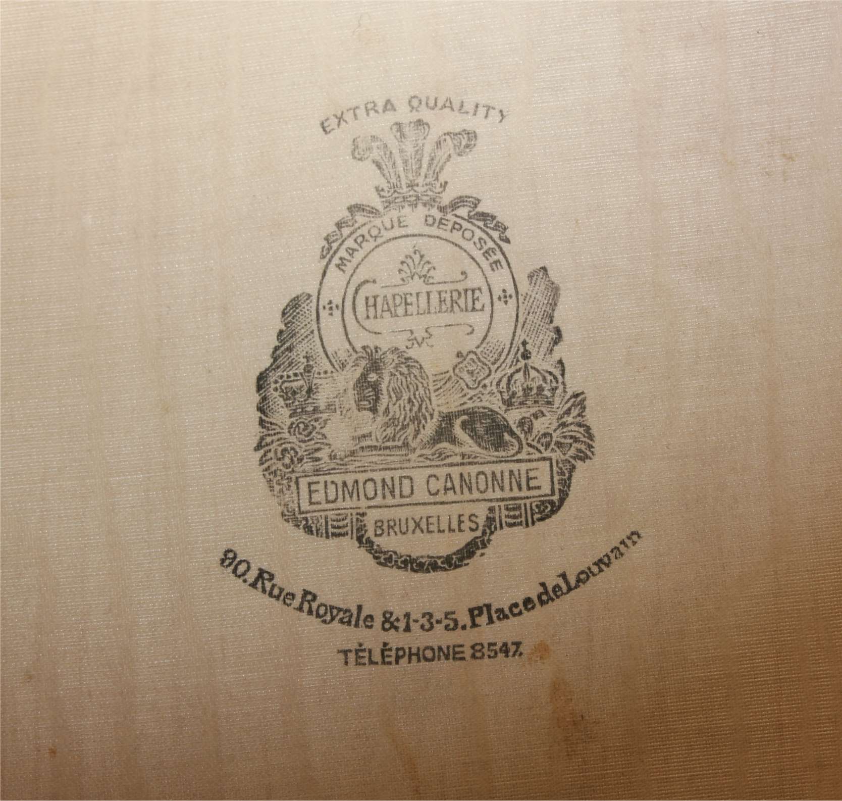 Makers details as shown inside hat: Edmond Canonne. 90 Rue Royale, Bruxelles, Belgium and 1-3-5 Place de Louvain. Telephone 8547. Marque Deposee. Extra Quality and Chapellerie.