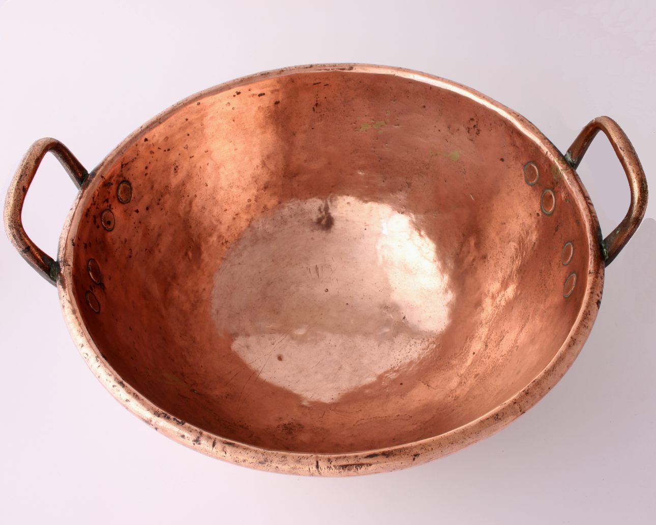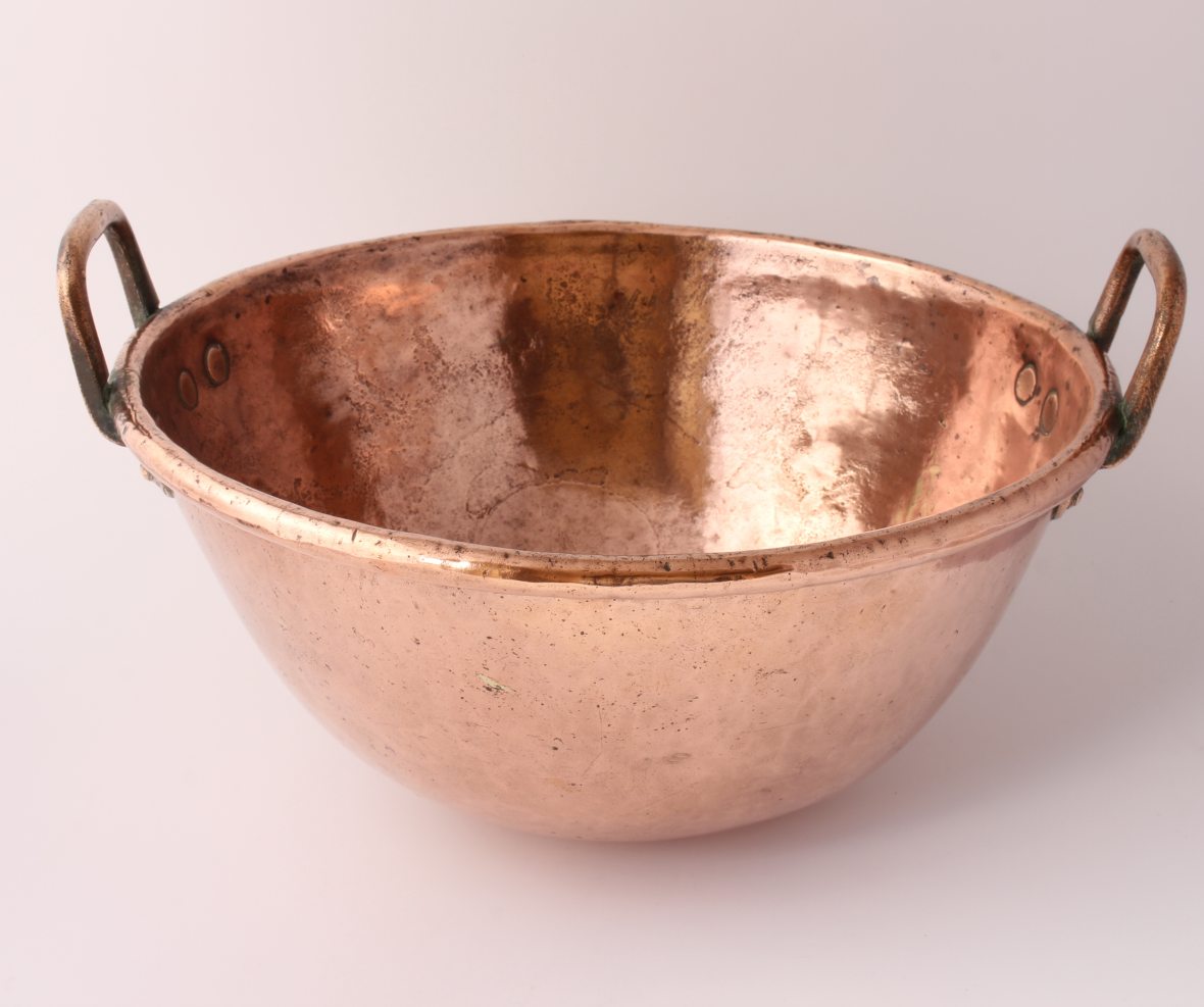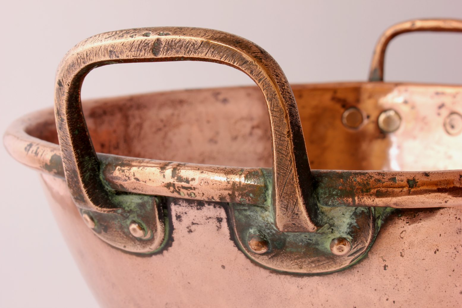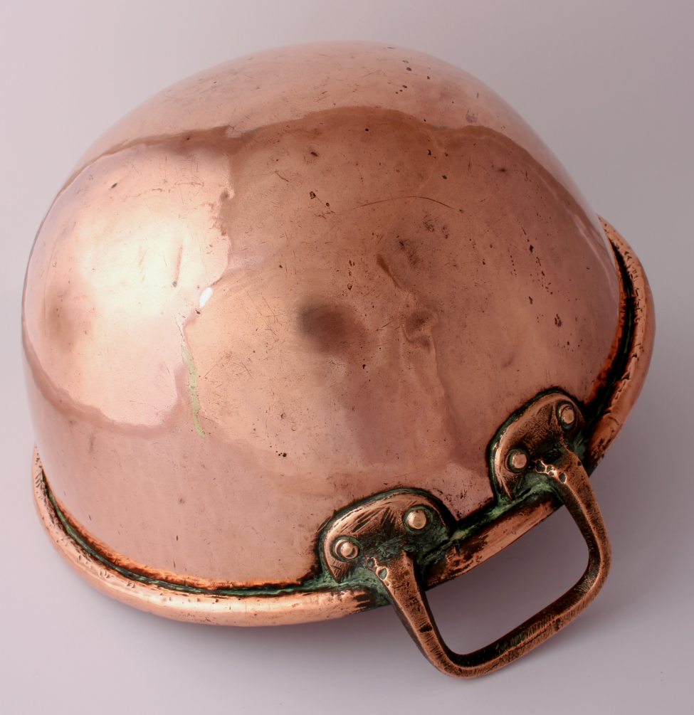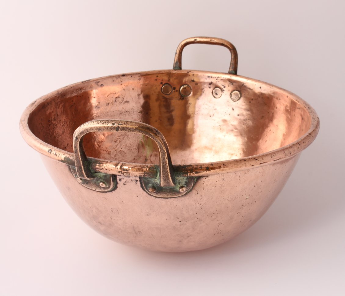 This large antique French copper chocolate bowl which dates from the 19th century has lots of aged character and a wonderful look.