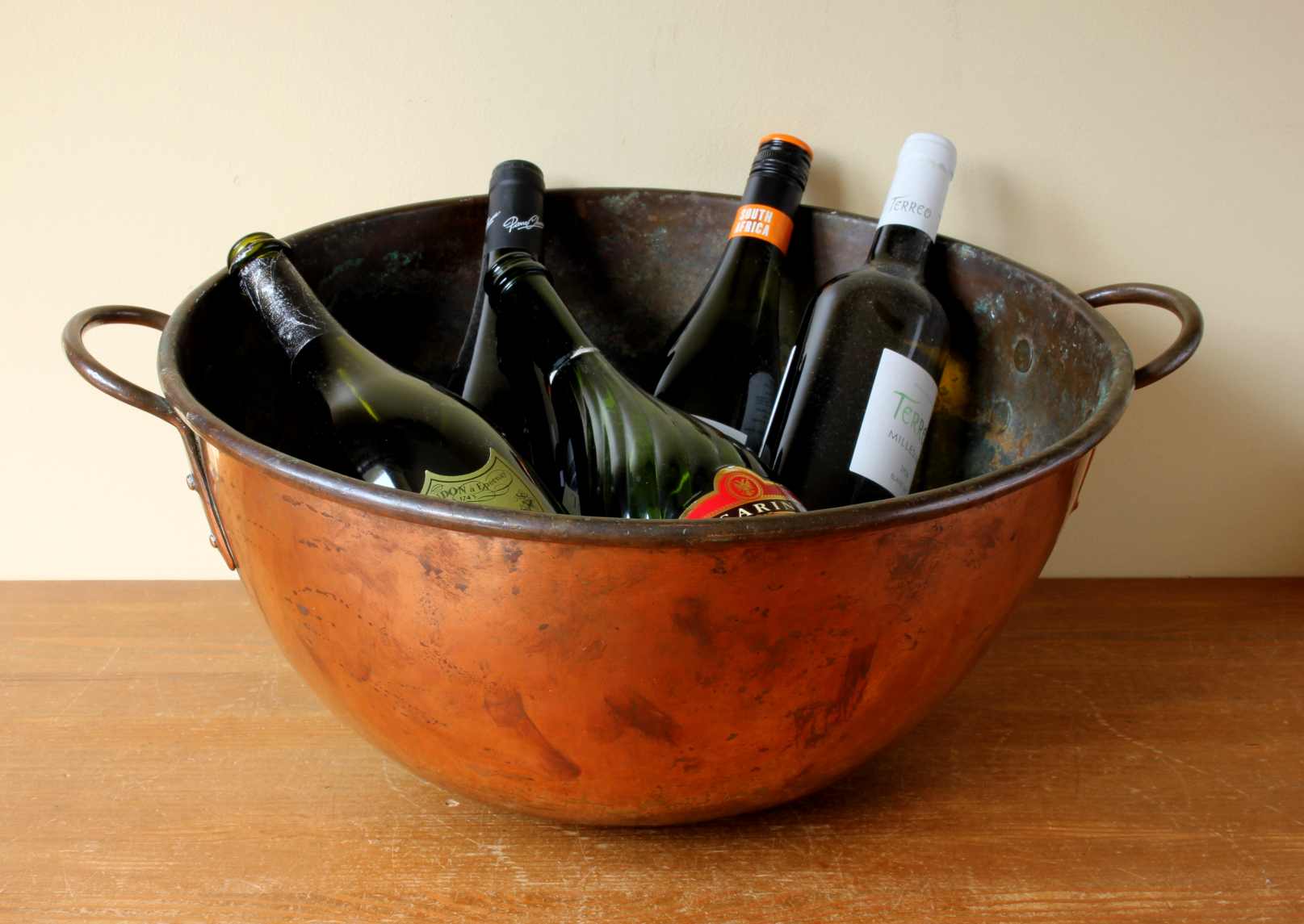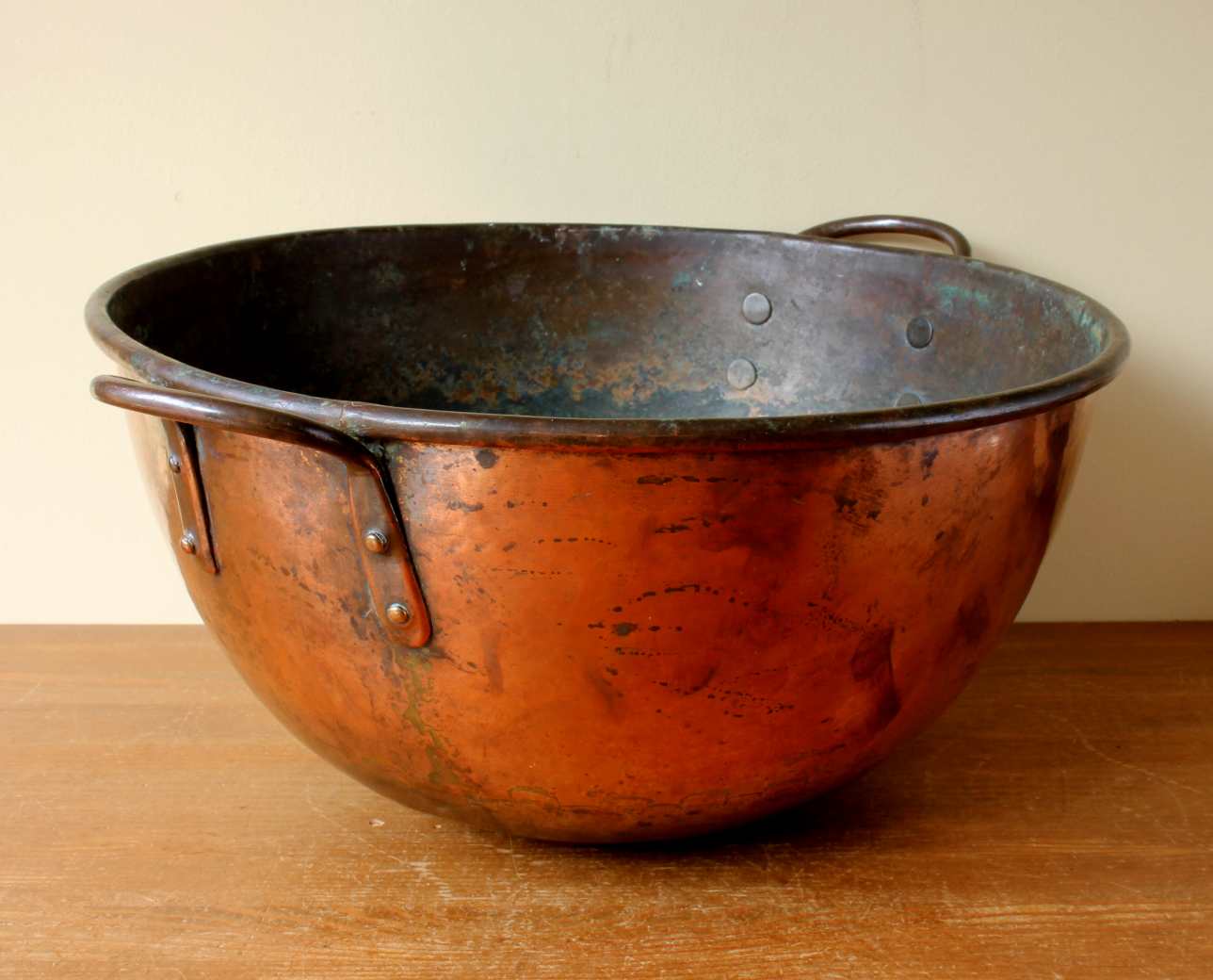 This antique chocolate mixing bowl which is a large size dates from the 19th century, is made of heavy copper, has a rolled rim, two riveted handles and a round bottom. The handmade folded seam runs around the base and up the side.