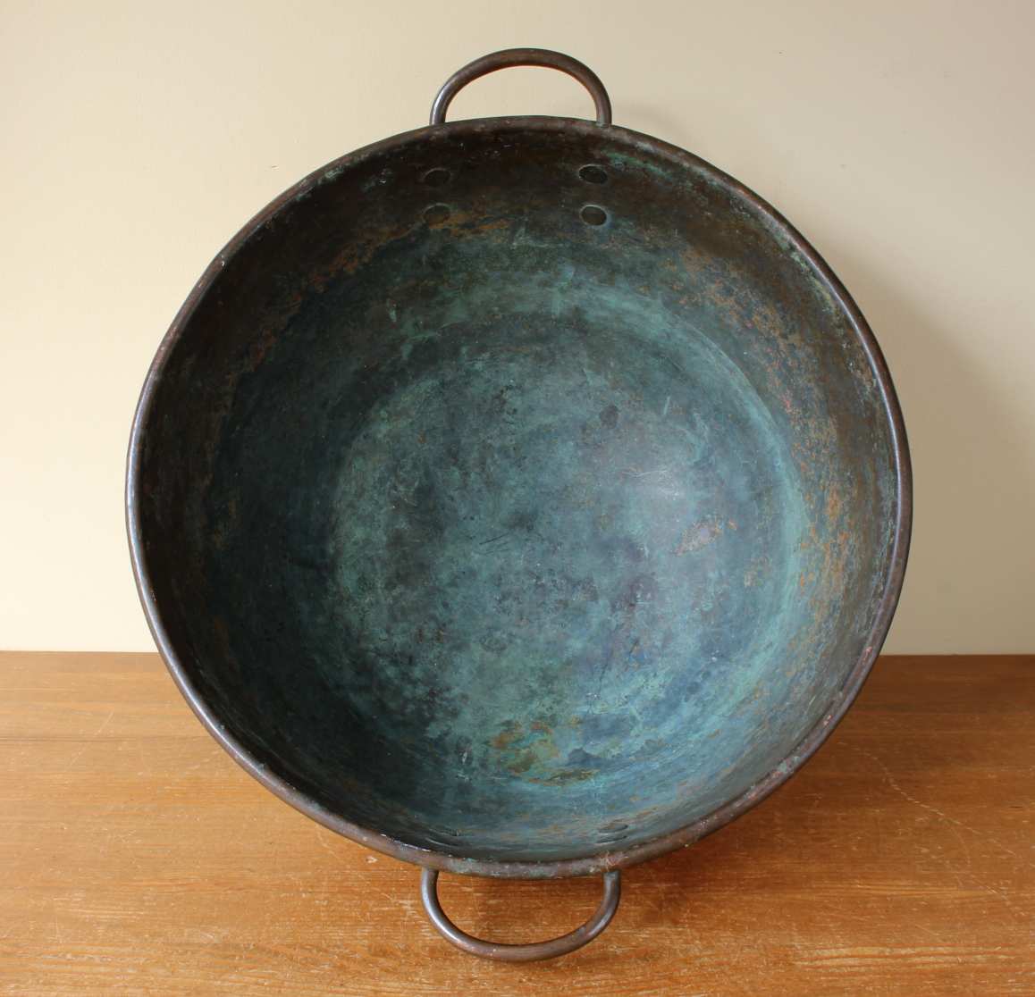 Condition: Wonderful decorative antique condition with signs of wear and use in keeping with age. No holes. Some dents, dings, bumps, scratches, verdigris and patina. The bottom is rounded and is blackened from the heat. The bowl sits on a flat surface but slightly uneven. Please see pictures.