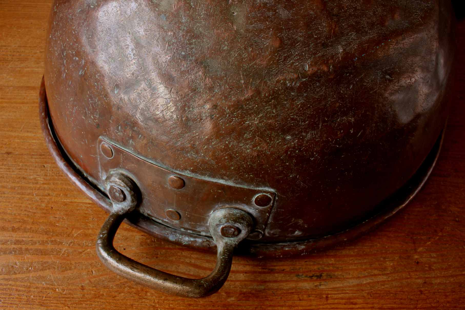 Condition: Wonderful decorative antique condition with signs of wear and use in keeping with age. No holes. All over dents, dings, bumps, scratches and verdigris leaving a wonderful patina. The bottom is rounded but sits on a flat surface. Please see pictures.