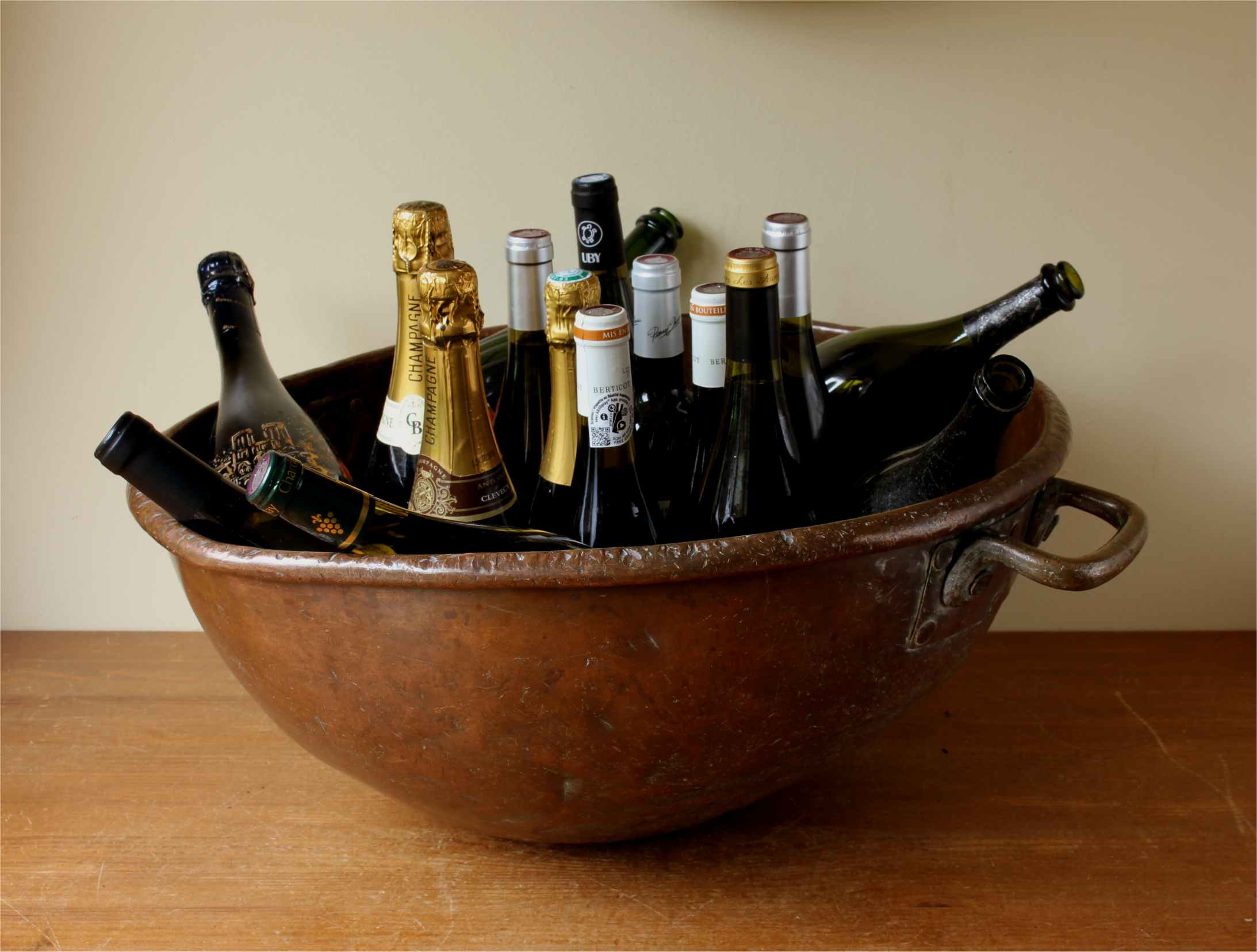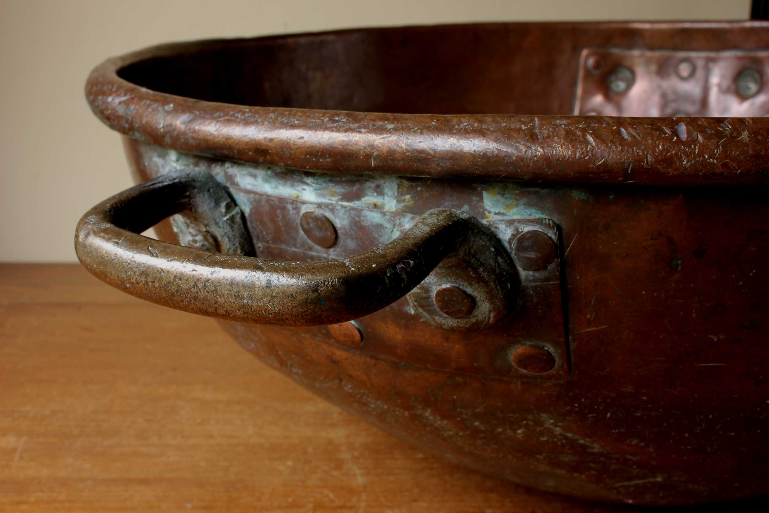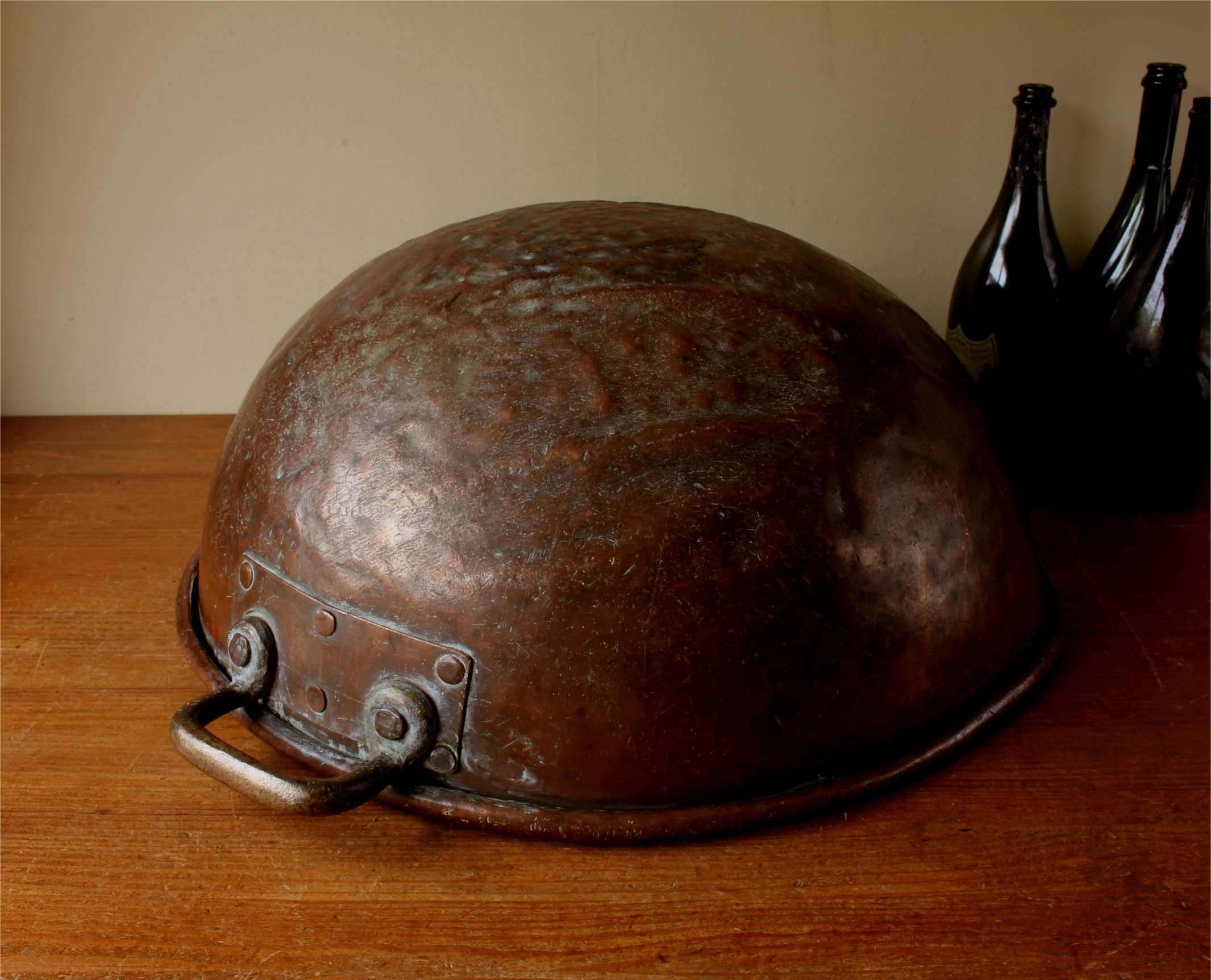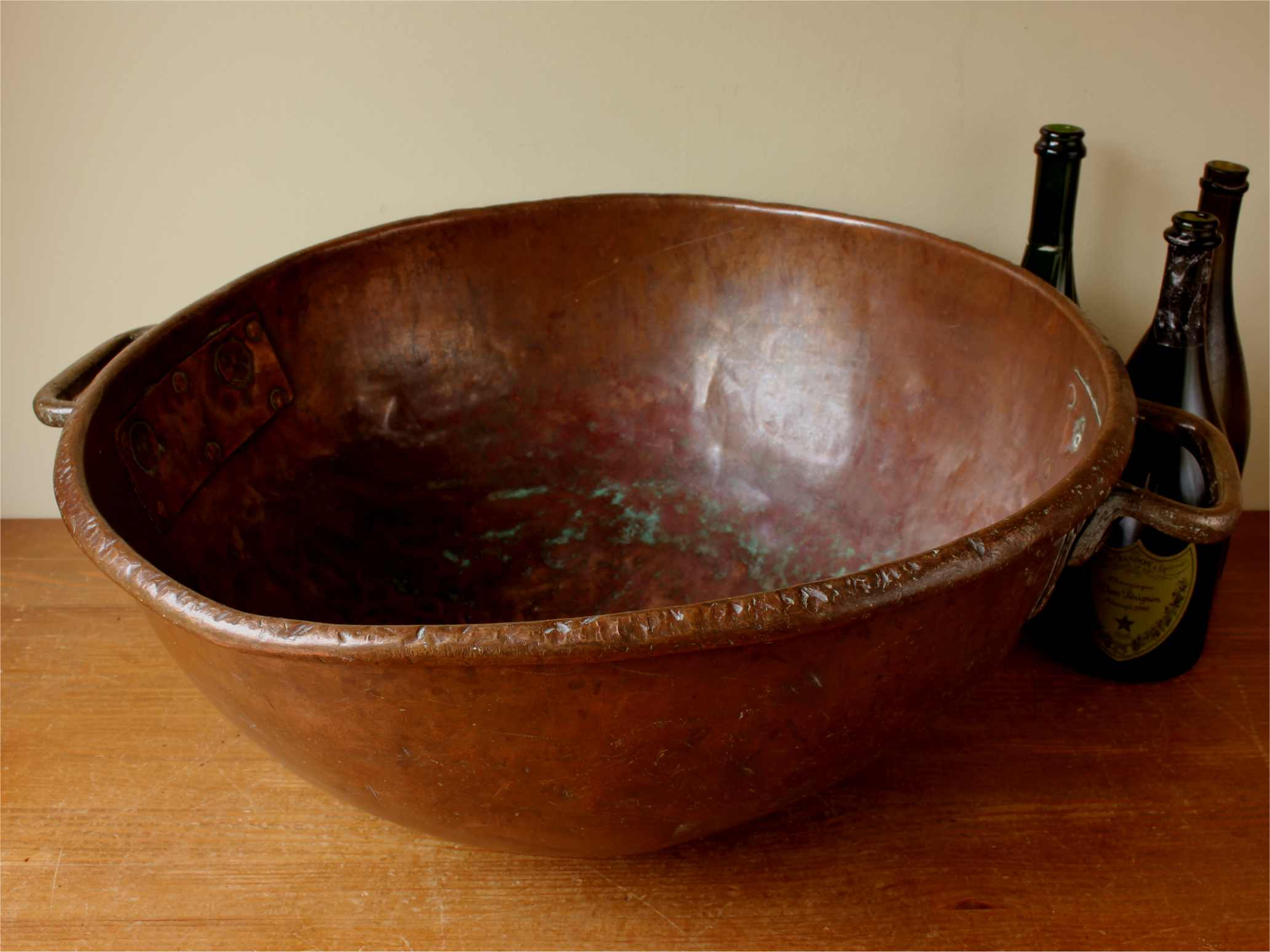 This huge antique chocolate mixing bowl which makes a stunning wine cooler is a very large size, made of heavy copper and dates from c1900.