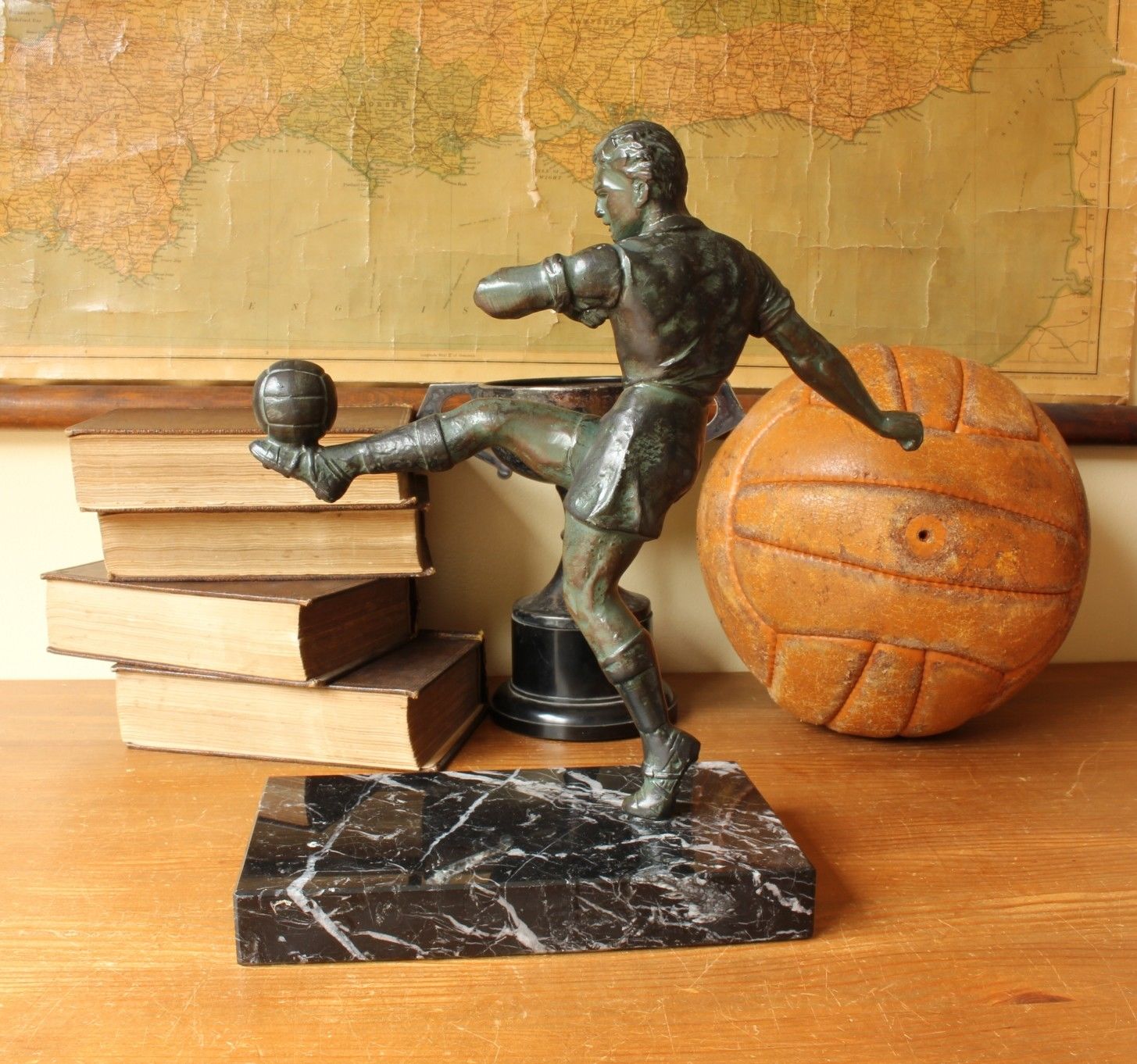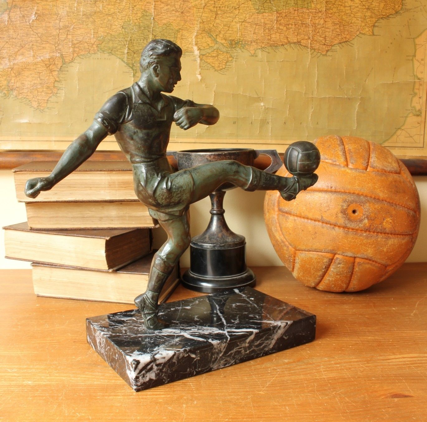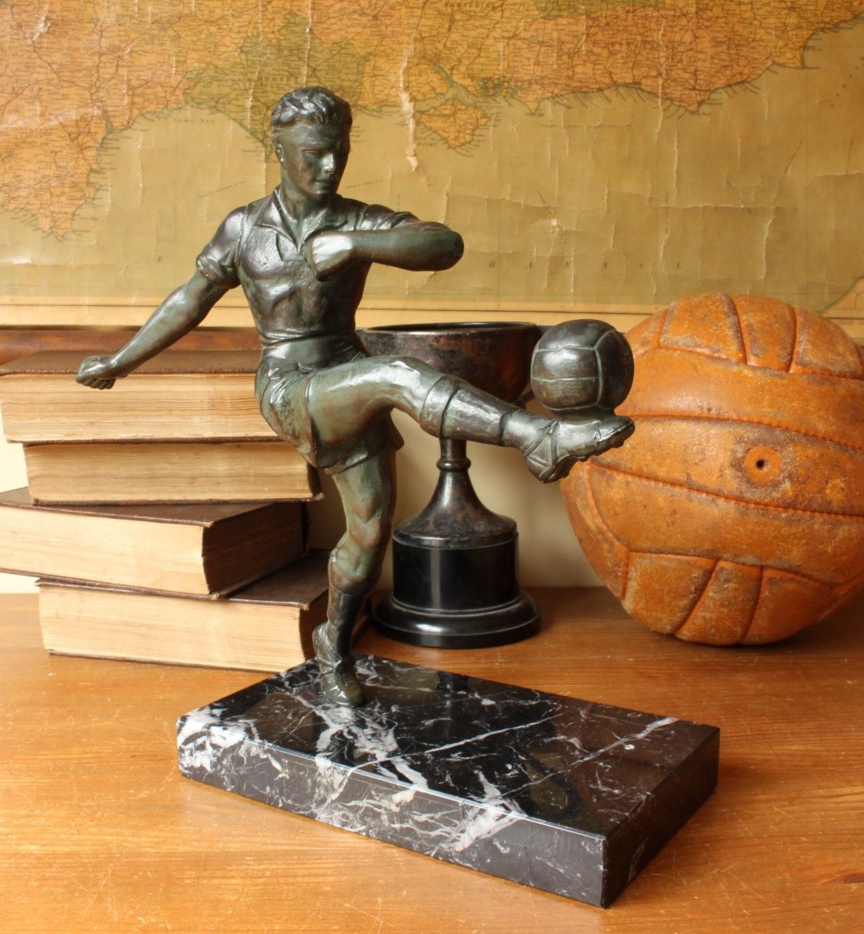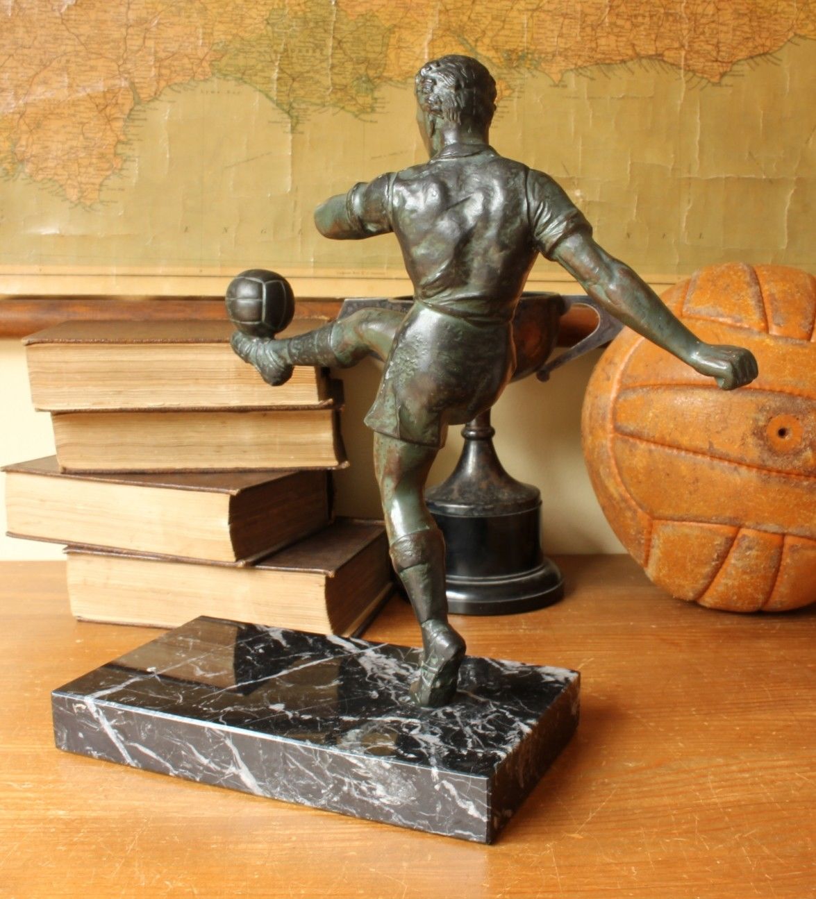 This large original 1920 / 30's football statue is of an early footballer kicking a ball into the air. This handsome figure is made of cast metal with a patinated bronze effect finish and is mounted on a black marble base.
