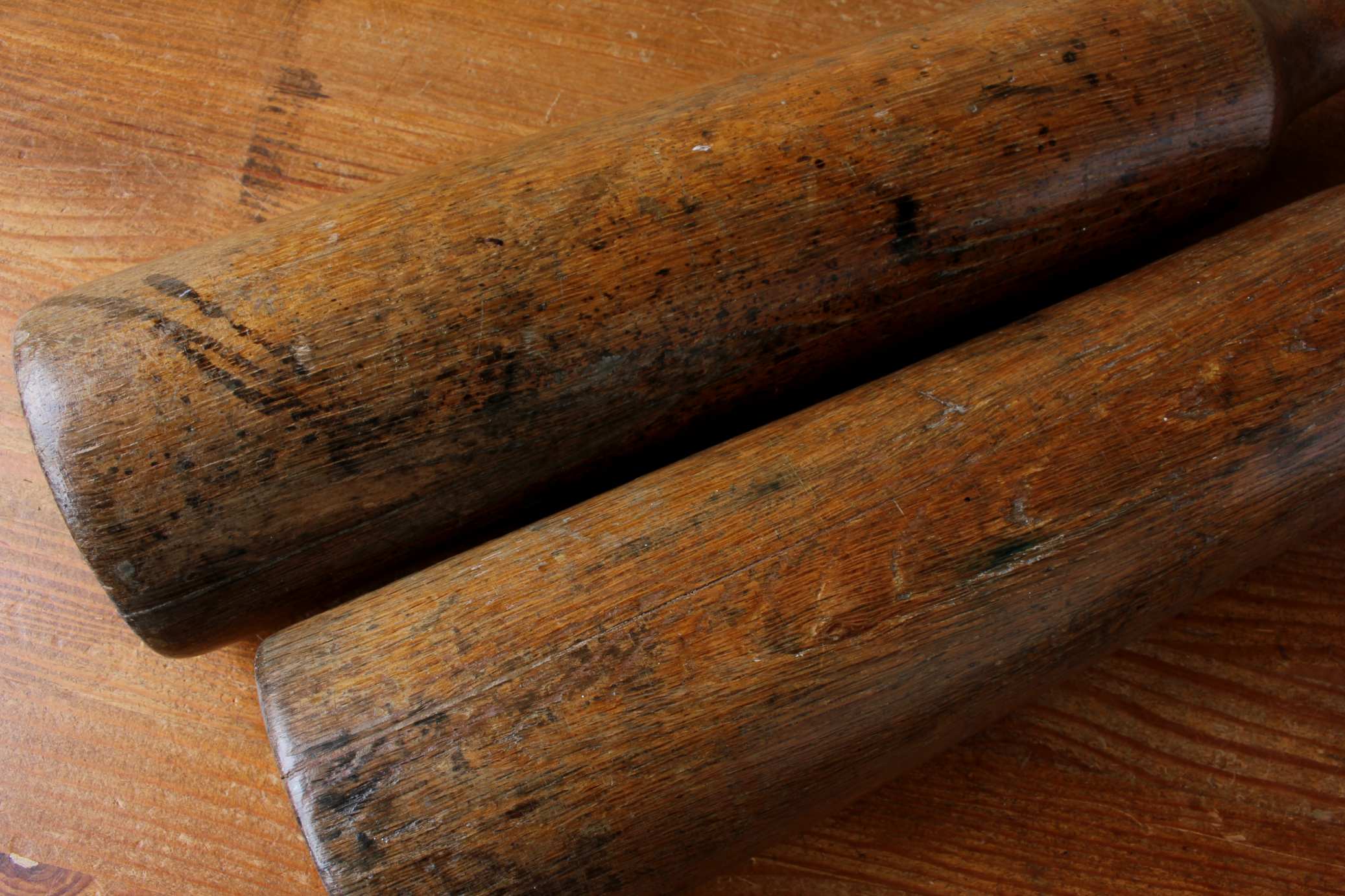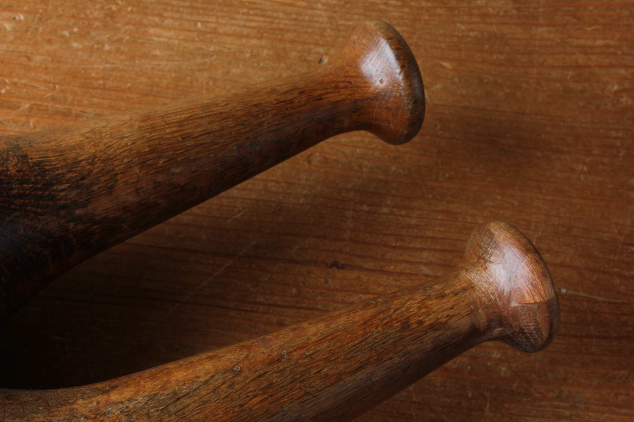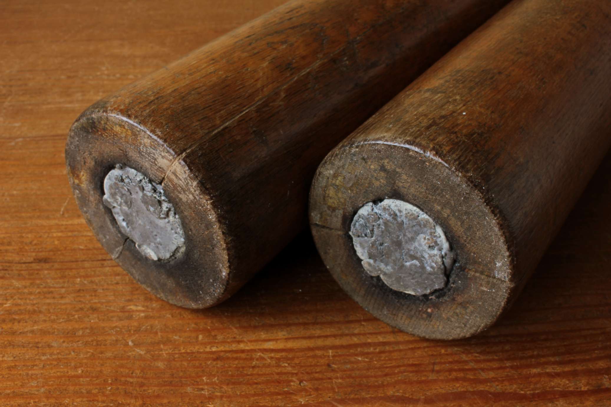 These two exercise clubs have an unusual shape, have lead weights fitted to the insides so are extra heavy at just over 3 kg each and have a beautiful patina.
