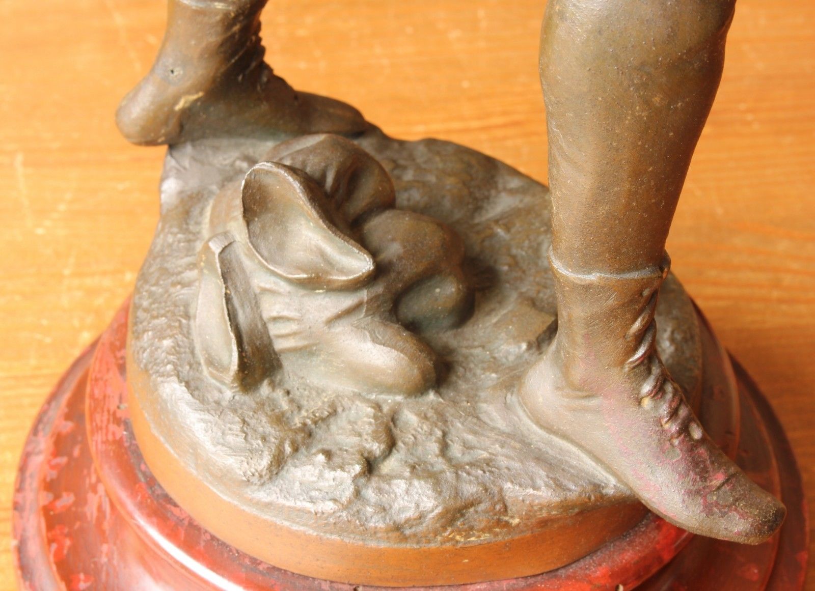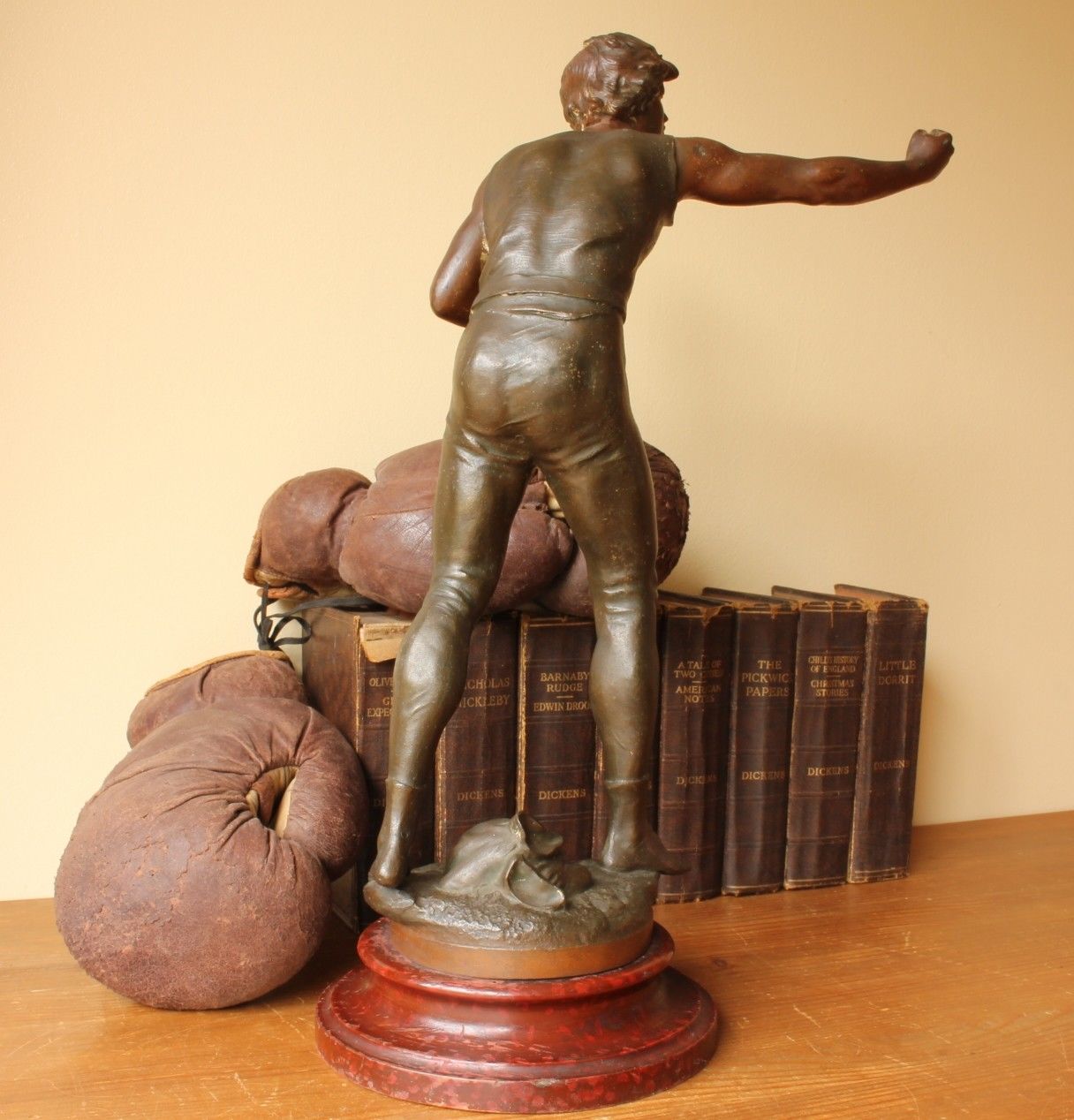 This original antique French boxer statue is of a young male bare knuckle fighter with gloves removed and placed by his feet.