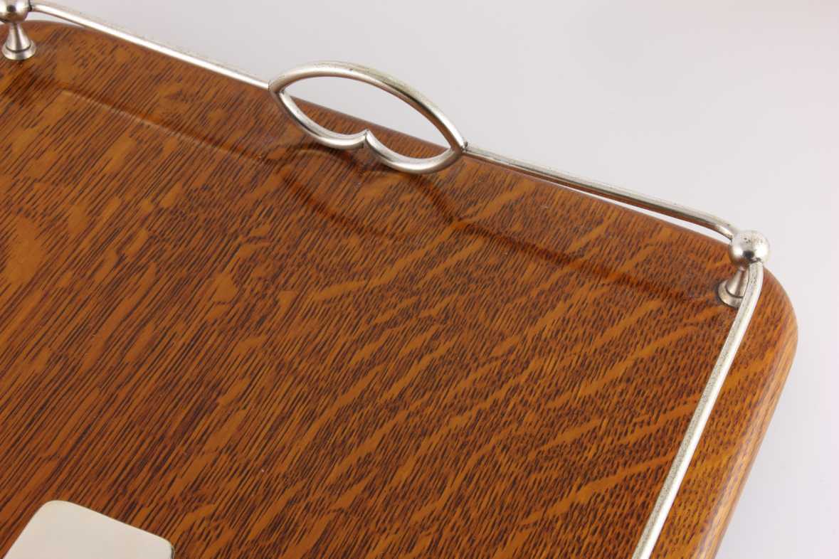 This stylish tray which is rectangular in shape is made of English oak with silver plated fittings and gallery.