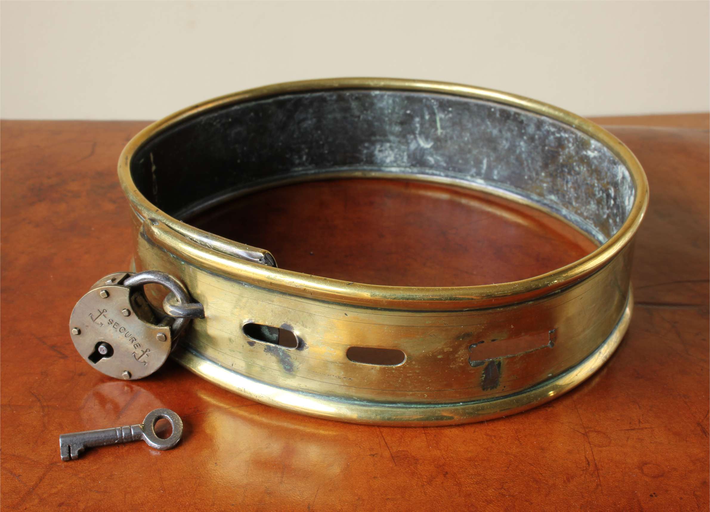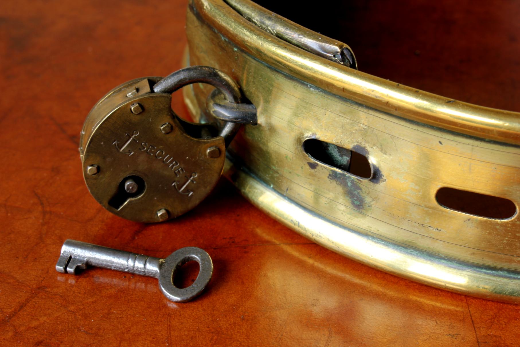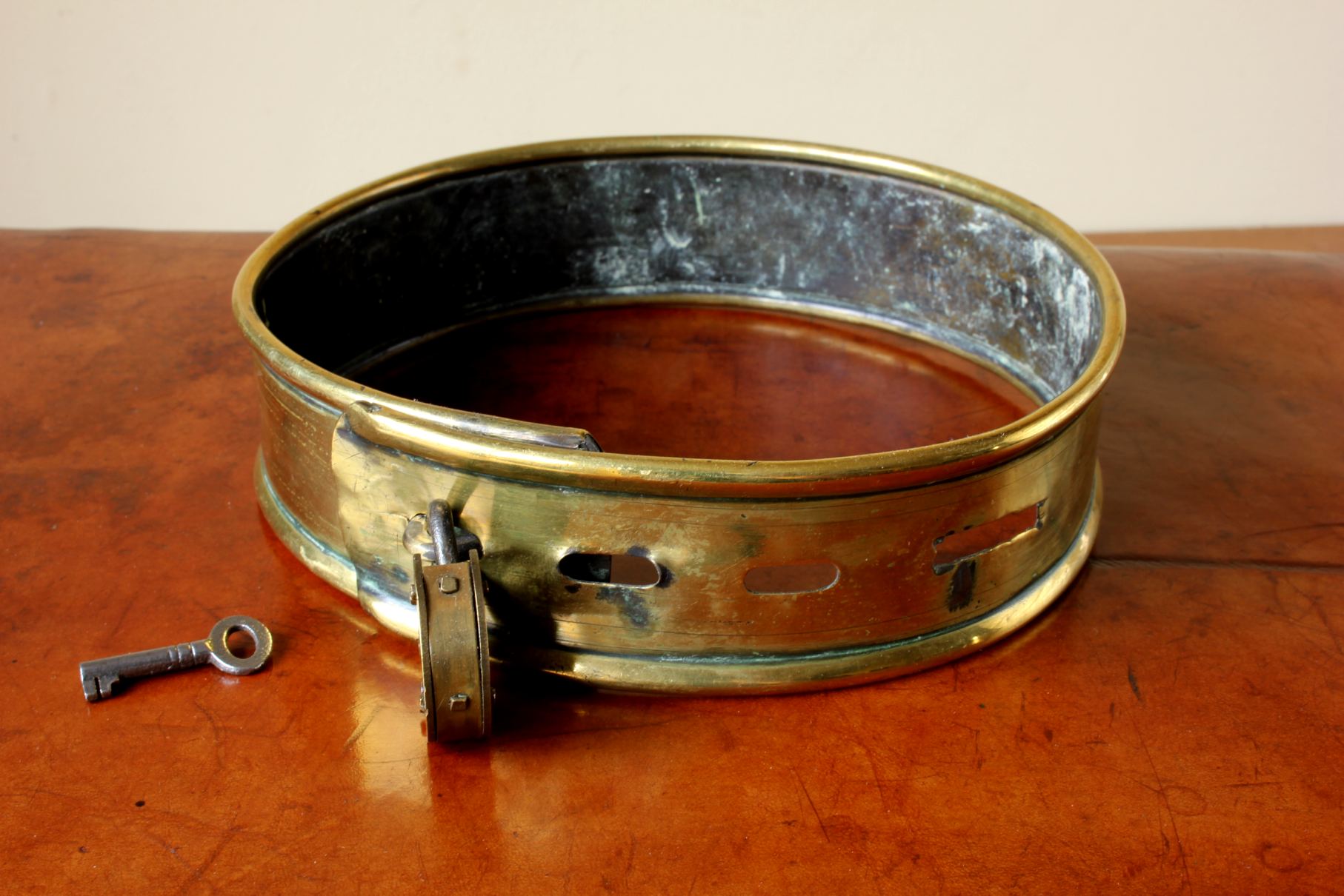 This large Victorian dog collar which is made of brass comes with rolled rims, is adjustable with four slots and dates from the 19th century.