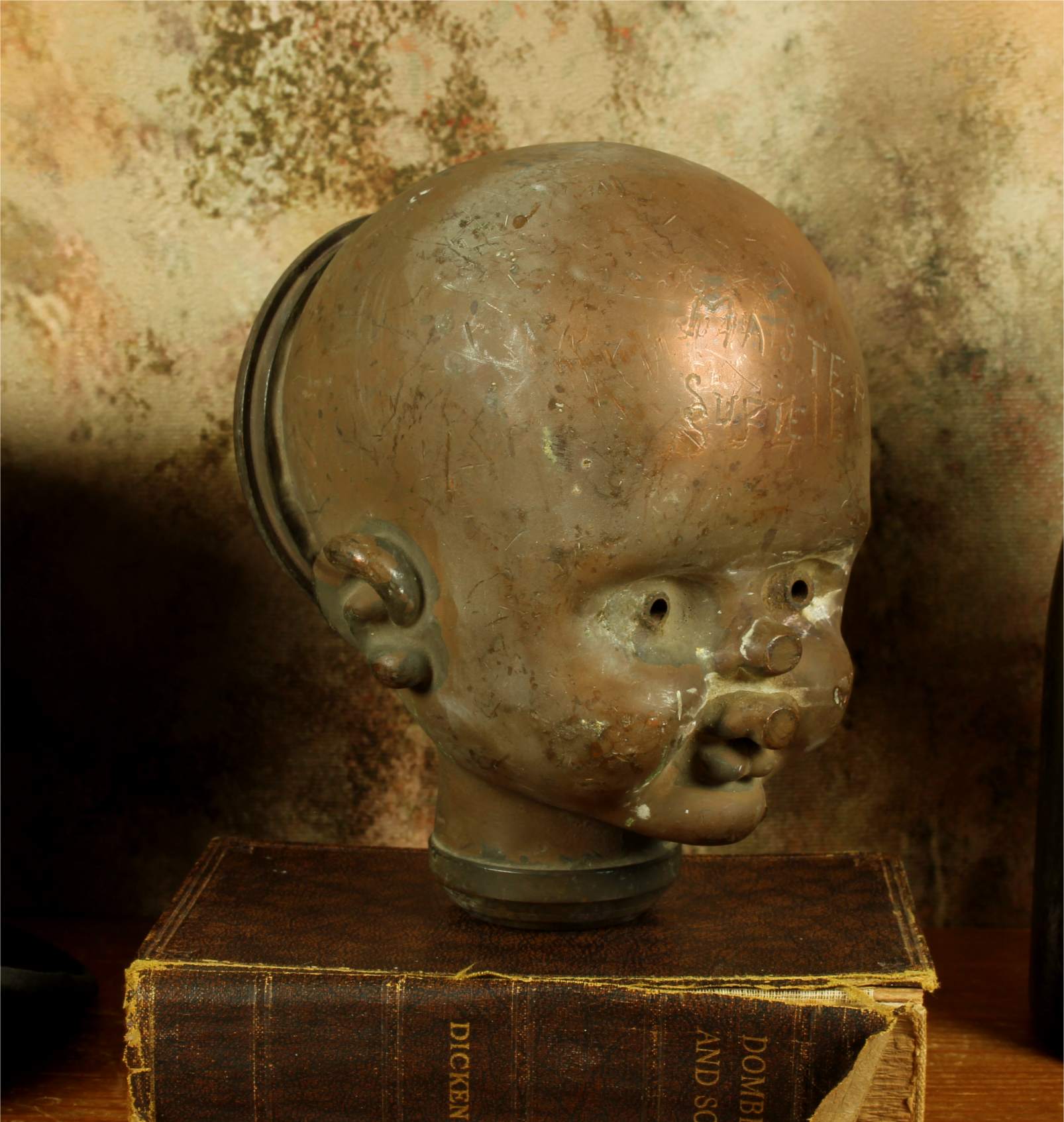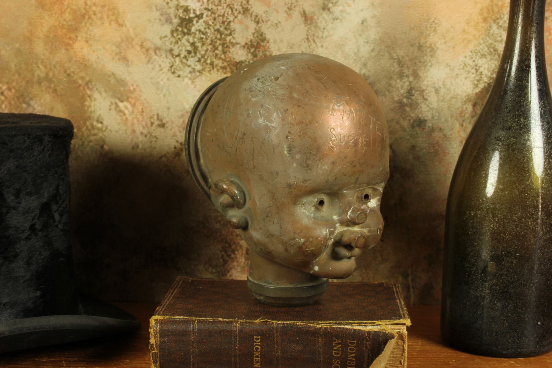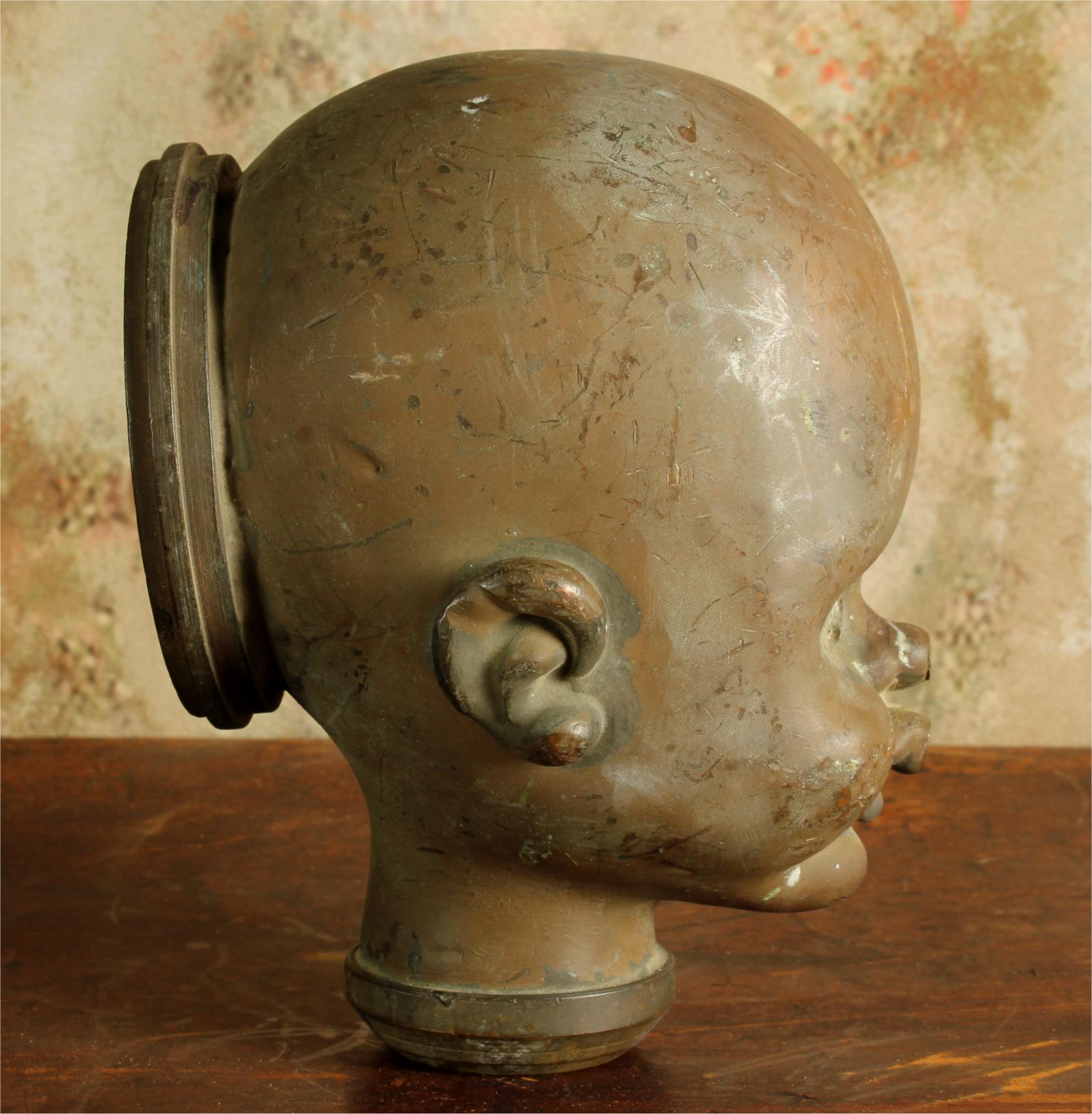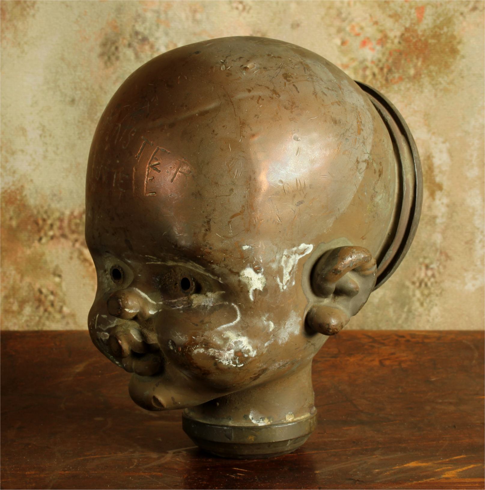 This large size doll head mould which dates from the mid 20th century is made of heavy copper and came from Bella Doll factory in Perpignan, France.