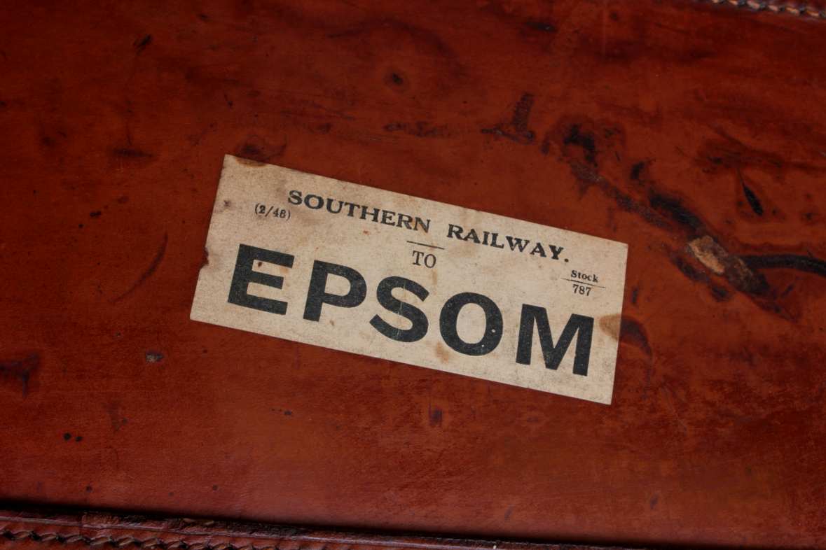 The leather has a wonderful aged look with a warm rich colour, both brass locks/clasps are stamped with WB and work but we do not have the keys, there is an original old railway label for Epsom on the side and the case is monogrammed J.K.H.R under the handle. The base and back have brass feet to protect the leather when sat on the floor, the handle is nice and sturdy and the inside features two leather fastening straps.