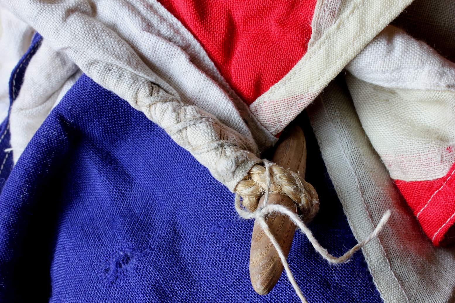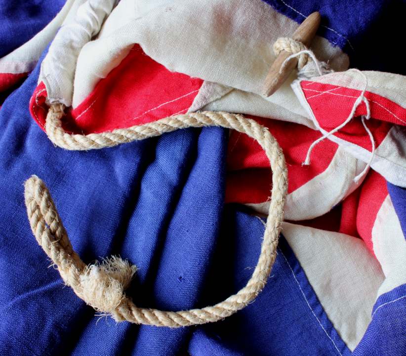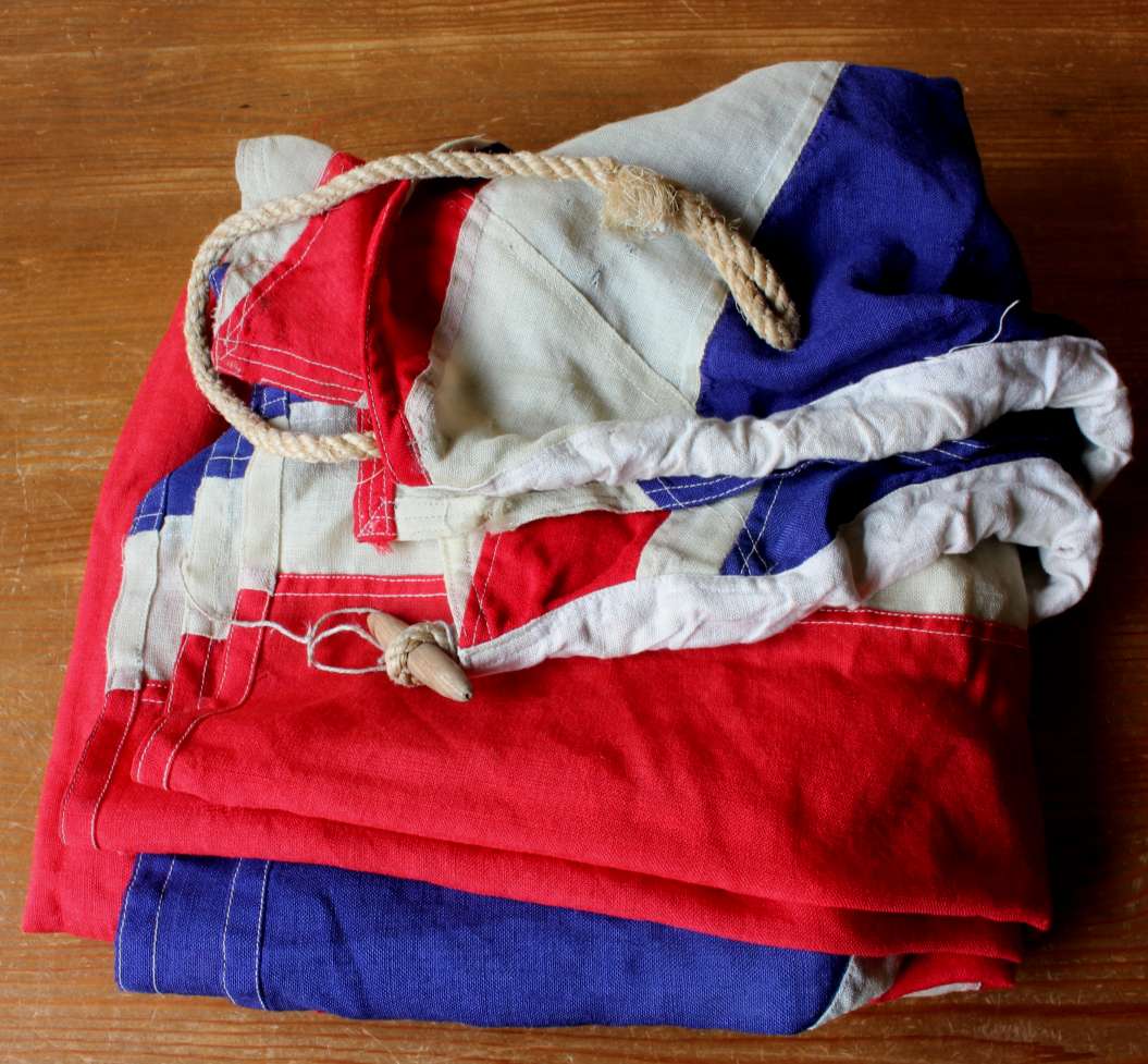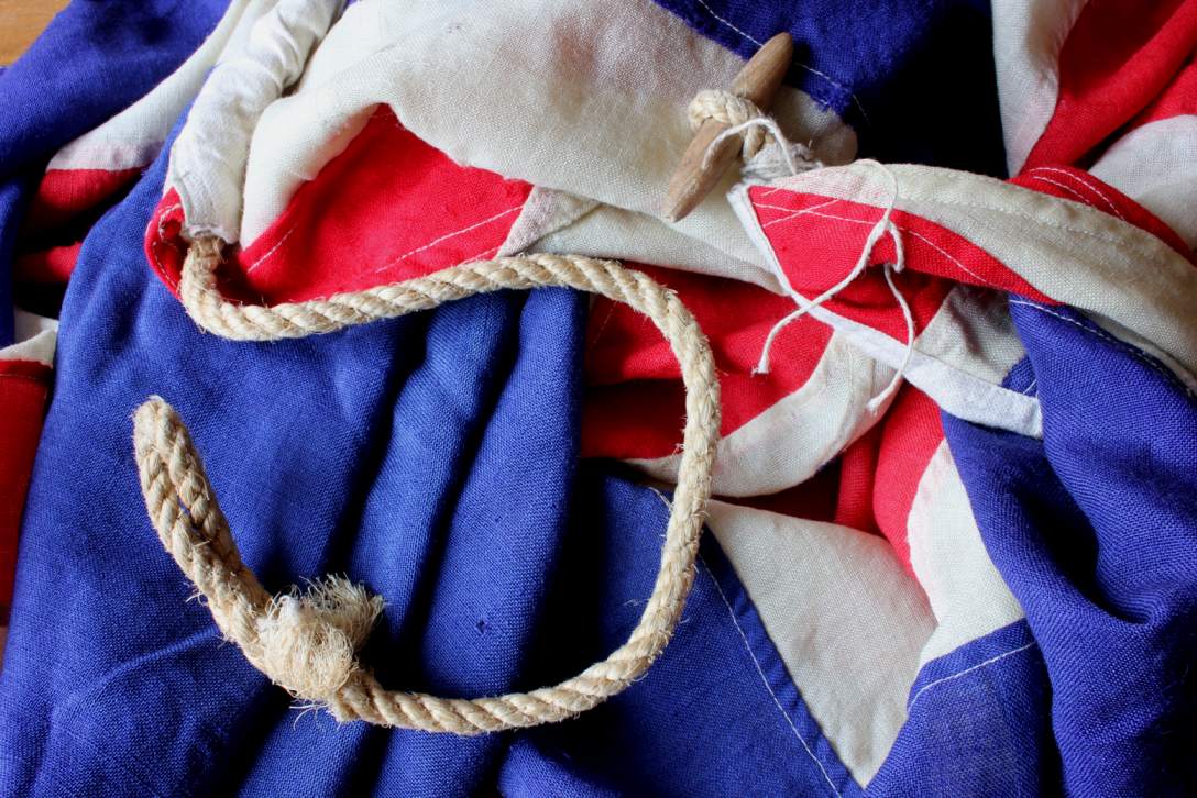 This large original vintage Union Jack Flag which has each segment individually sewn, halyard rope, wooden toggle and dates from the middle of the 20th century is a good size at 8 1/2 feet in length and approx 4 1/2 feet wide.