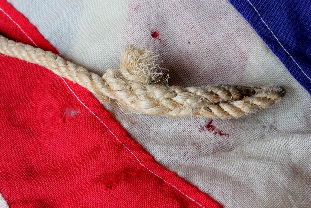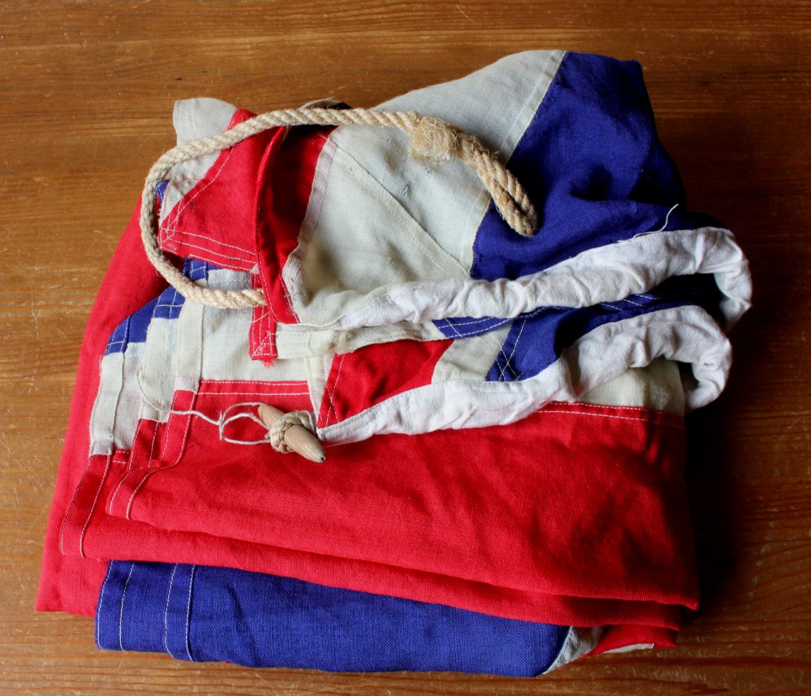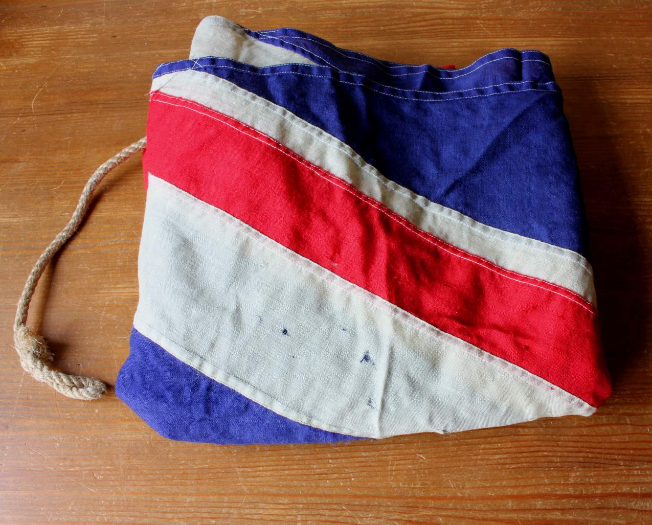 This large original vintage Union Jack Flag which has each segment individually sewn, halyard rope, wooden toggle and dates from the middle of the 20th century is a good size at 8 1/2 feet in length and approx 4 1/2 feet wide.