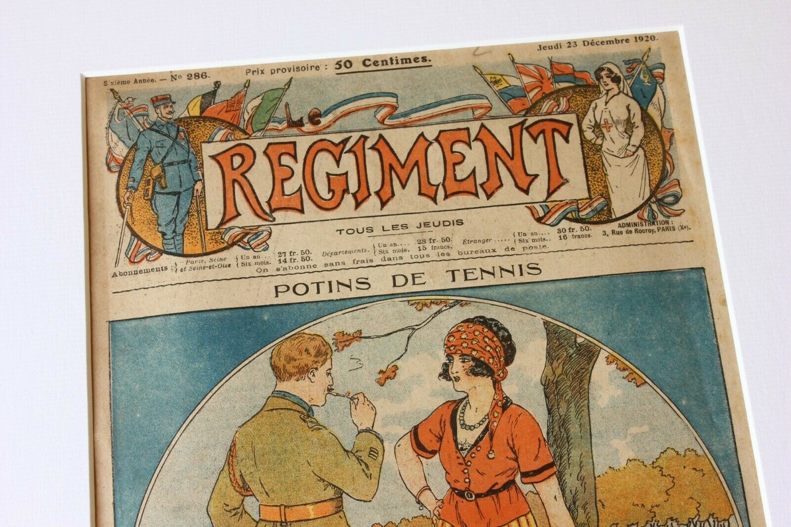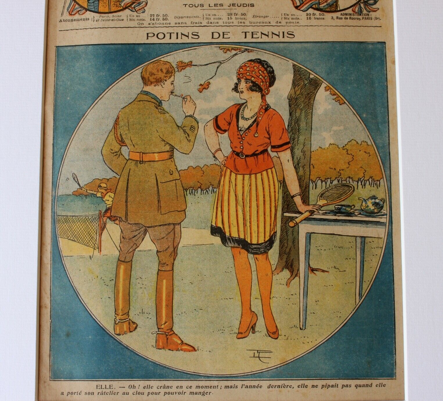 This stylish and scarce antique print is the front cover of the French magazine Le Regiment which was a light hearted magazine published weekly for the troops during WW1. This wonderful original picture which is from the 23 December 1920 edition is in colour and features a young lady about to play a game of tennis with somebody playing in the background.