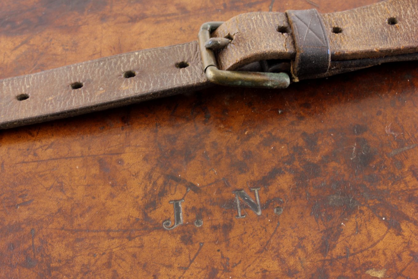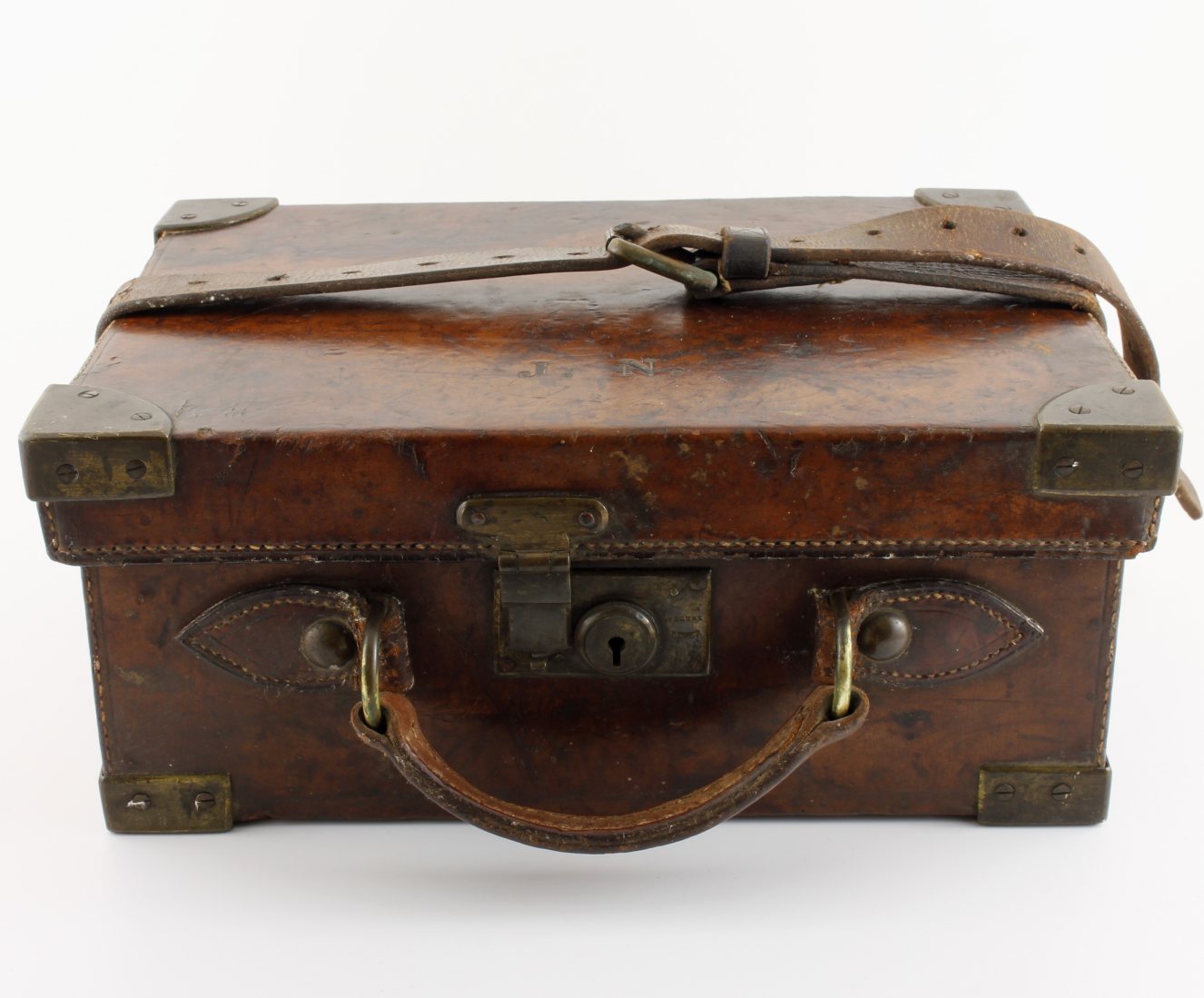 The interior is divided into 4 compartments which are fitted with leather lifting straps and the outside is nicely monogrammed with J.N to the top.
