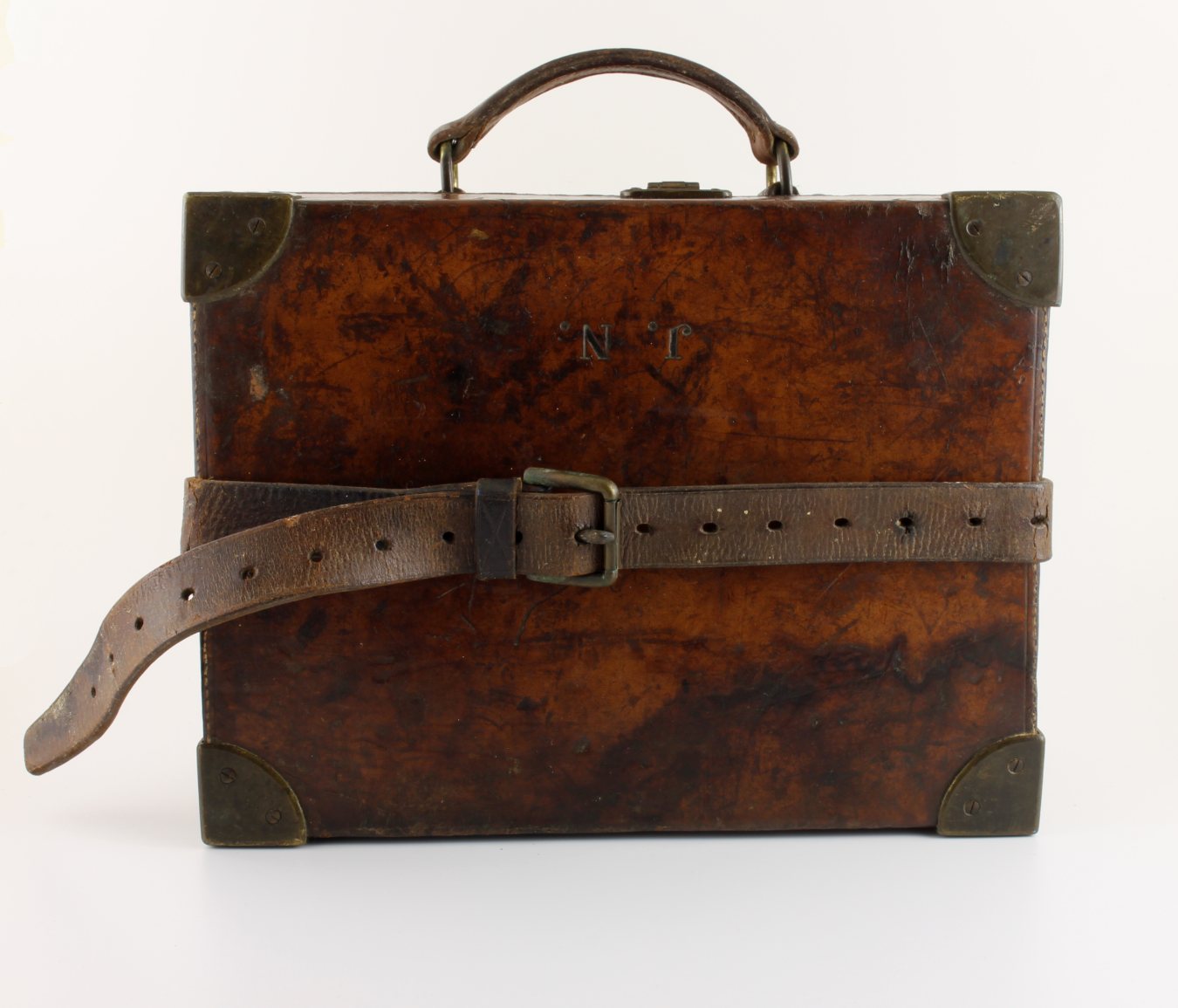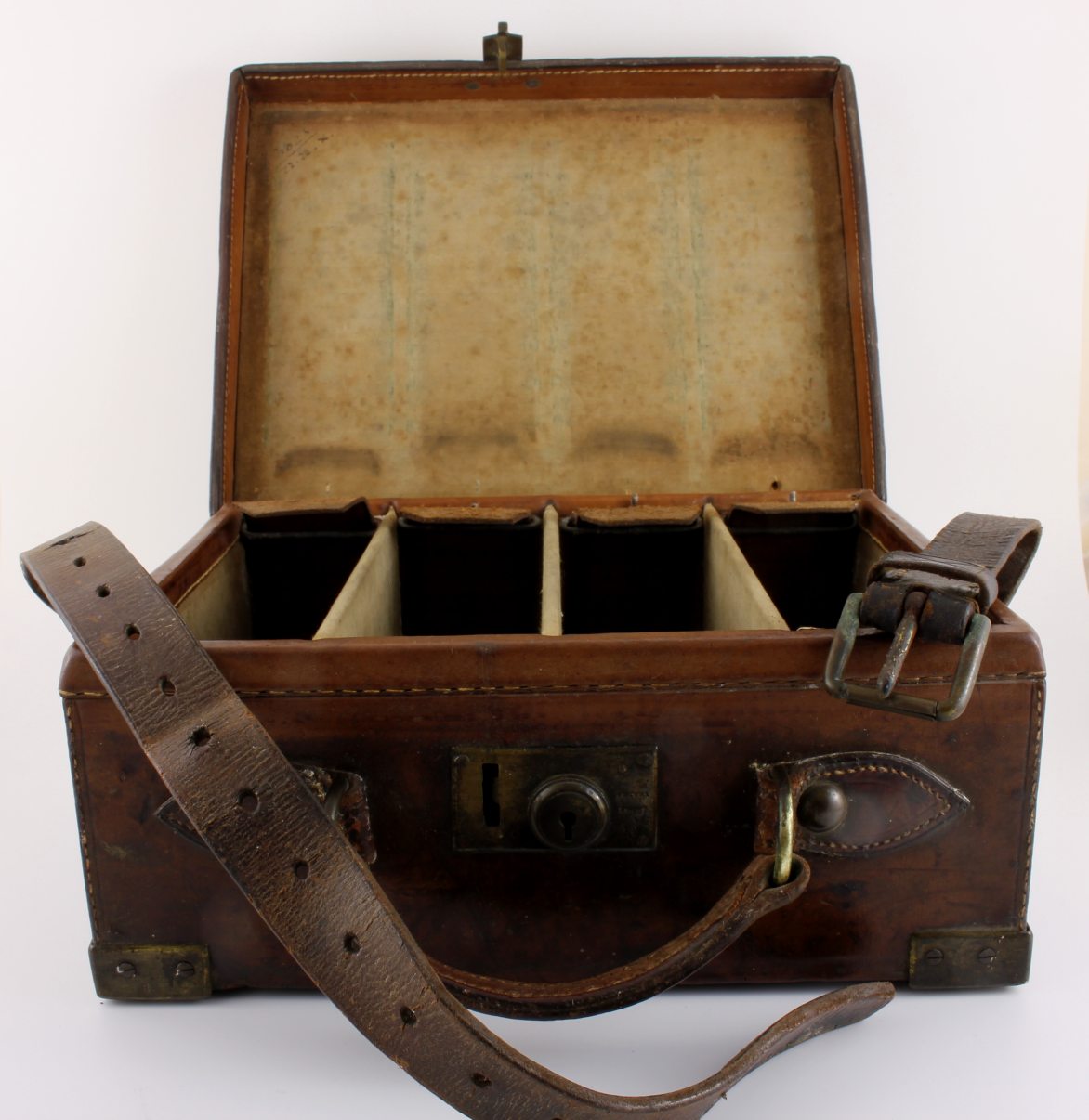 Condition: Excellent used antique condition with a wonderful patina and warm rich colour. Age related wear with scuffs and scrapes. The case is very sound and usable. Good stitching, strong handle and corners. Clasp works well but we do not have the key. Some cracking to the reverse fold. Please see pictures.