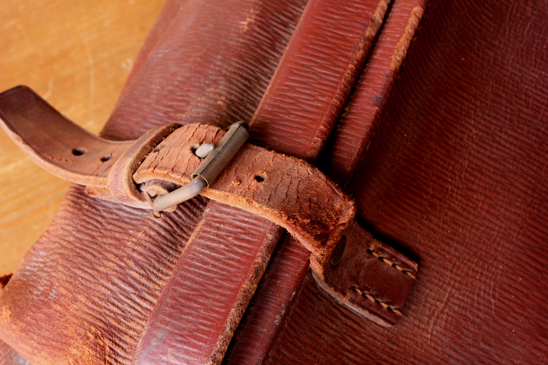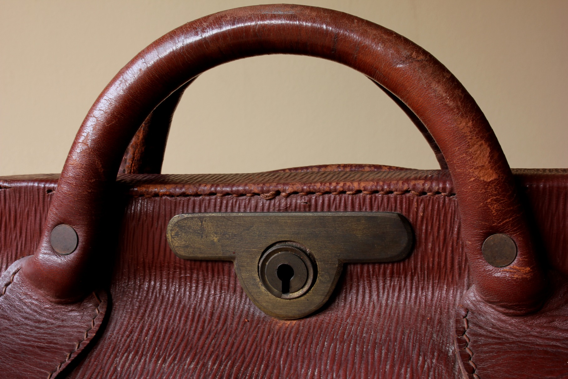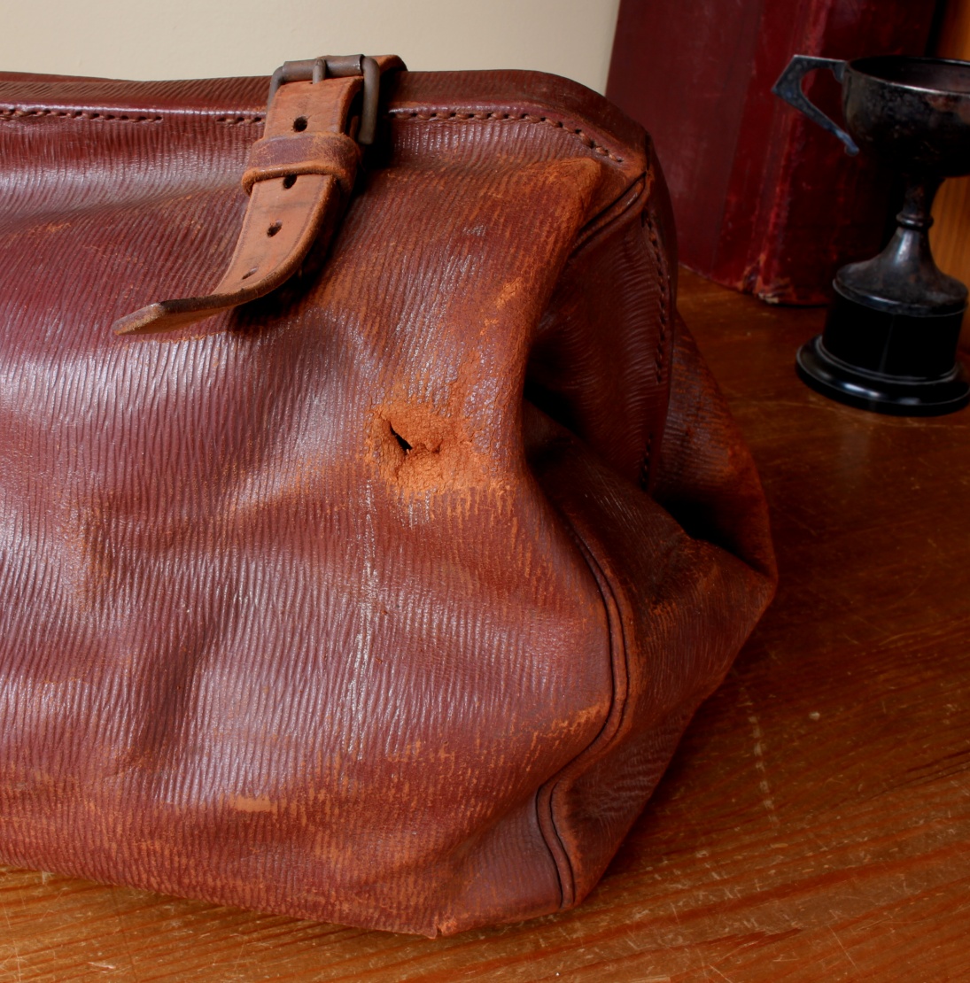 Condition: Well used vintage decorative condition with scuffs, scrapes, cracking and marks from years of use. Some holes and old repairs to leather. One strap is torn half way through. Handle is in good strong condition. Lining is stained. There is no key for the lock but the bag stays shut with the straps. Please see pictures.