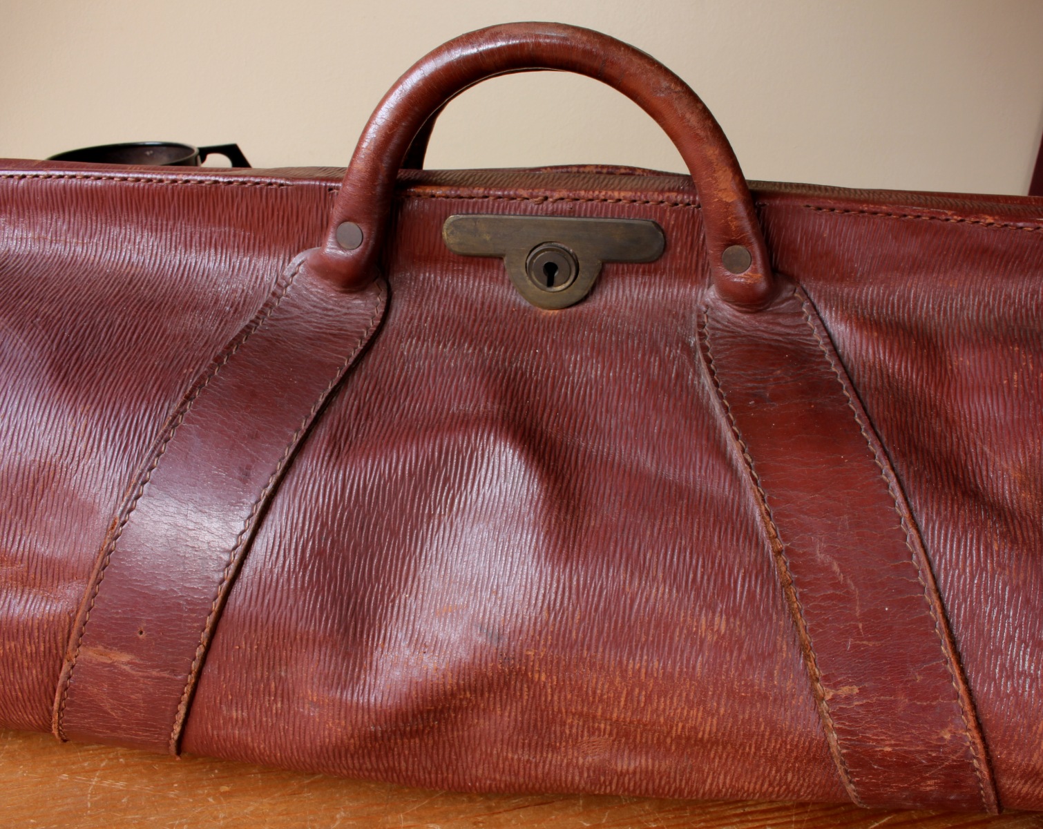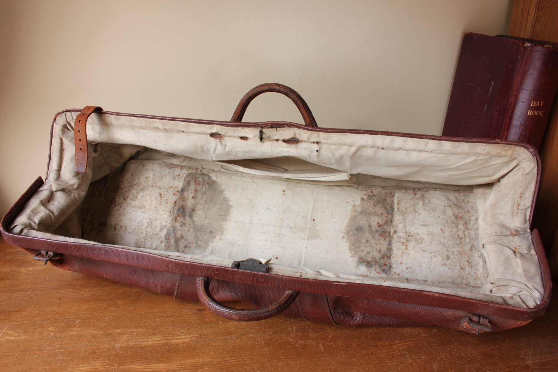 This antique / vintage long cricket bag is made of dark brown leather which has developed a nice aged look, has two buckled straps, carrying handle and a brass lock.