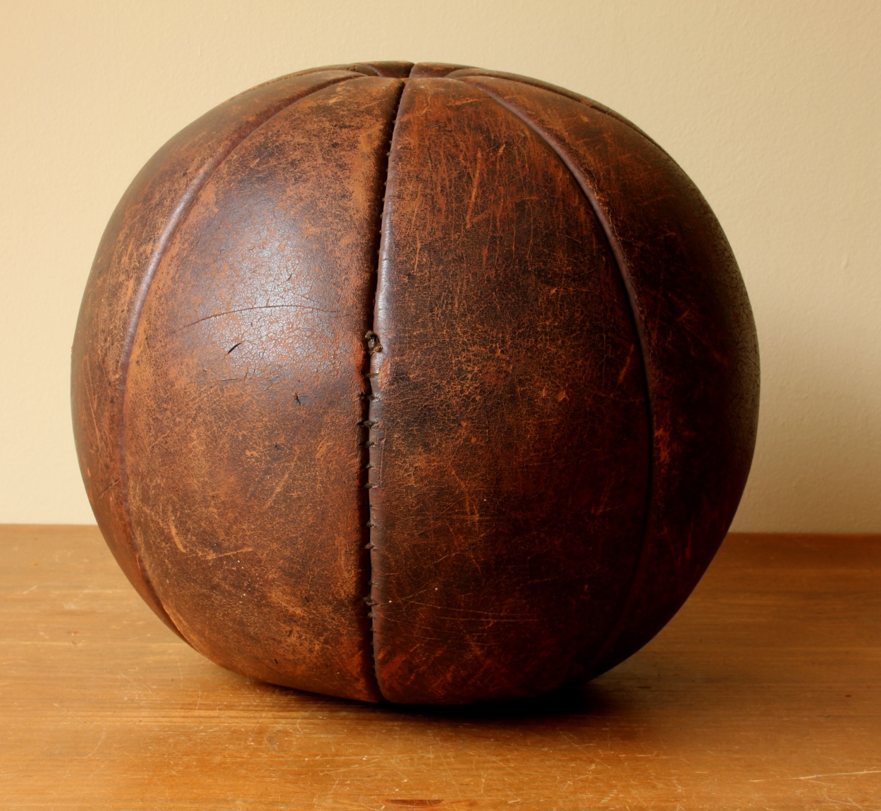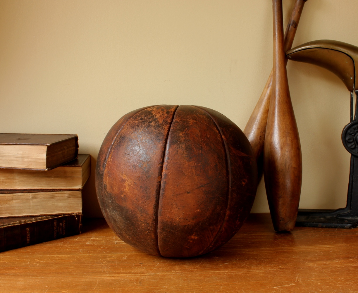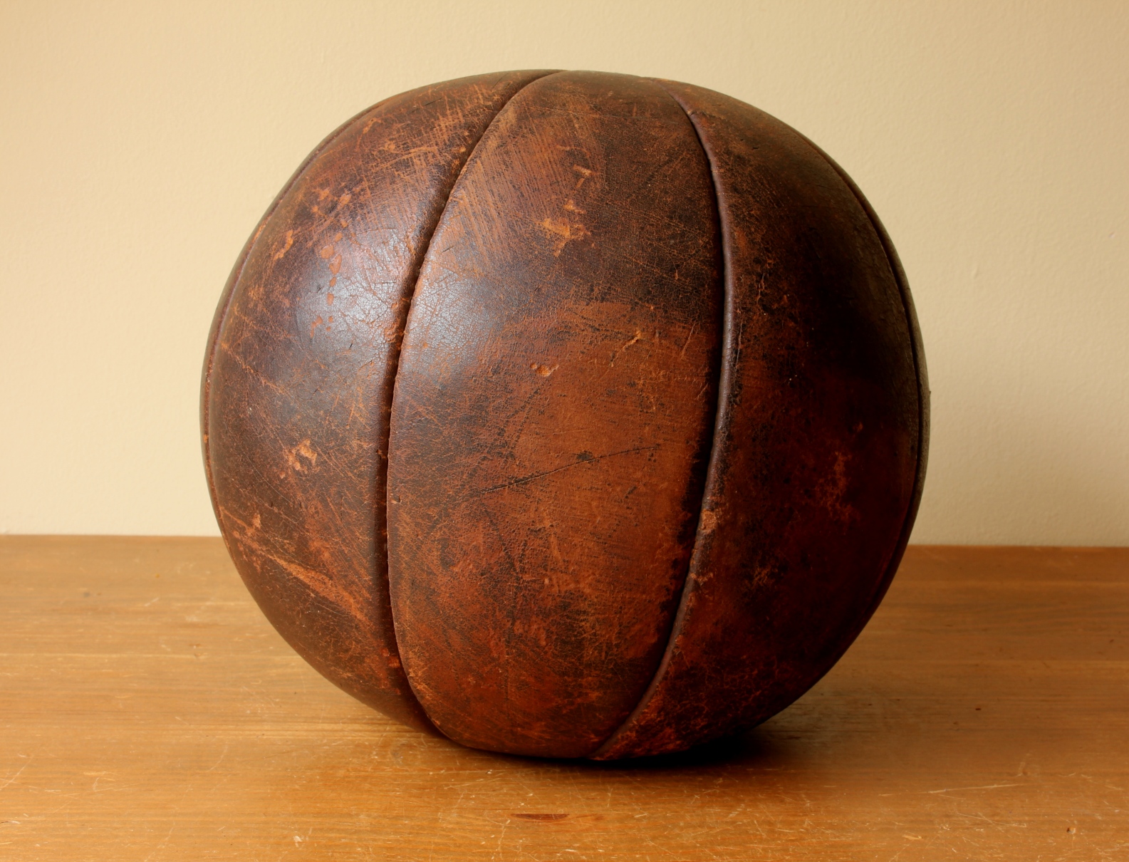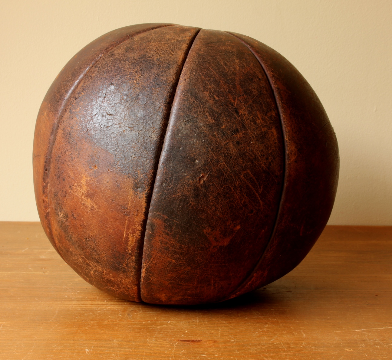 This stylish antique medicine ball is made of brown leather, is a good heavy weight and looks great with lots of wear and patina to the leather.
