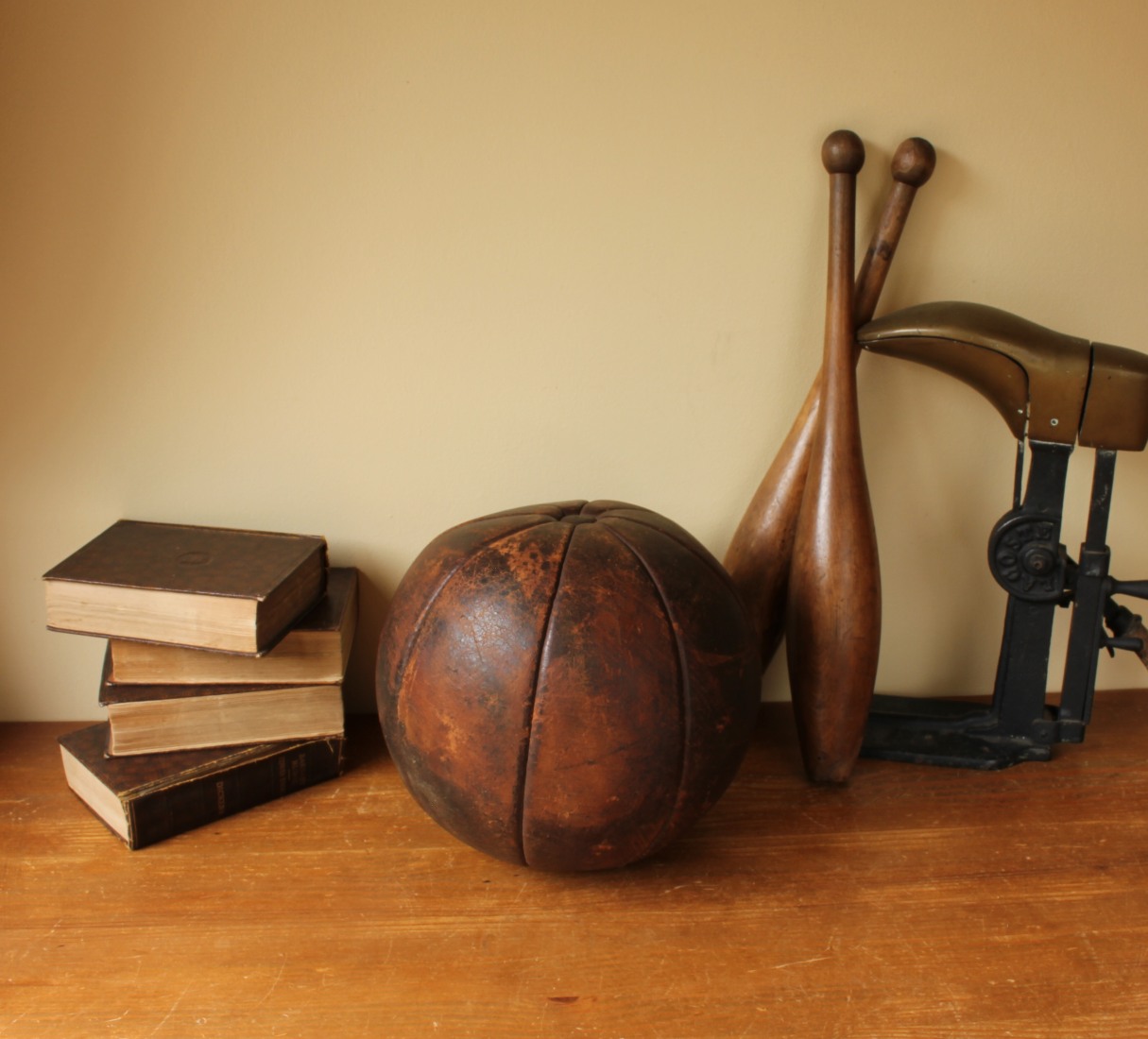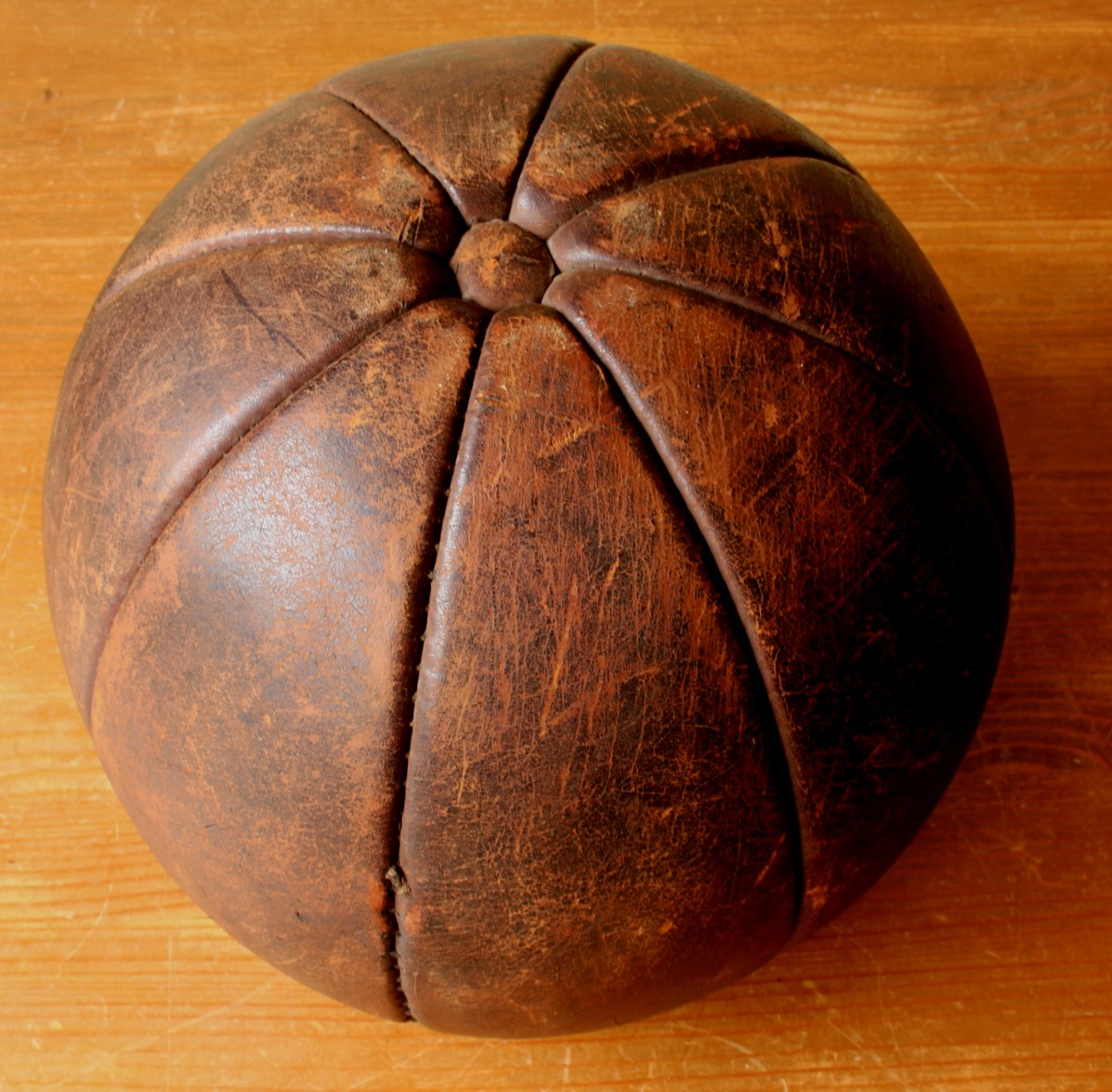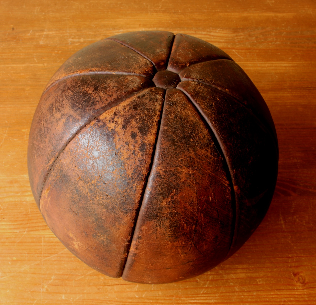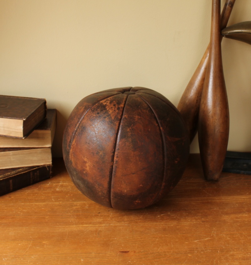This stylish antique medicine ball is made of brown leather, is a good heavy weight and looks great with lots of wear and patina to the leather.