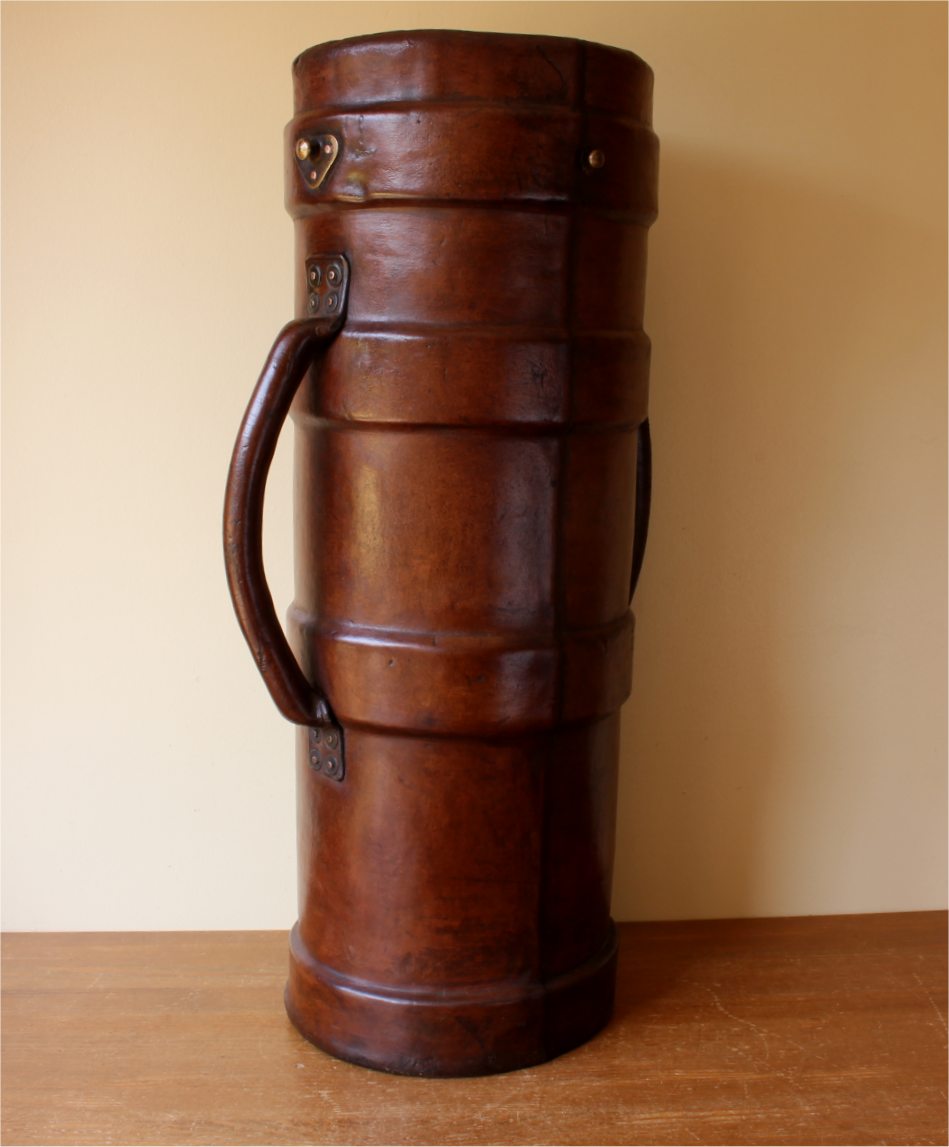 This handsome antique cordite carrier stick stand which dates from the early 20th century is made of cork, lined in canvas and has a leather outer.
