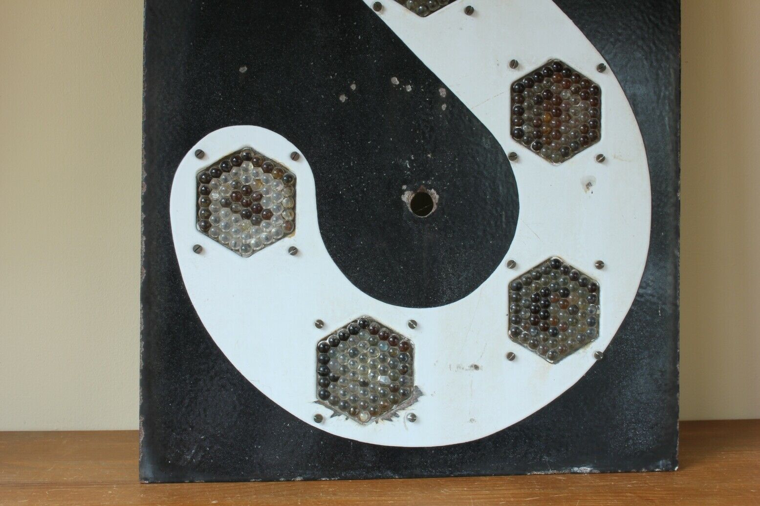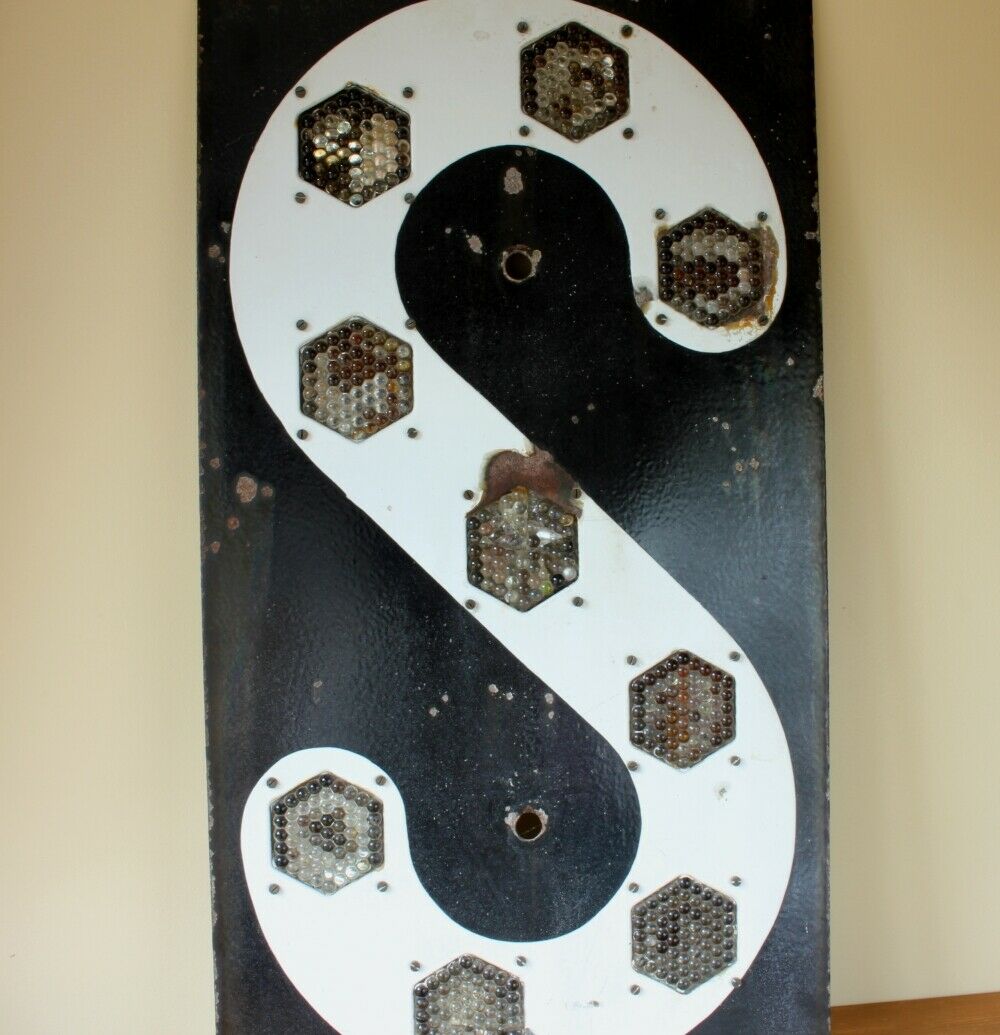 This original vintage French enamel metal sign which has a black background and a large white letter 'S' with 9 fitted reflectors dates from the mid 20th century and is a French railway sign.