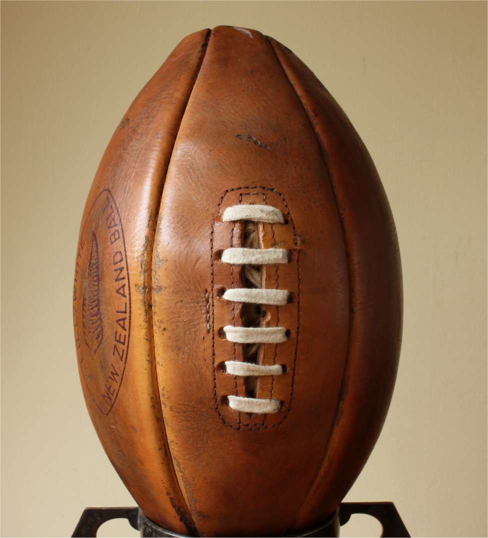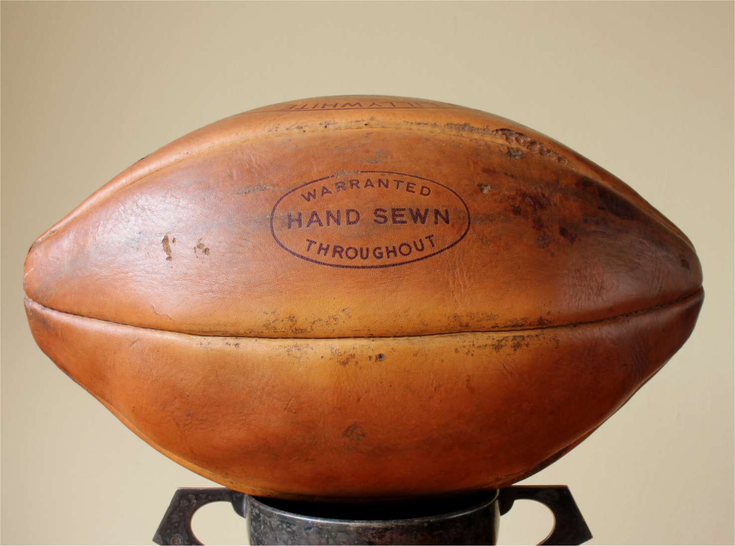 This original vintage Rugby ball which dates from c1950 has 4 hand sewn leather panels and is marked Lillywhite New Zealand Ball. Warranted Hand Sewn Throughout.