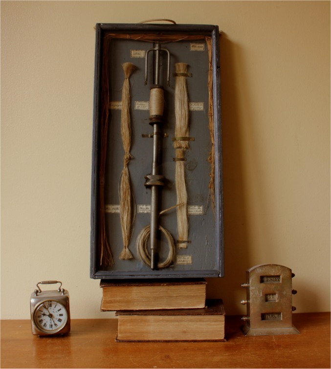 This interesting vintage display piece has a deep wooden painted framed box, glazed front and French paper labels explaining each step of the manufacturing process.
