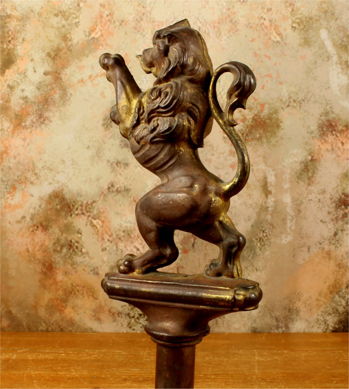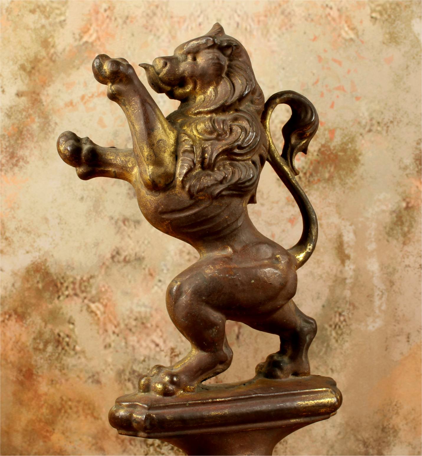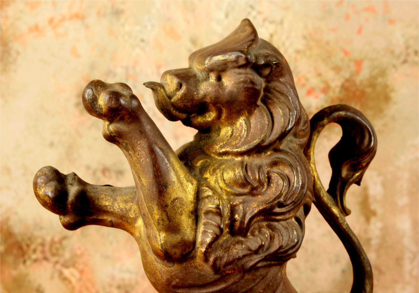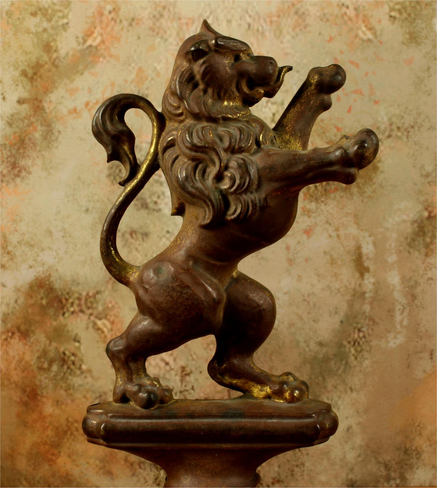 This brass lion figure which is stood on it's two back legs has a flowing mane, long curled tail, has a banner hanging hook and has a nice aged patina with remains of it's original gold gilding.