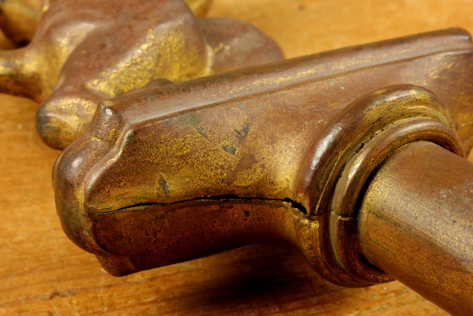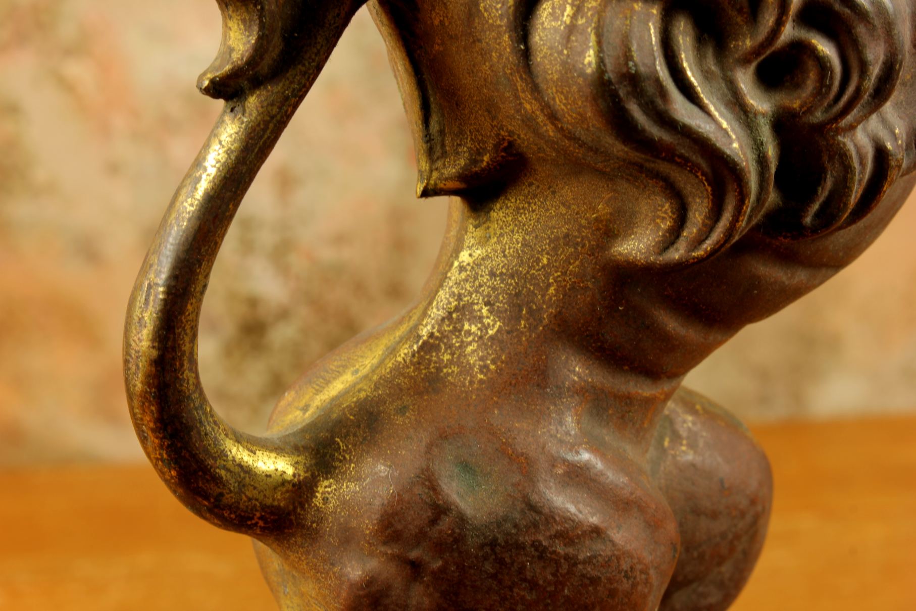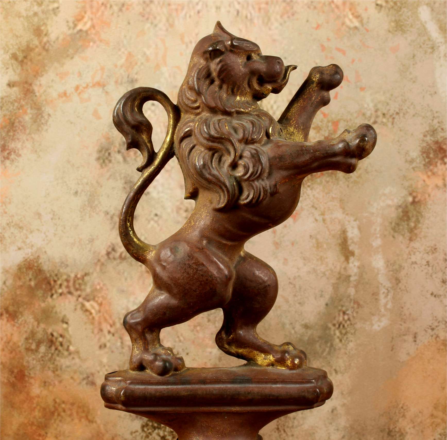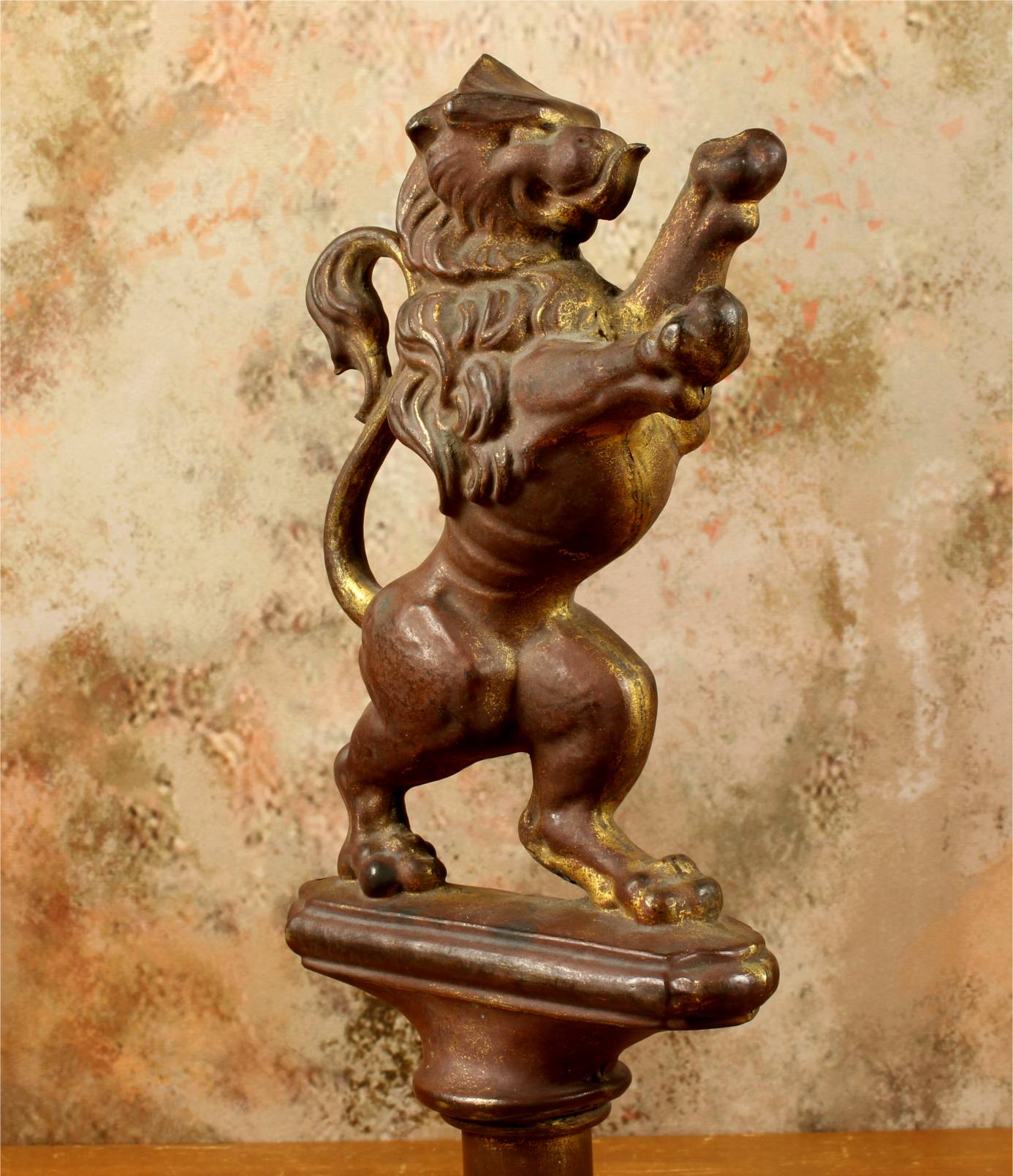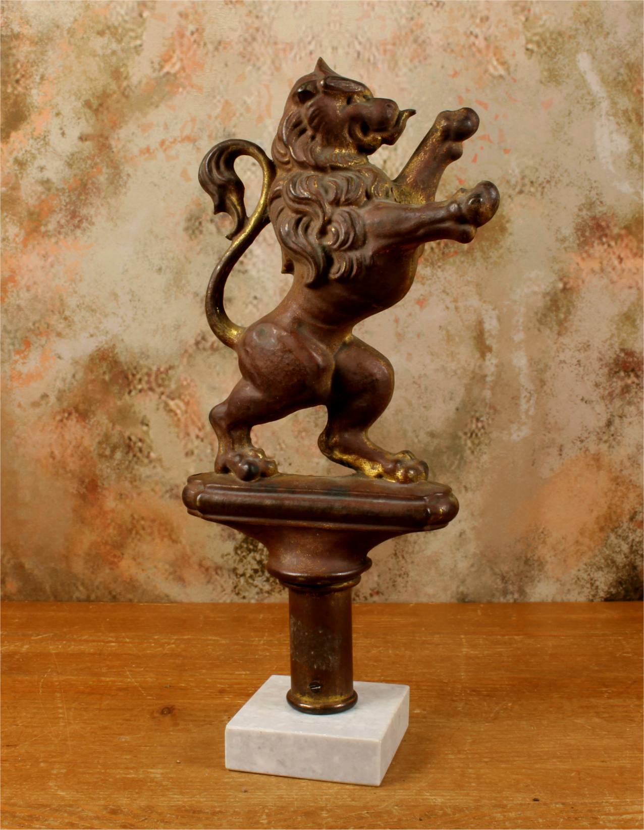 This brass lion figure which is stood on it's two back legs has a flowing mane, long curled tail, has a banner hanging hook and has a nice aged patina with remains of it's original gold gilding.