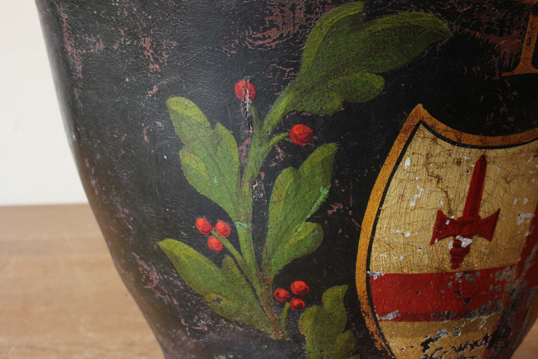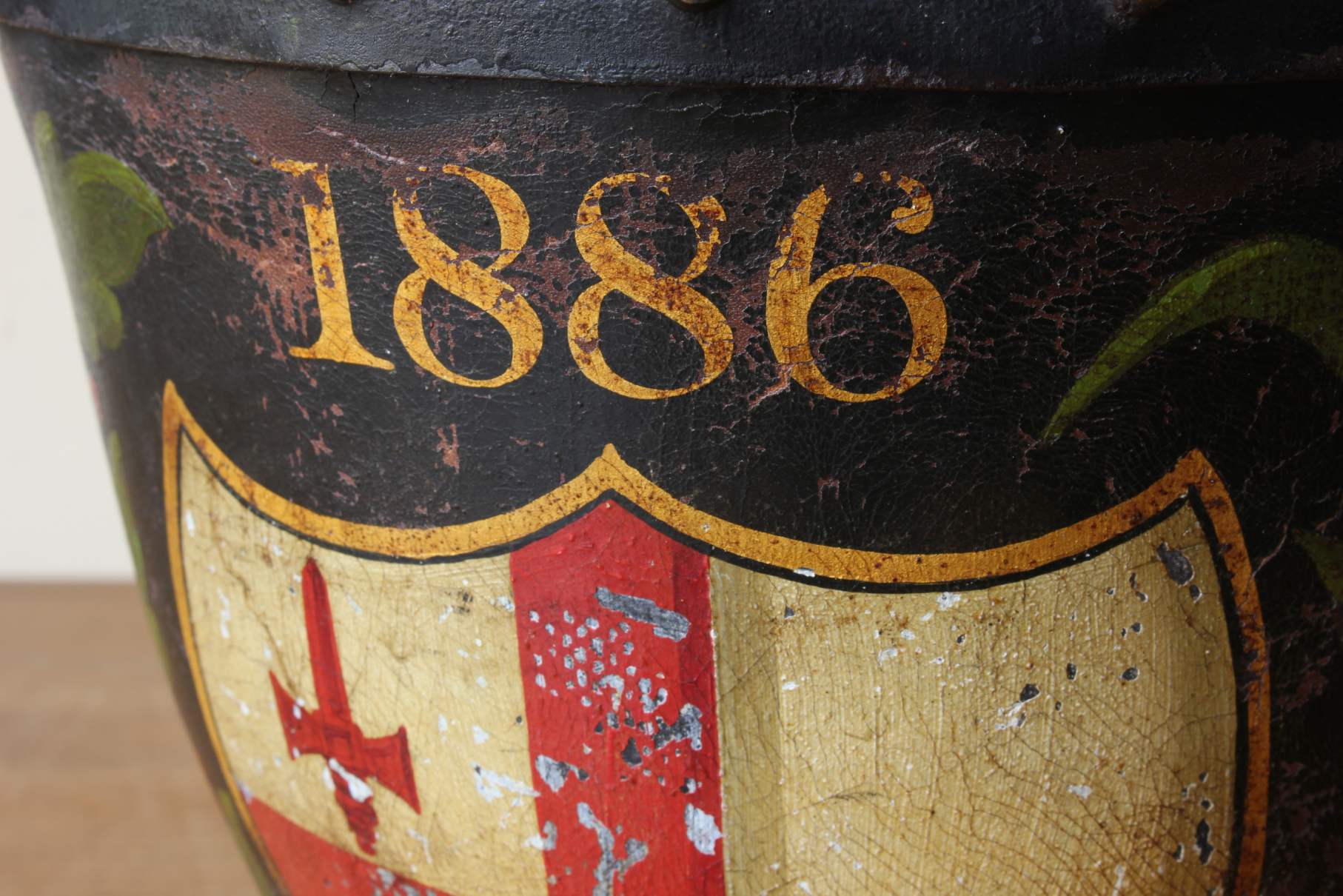 This handsome antique fire bucket which was skillfully made from high quality thick leather dates from 1886 and is beautifully decorated with the coat of arms for the City of London and the date of 1886 to the front.
