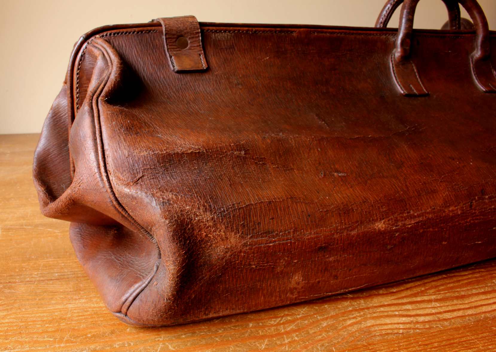 This antique long cricket bag which dates from the early 20th century is made of brown leather which has developed a nice aged look. The bag has carrying handles, two sturdy buckled straps and a secure lever brass lock.