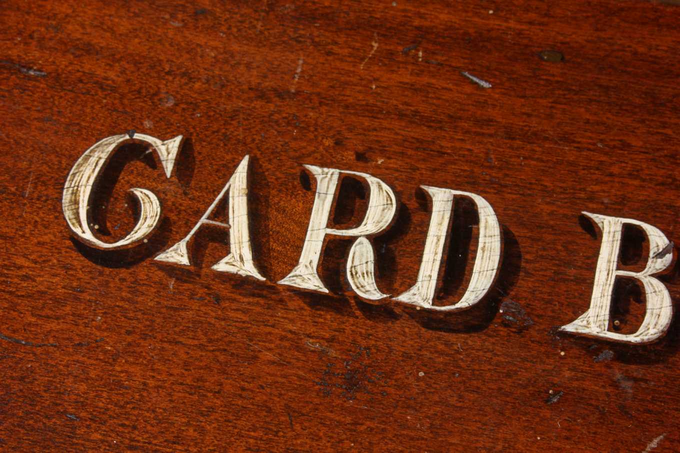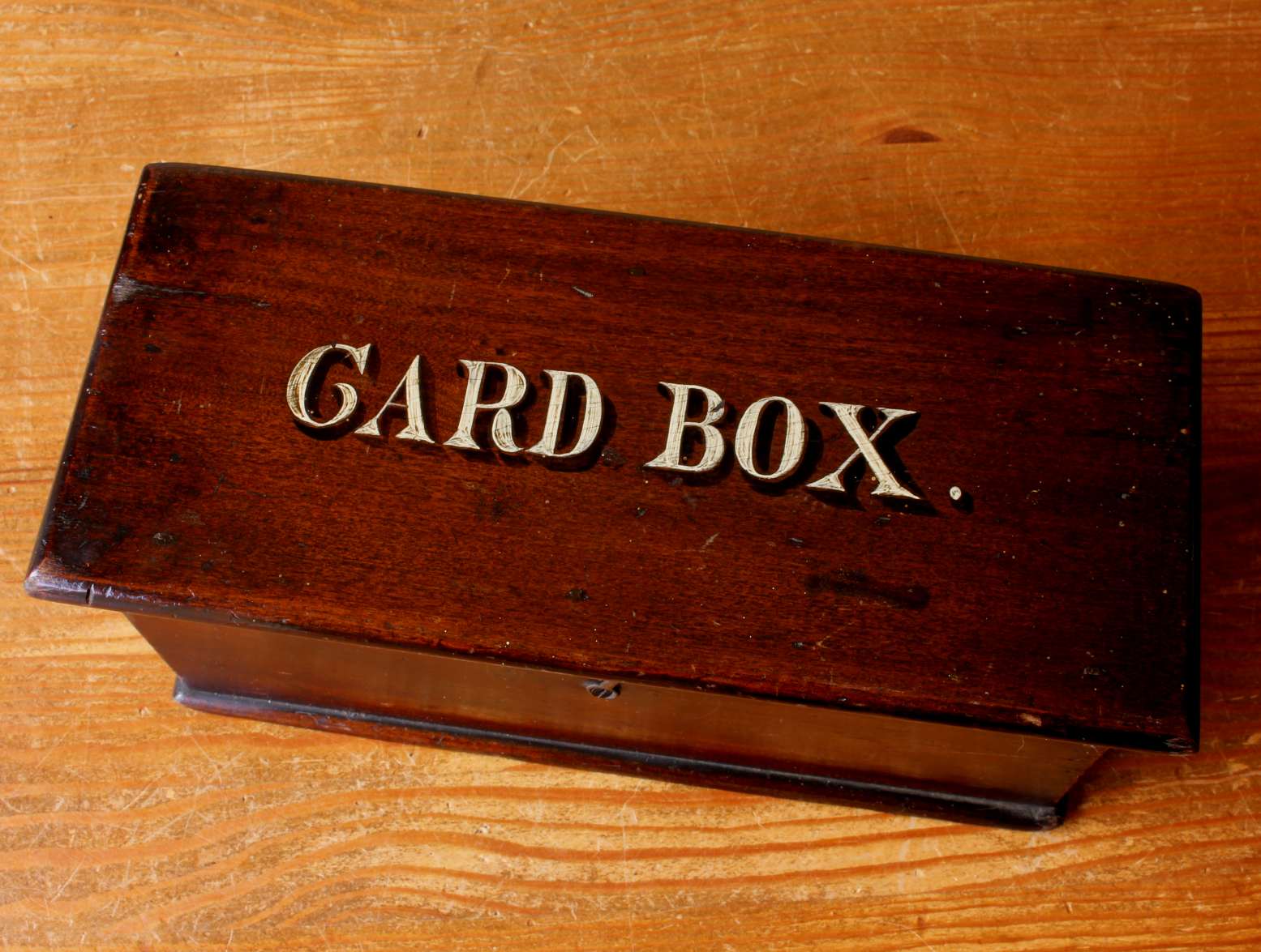 This handsome wooden playing card box that dates from the late 19th century is made of mahogany and has a charming painted decoration to the top which reads Card Box.